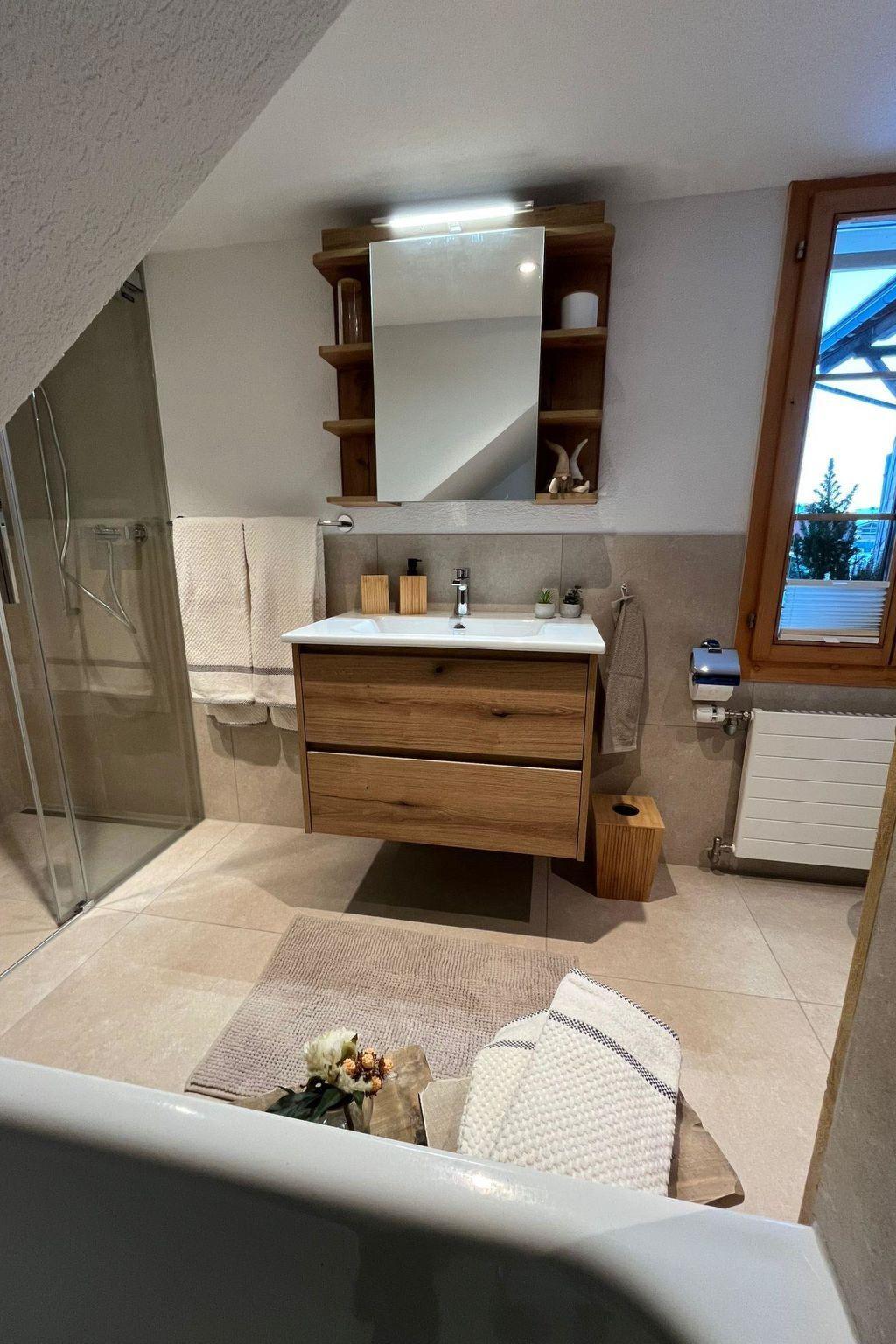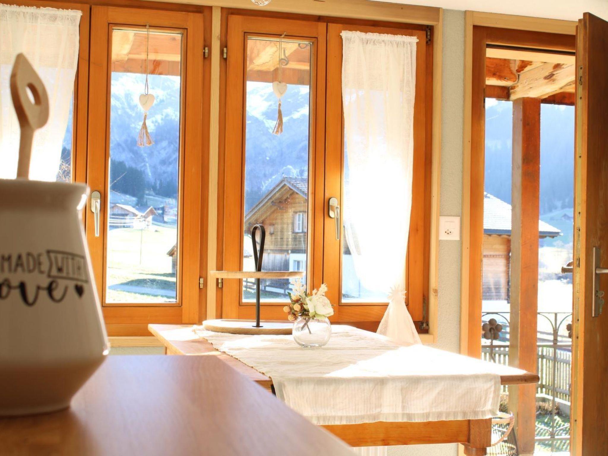 65 m2. More information by the provider: This renovated 2.5-room apartment on the first floor of a two-family house offers a lot of comfort on 65m². You can enjoy the mountain view from the covered terrace. The kitchen is equipped with an oven, dishwasher and Nespresso machine. In the living room you will find a sitting area, stove, TV, radio. WLAN available. The bedroom has a double bed and the bathroom has a bath, shower and WC. Practical: The bus stop in front of the house takes you to the ski slope on the Chuenisbärgli in just 2 minutes and to the center of Adelboden in 10 minutes. Behind the house is the Boden cross-country ski trail.