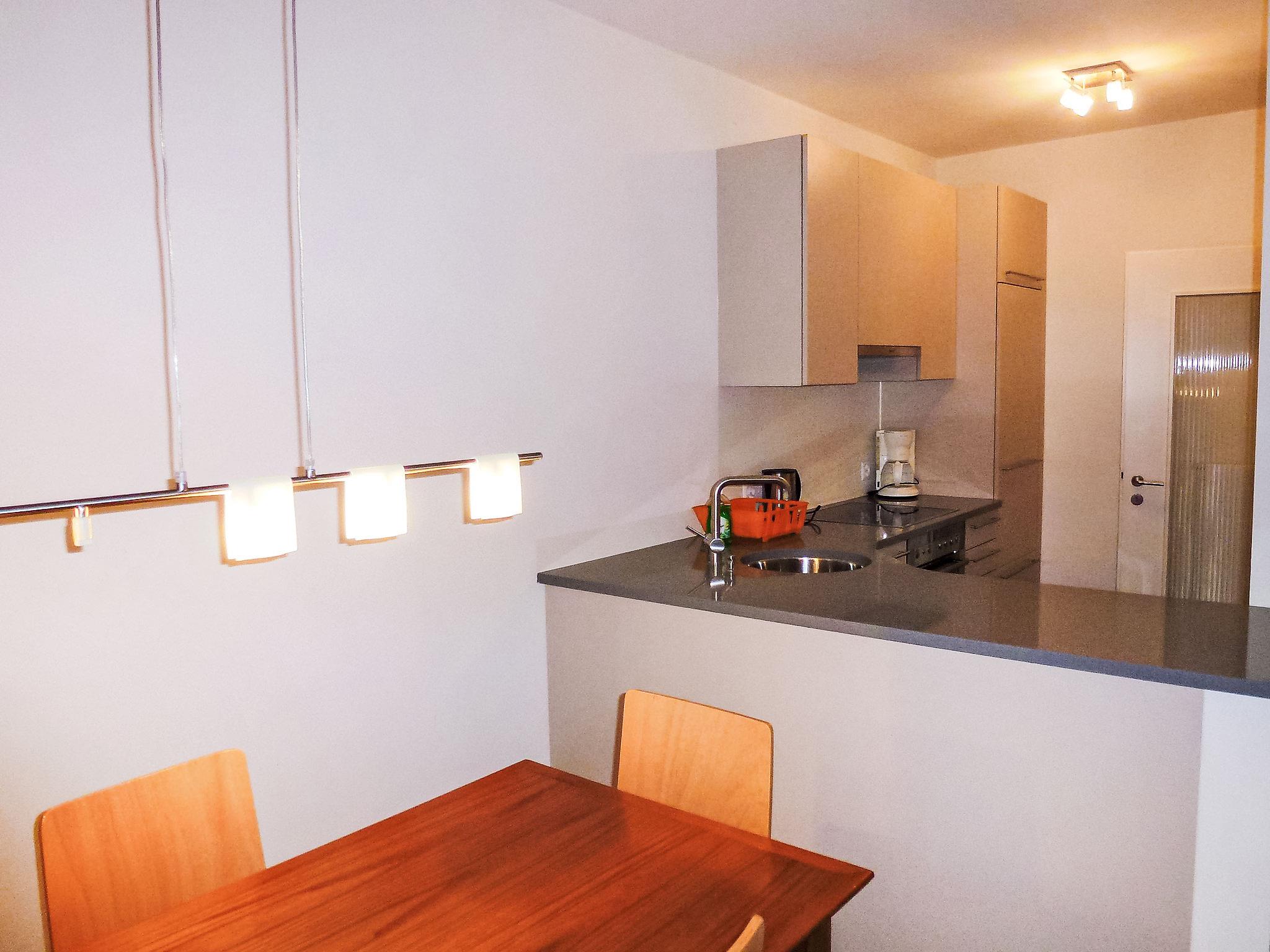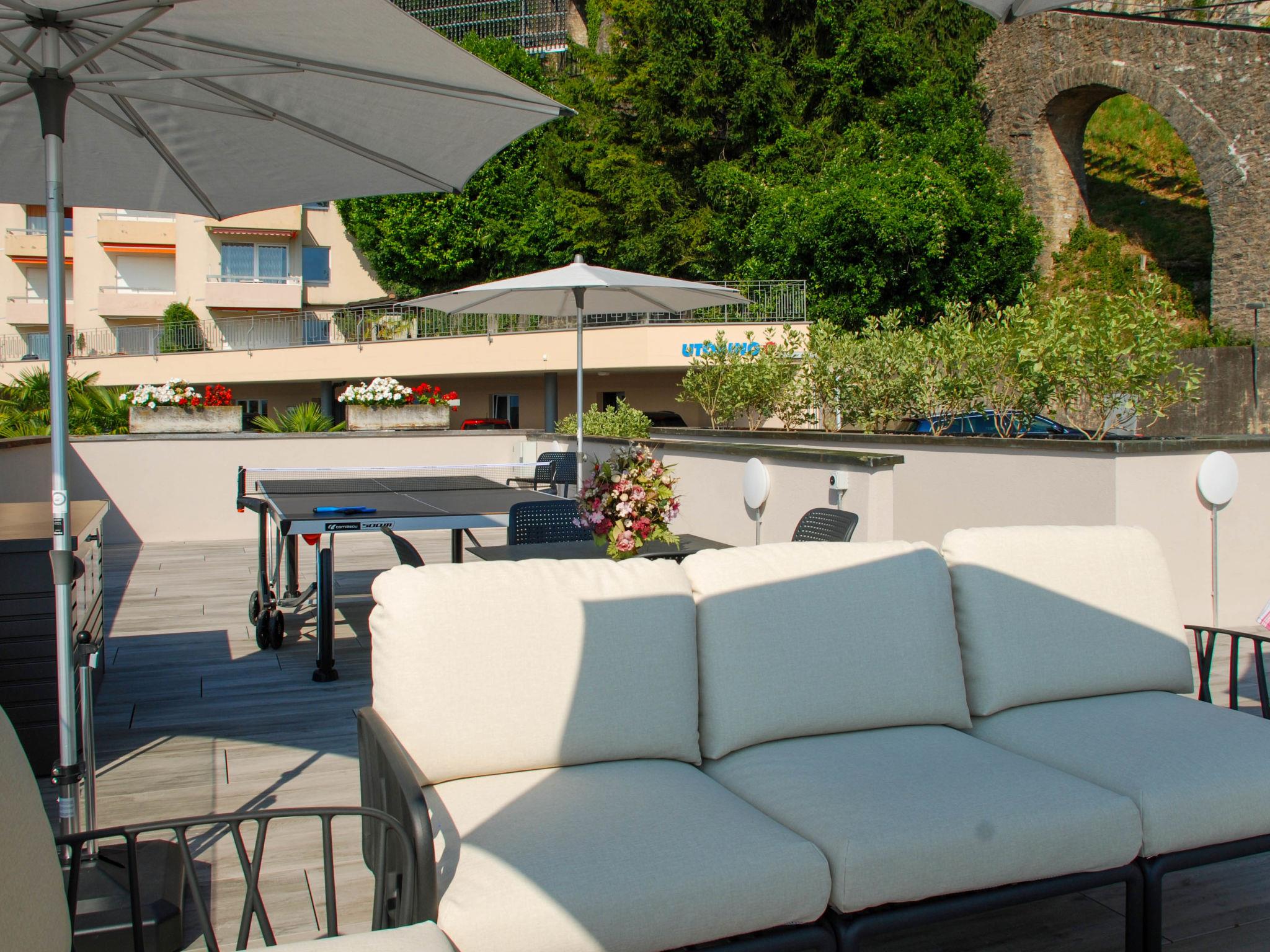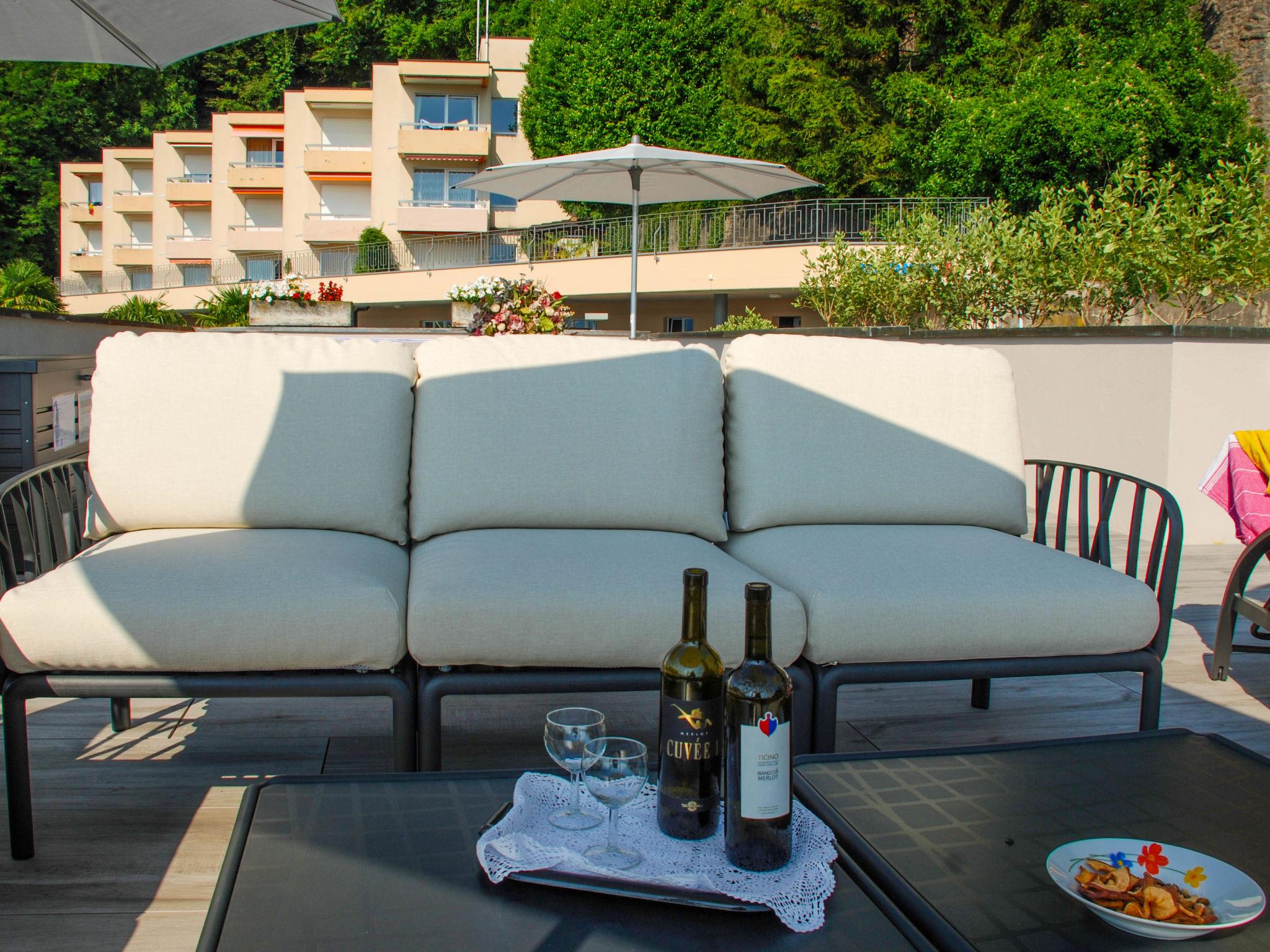 "Residenza Monte Bré - Apt.105 Haus1", 3-room apartment 61 m2, on the ground floor. Beautiful and tasteful furnishings: living/dining room with 2 sofabeds, dining table and cable TV. Exit to the balcony. 1 double bedroom. 1 room with 2 beds. Open kitchen (4 hot plates, oven, dishwasher). Shower/WC. Balcony, south facing position and west facing position, patio. Terrace furniture. Partial view of the mountains. NL-00007662