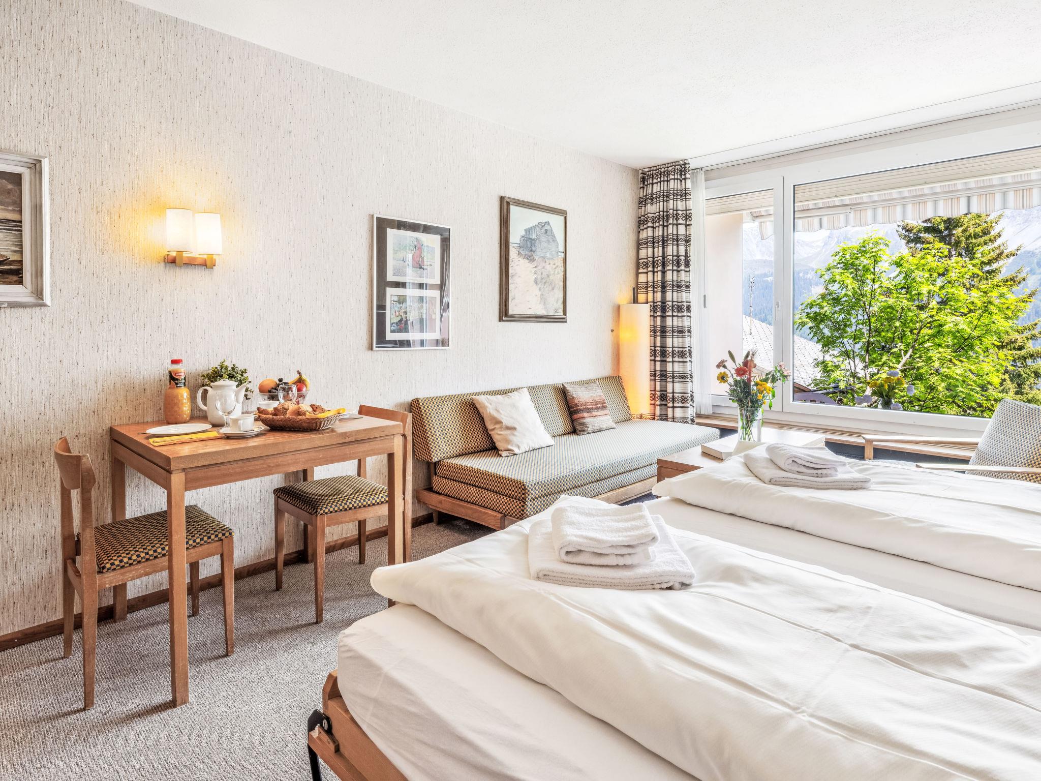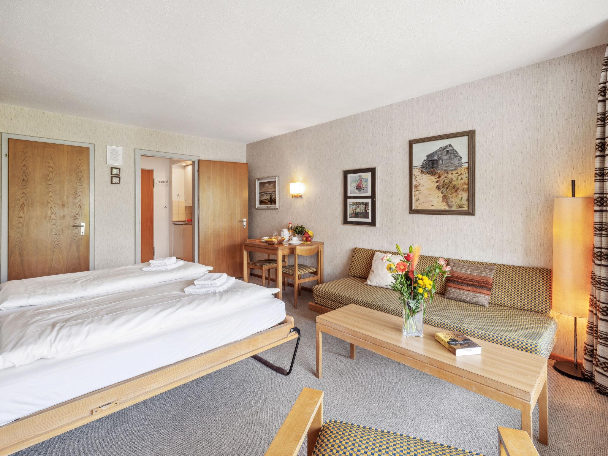 "Promenade Apt 003", 1-room apartment 28 m2, on the ground floor. Cosy furnishings: living/dining room with 2 fold-away beds, satellite TV and radio. Exit to the patio. Kitchenette (3 hot plates, oven). Hip bath/WC. Patio, east facing position. Beautiful view of the mountains, the countryside and the resort. Facilities: Internet (WiFi, free). Please note: non-smokers only.