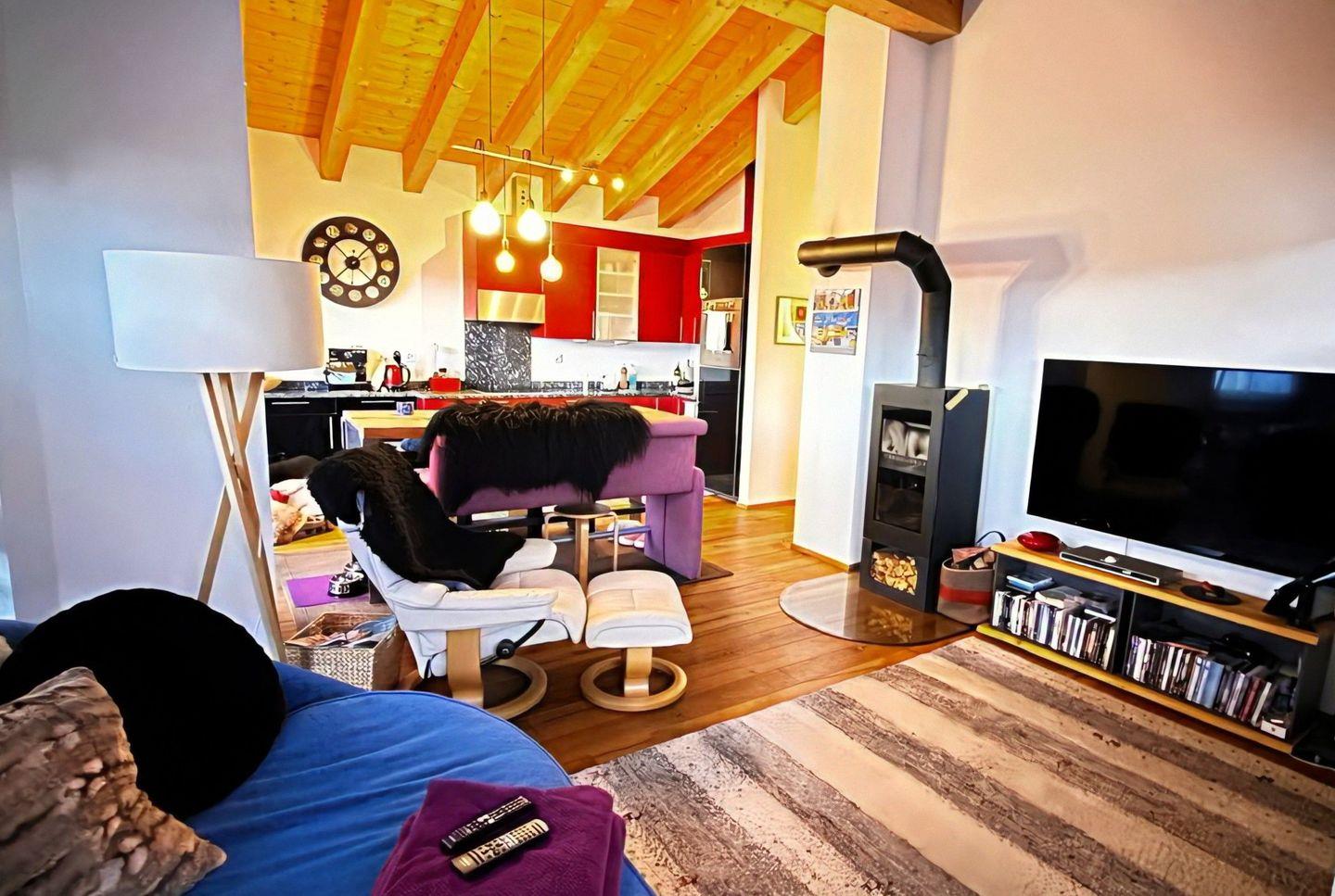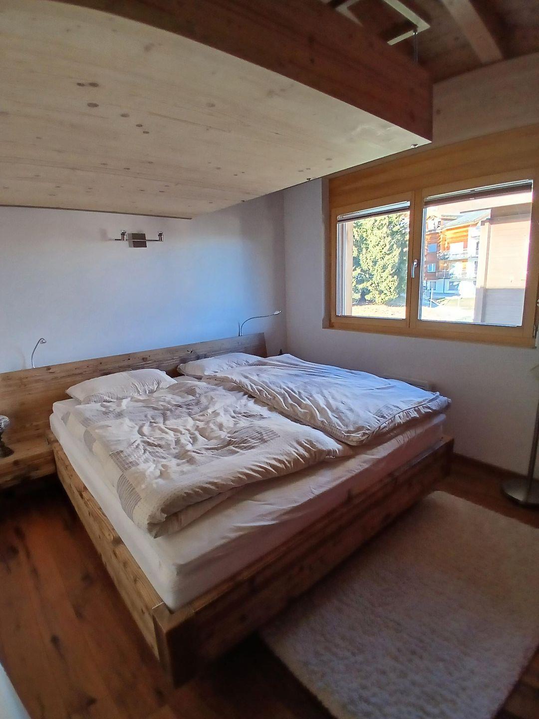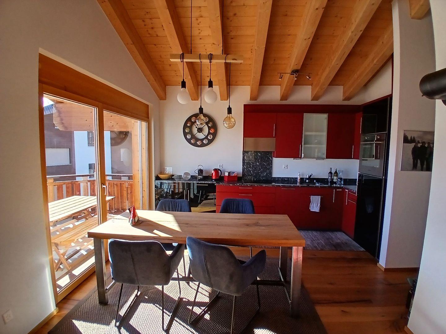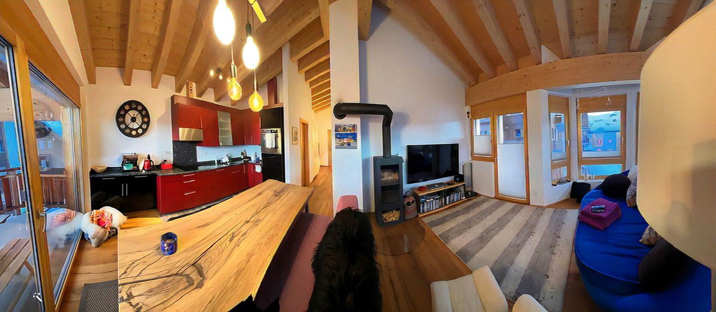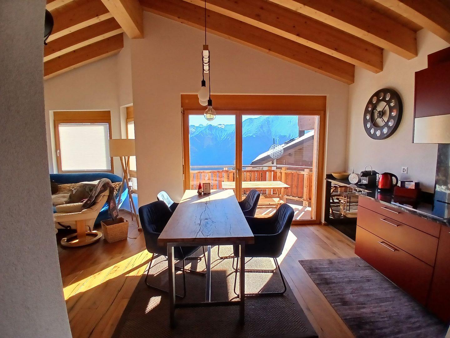 Die Wohnung hat einen hohen Ausbaustandart und ist im Dachgeschoss des Hauses. Sie unterteilt sich in 2 Schlafzimmer für je 2 Personen, 1 Badezimmer mit Dusche, WC und Lavabo. Garderobe, Wohn/Esszimmer mit offener Küche und Schwedenofen. Der gebaute Erker gibt dem Wohnzimmer eine spezielle Note. Die 2 Balkone (Südbalkon mit viel Sonne, Ostbalkon für die Morgensonne) geben eine herrliche Aussicht auf die Bergwelt.