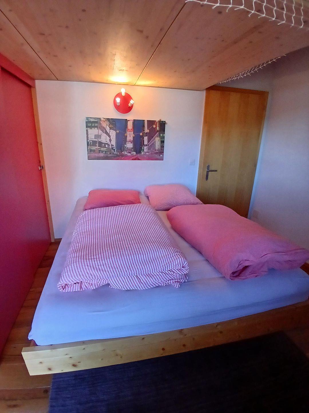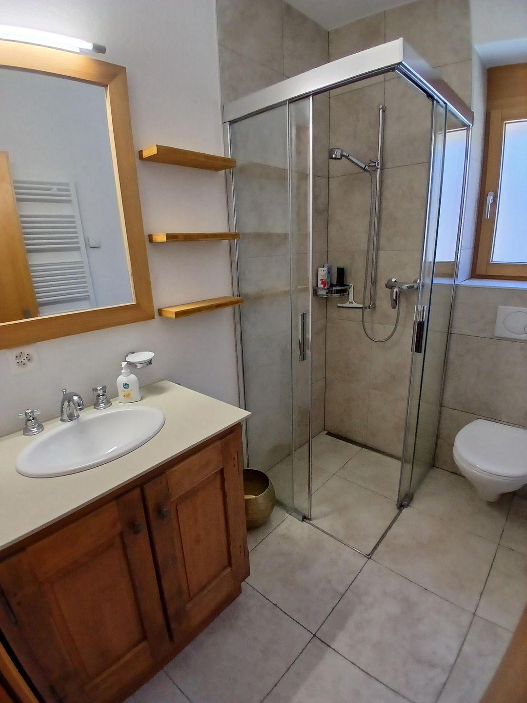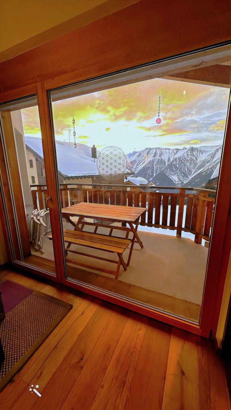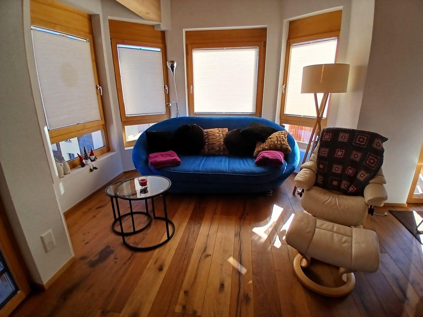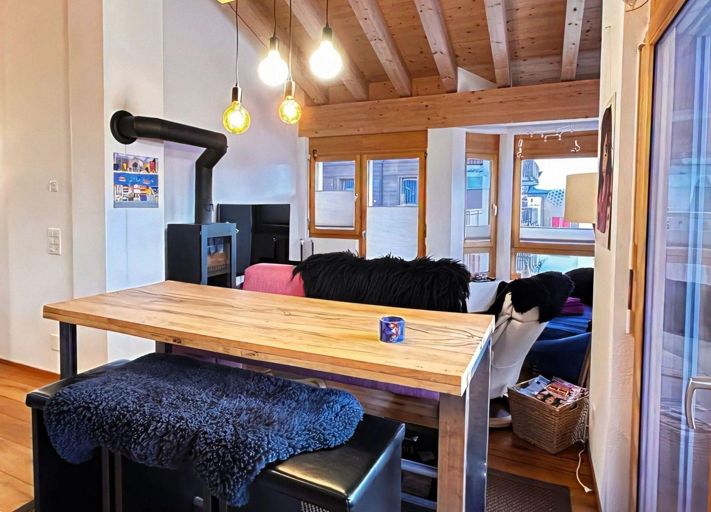 Die Wohnung hat einen hohen Ausbaustandart und ist im Dachgeschoss des Hauses. Sie unterteilt sich in 2 Schlafzimmer für je 2 Personen, 1 Badezimmer mit Dusche, WC und Lavabo. Garderobe, Wohn/Esszimmer mit offener Küche und Schwedenofen. Der gebaute Erker gibt dem Wohnzimmer eine spezielle Note. Die 2 Balkone (Südbalkon mit viel Sonne, Ostbalkon für die Morgensonne) geben eine herrliche Aussicht auf die Bergwelt.