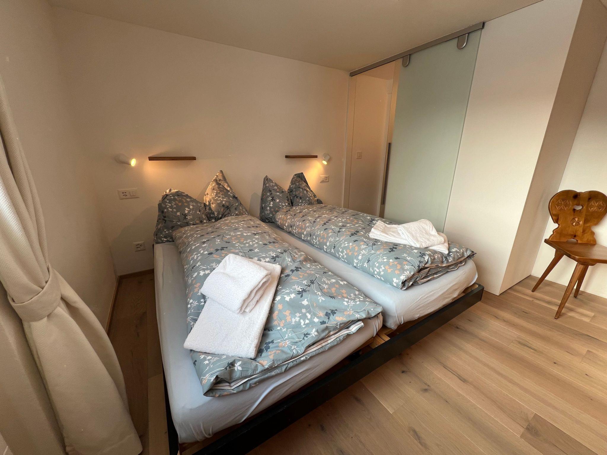 Inside, the flat offers an open, fully equipped kitchen with oven, fridge, Nespresso coffee machine, kettle, fondue and raclette set, toaster, which leaves nothing to be desired for culinary flights of fancy. The cosy living room is furnished with a sofa, dining table and TV, while the two bedrooms each have two single beds. The bathroom has a toilet, bathtub, shelf for towels, a washbasin with mirror and a hairdryer.