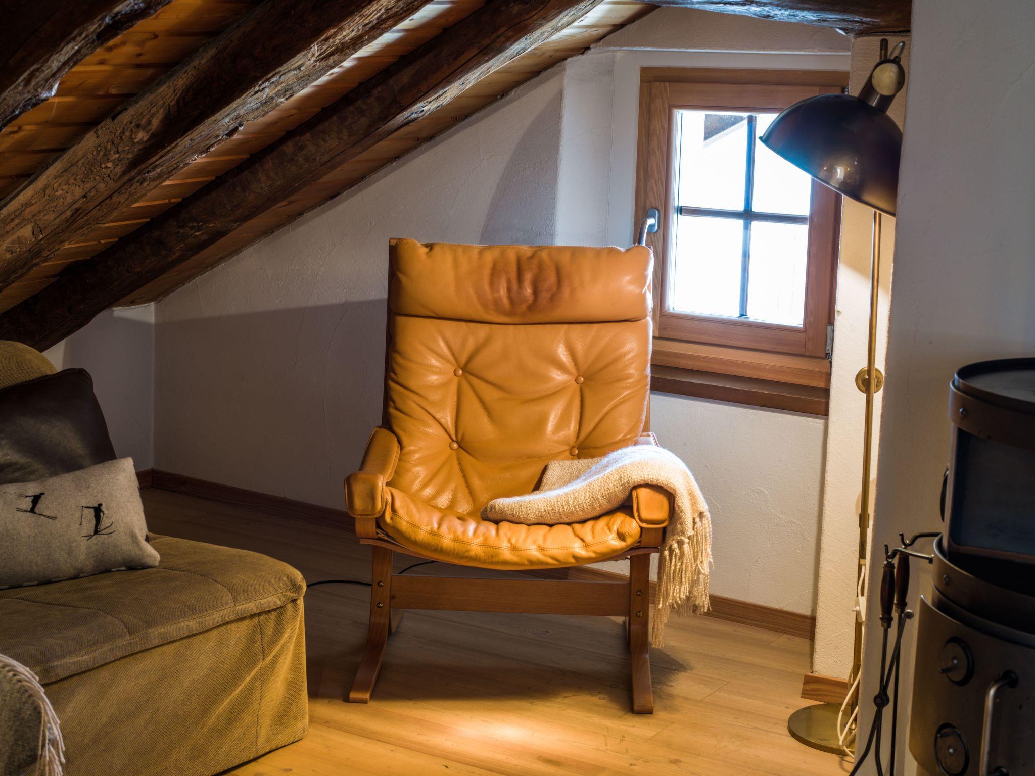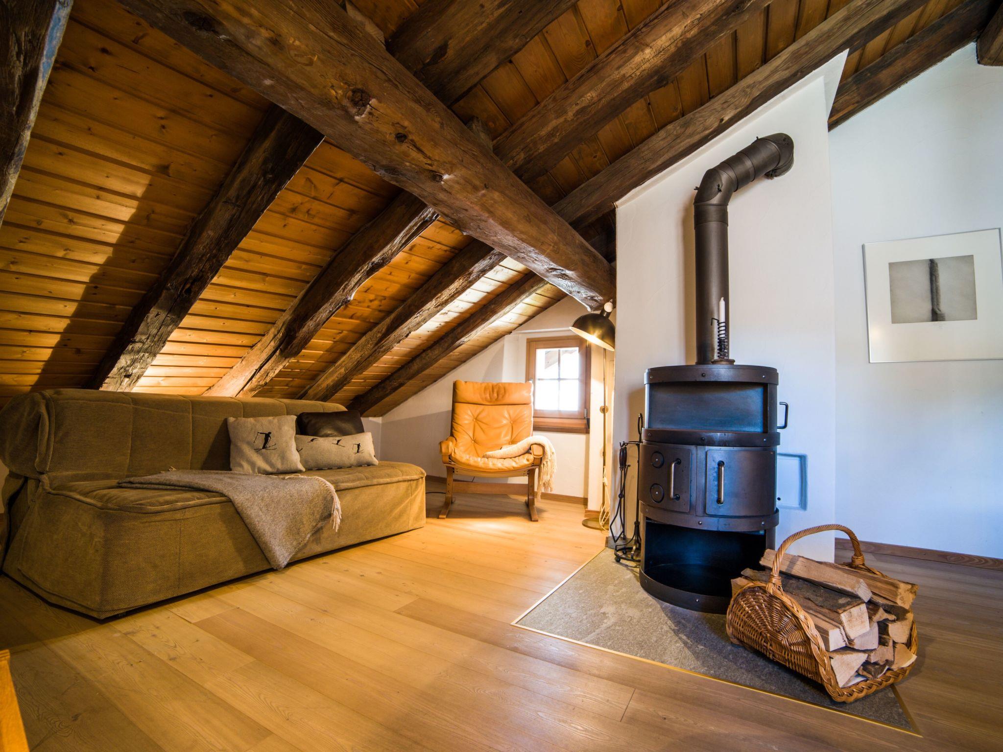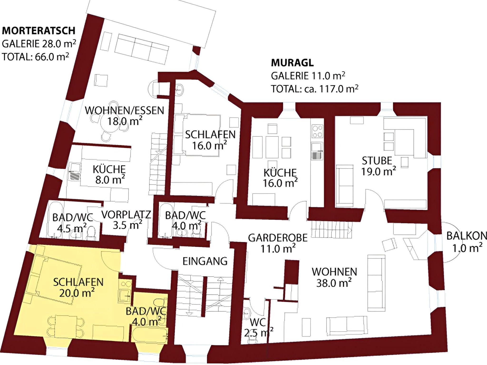 The Morteratsch flat enchants with its open-plan living and dining area, a fully equipped kitchen including a large fridge, oven, dishwasher and Nespresso machine, as well as a cosy Swedish stove. A staircase leads to the spacious gallery, which creates a particularly warm atmosphere with its 4 beds and wooden panelling. Two bathrooms - one with bath/shower, the other with shower/WC - emphasise the living comfort. The stylish Studio Grisch, adjacent to the roof maisonette, enriches the offer with its separate bedroom with two beds, a cupboard kitchen, Nespresso machine and its own bathroom with bath/shower and offers additional flexibility and privacy.