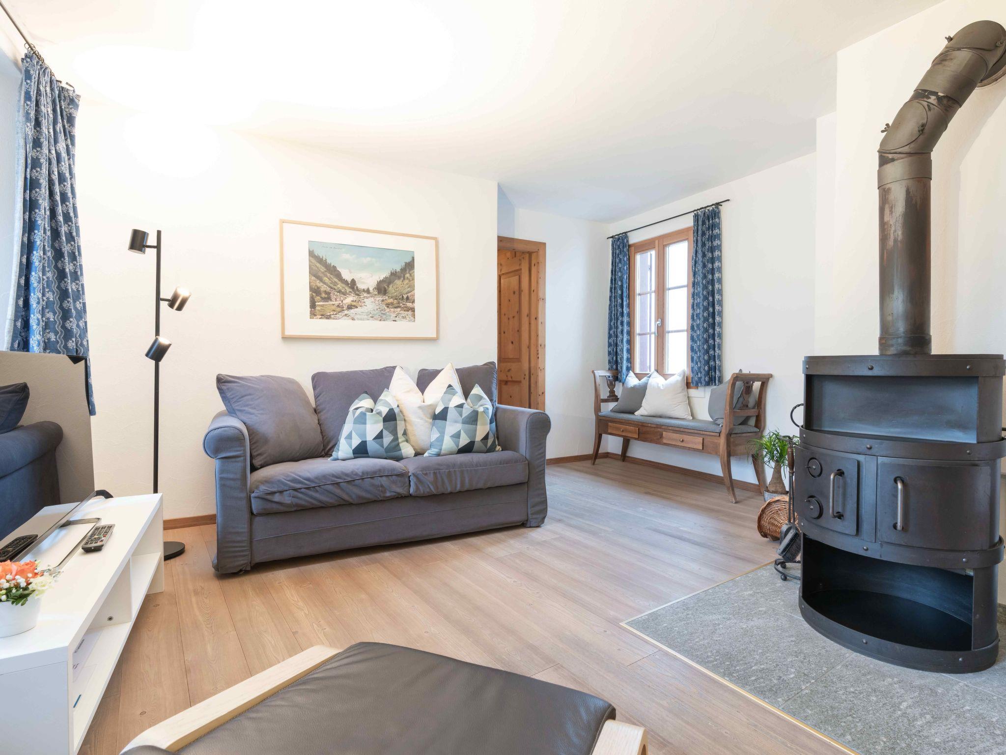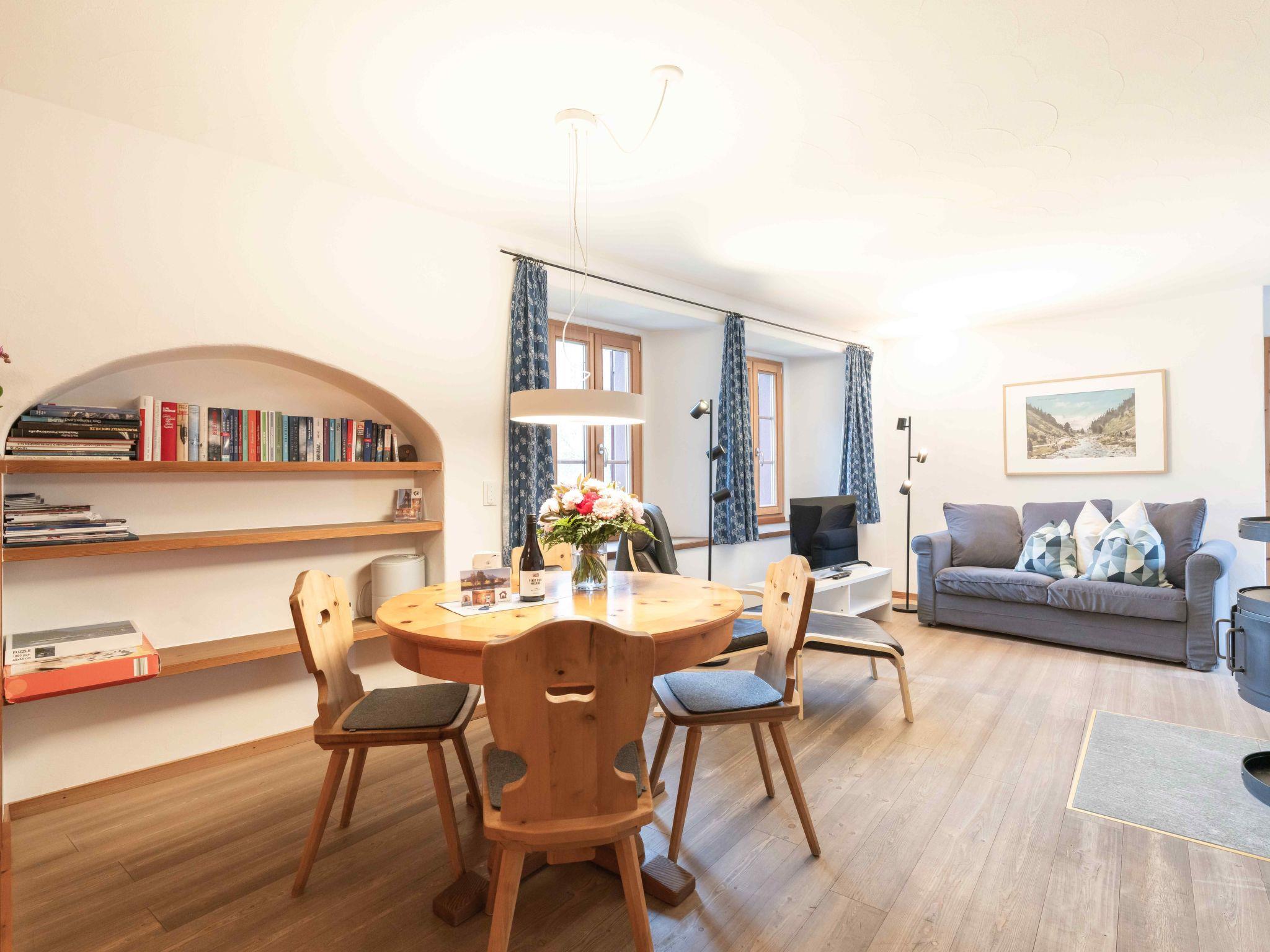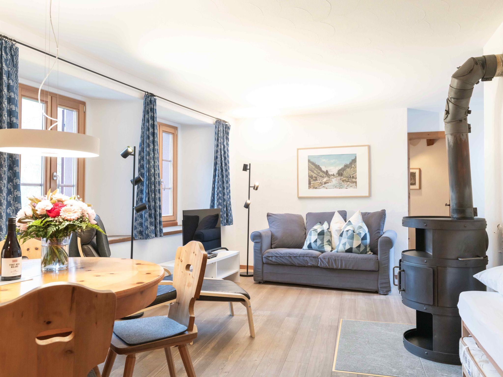 The 2 ½-room Roseg holiday flat, recommended for 2 people, can accommodate up to 4 people. At 59 m², the flat on the first floor offers a cosy atmosphere, characterised by an open-plan living/dining area with a Swedish stove, a modern eat-in kitchen and a separate bedroom with two single beds. Two additional single beds in the living area, a bathroom with bathtub and shower, as well as parquet flooring, underfloor heating, radiators and free Wi-Fi ensure your comfort. Historical photographs from the region adorn the rooms and tell stories from times gone by.