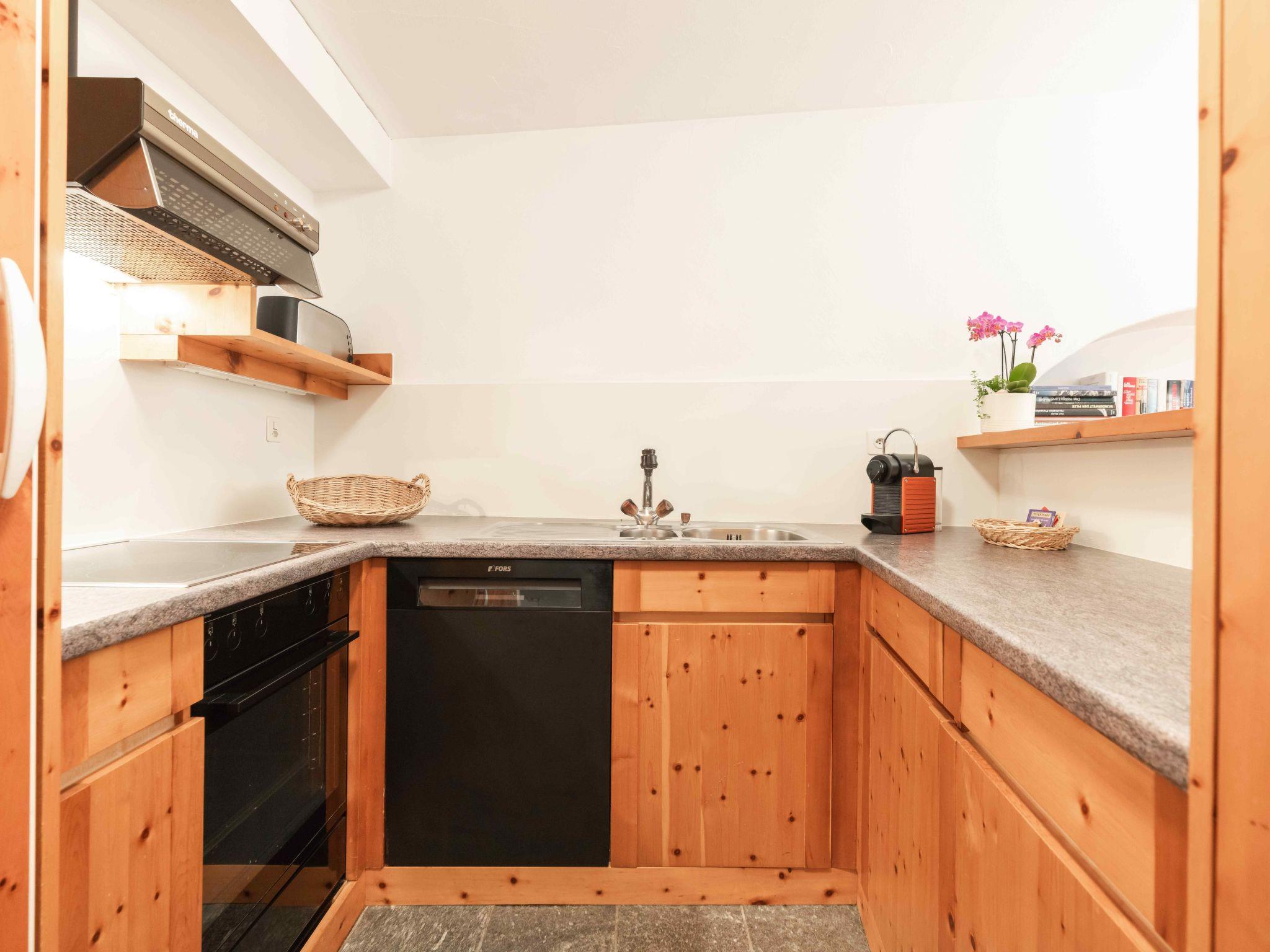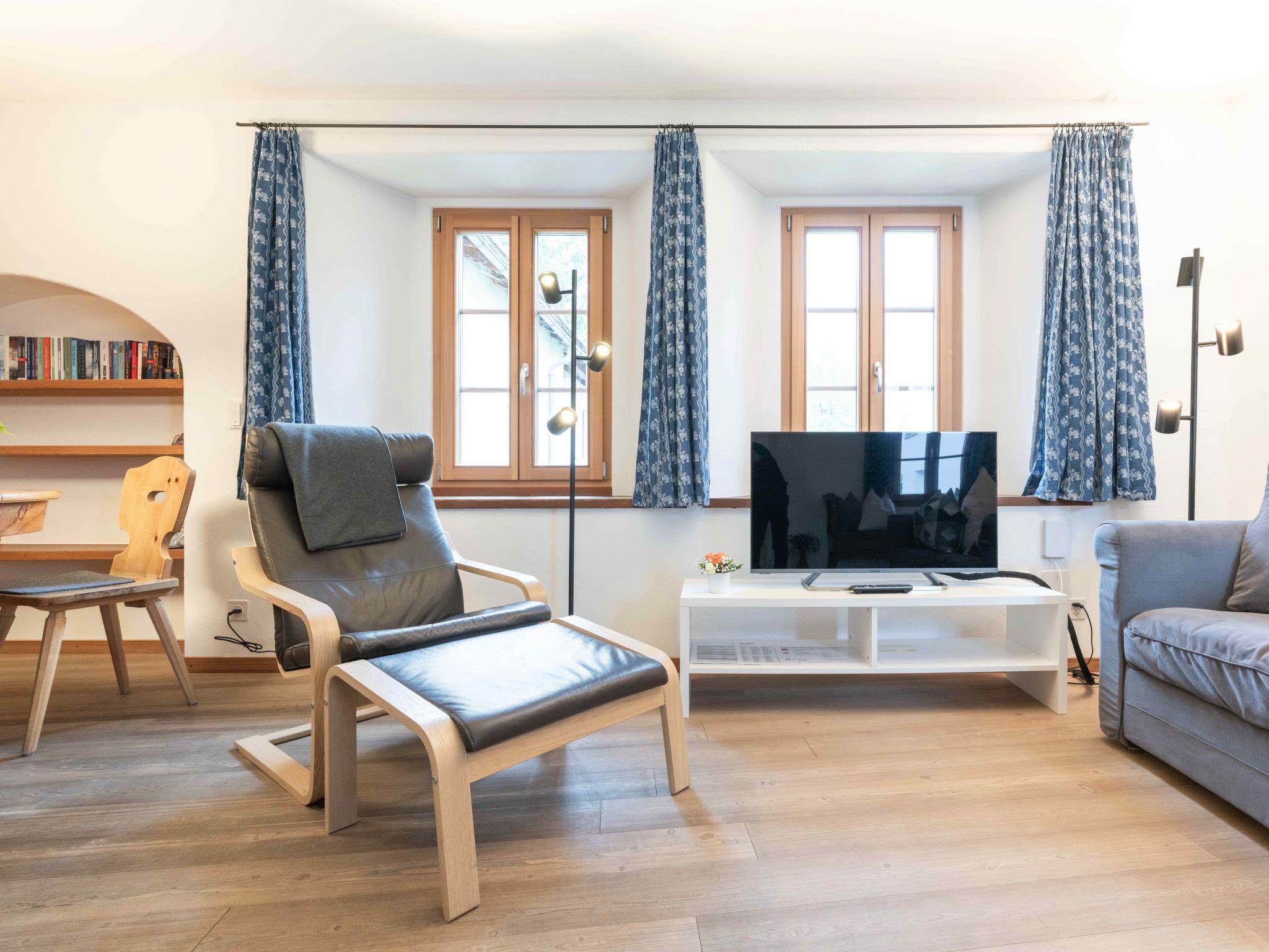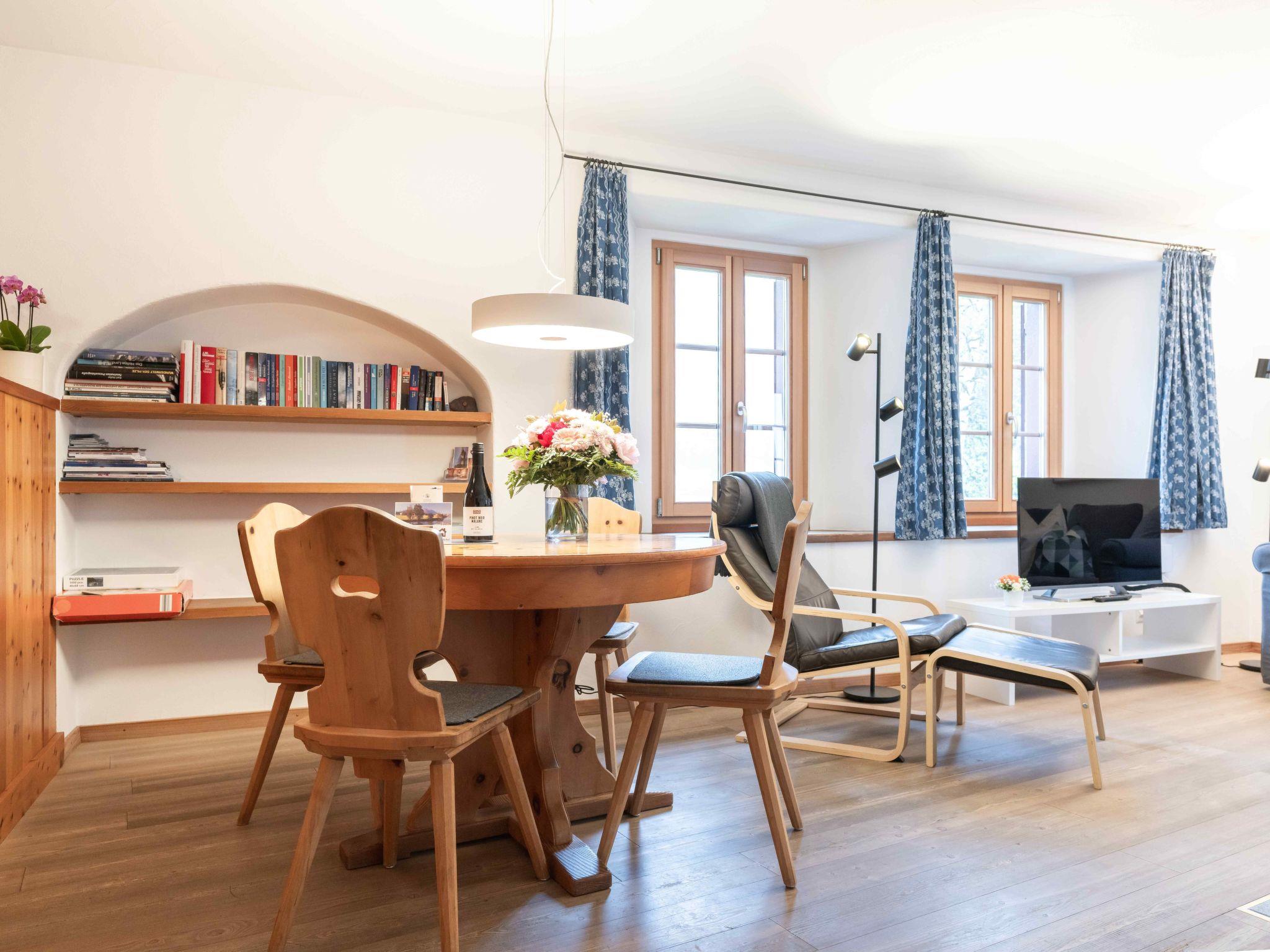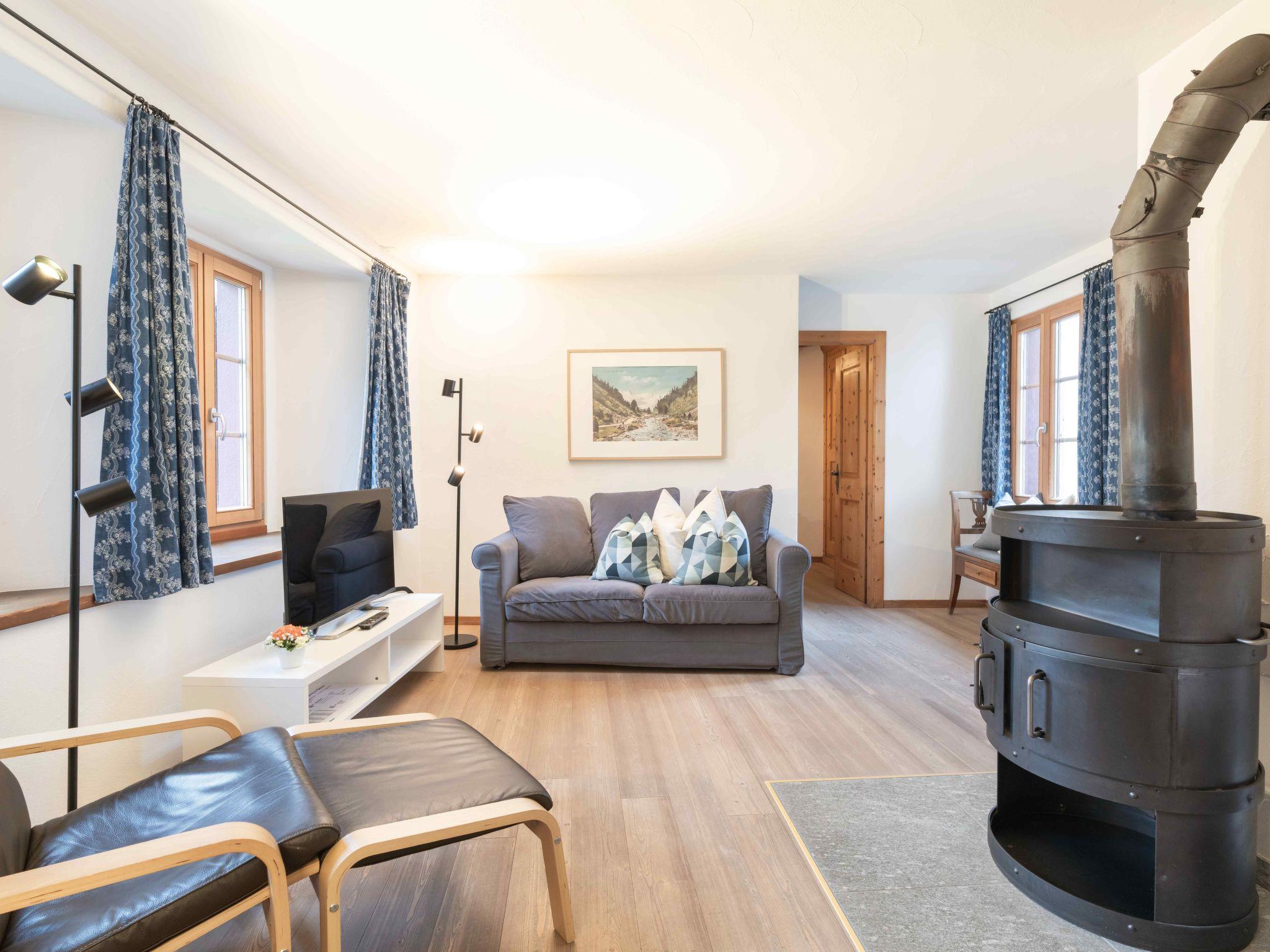 The 2 ½-room Roseg holiday flat, recommended for 2 people, can accommodate up to 4 people. At 59 m², the flat on the first floor offers a cosy atmosphere, characterised by an open-plan living/dining area with a Swedish stove, a modern eat-in kitchen and a separate bedroom with two single beds. Two additional single beds in the living area, a bathroom with bathtub and shower, as well as parquet flooring, underfloor heating, radiators and free Wi-Fi ensure your comfort. Historical photographs from the region adorn the rooms and tell stories from times gone by.