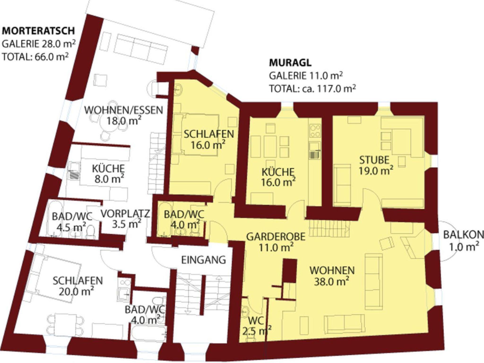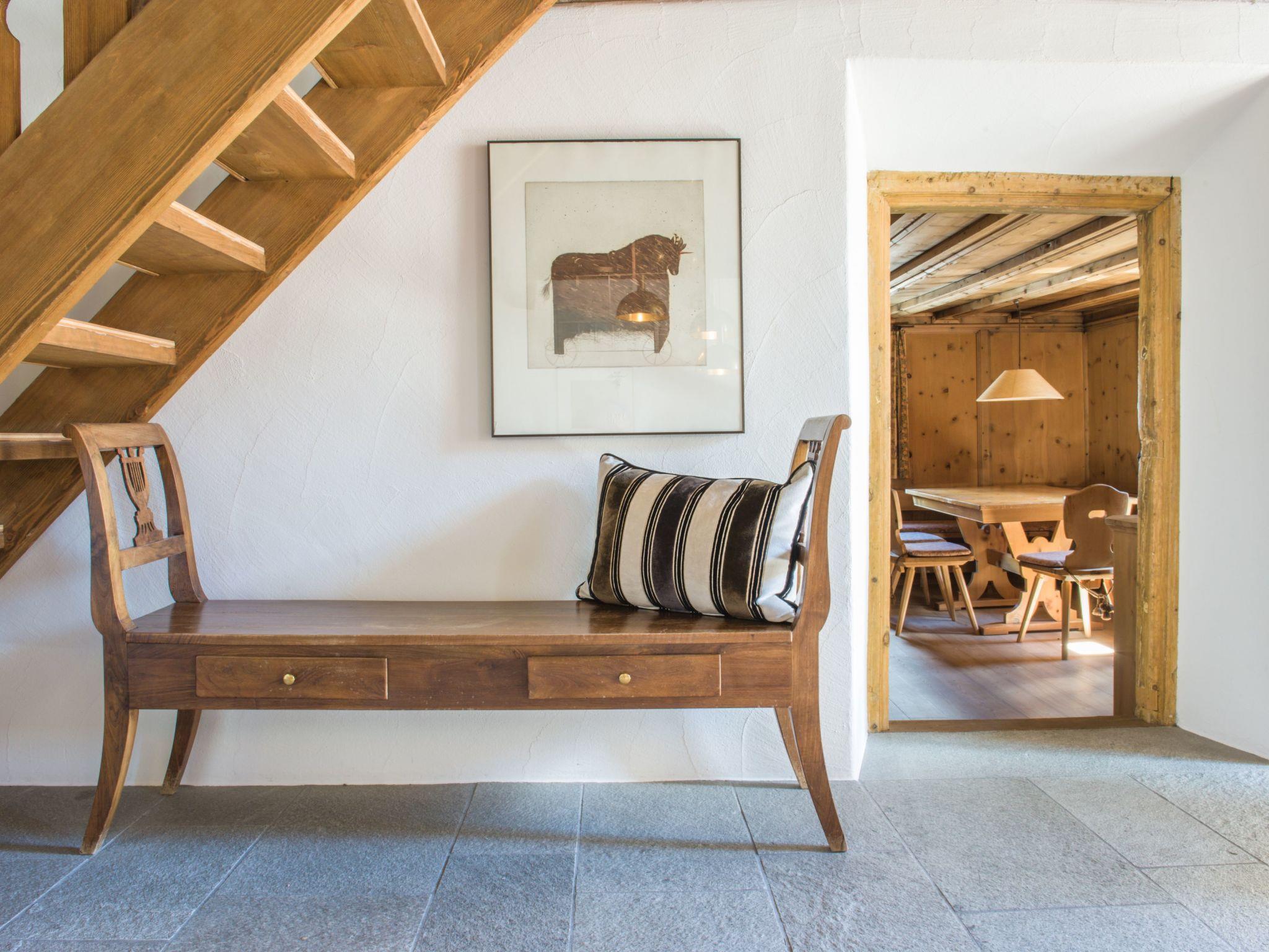 The interior design reflects the perfect symbiosis of traditional Engadine style and modern comfort. Its 117 m² are characterised by natural stone floors and fine parquet flooring with underfloor heating, a high-quality eat-in kitchen fully equipped with all modern amenities and a spacious living room with a breathtaking fireplace. The open gallery under the roof, a spacious bedroom with separate washbasin, an elegant bathroom and an additional separate WC complete the luxurious living ambience.