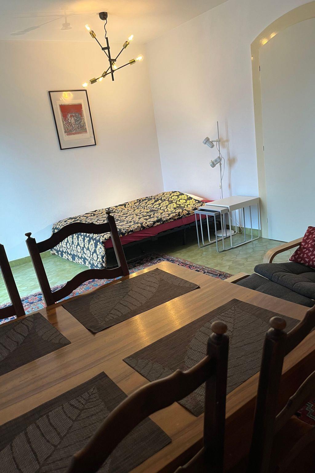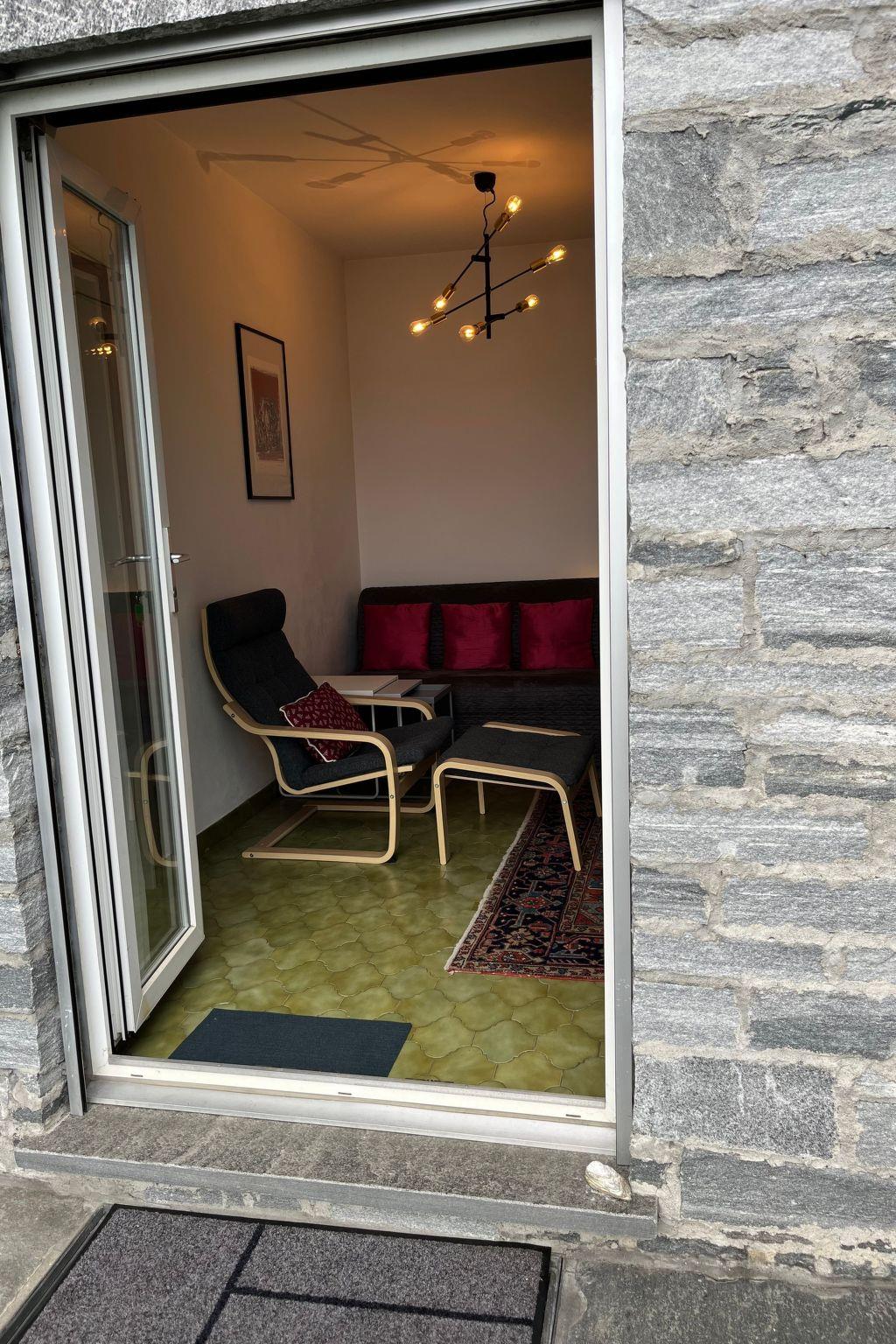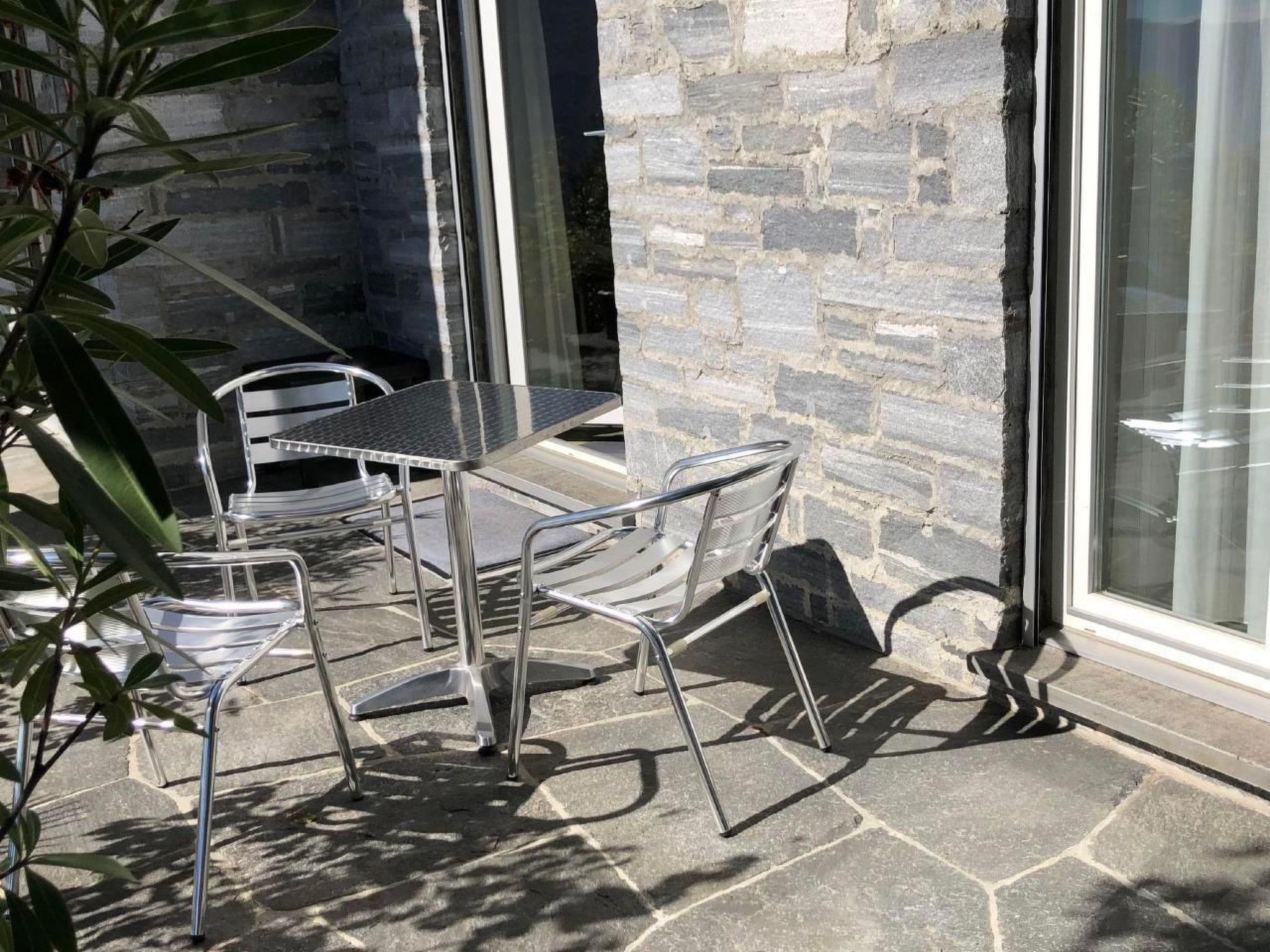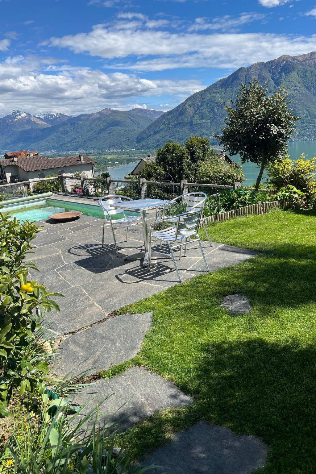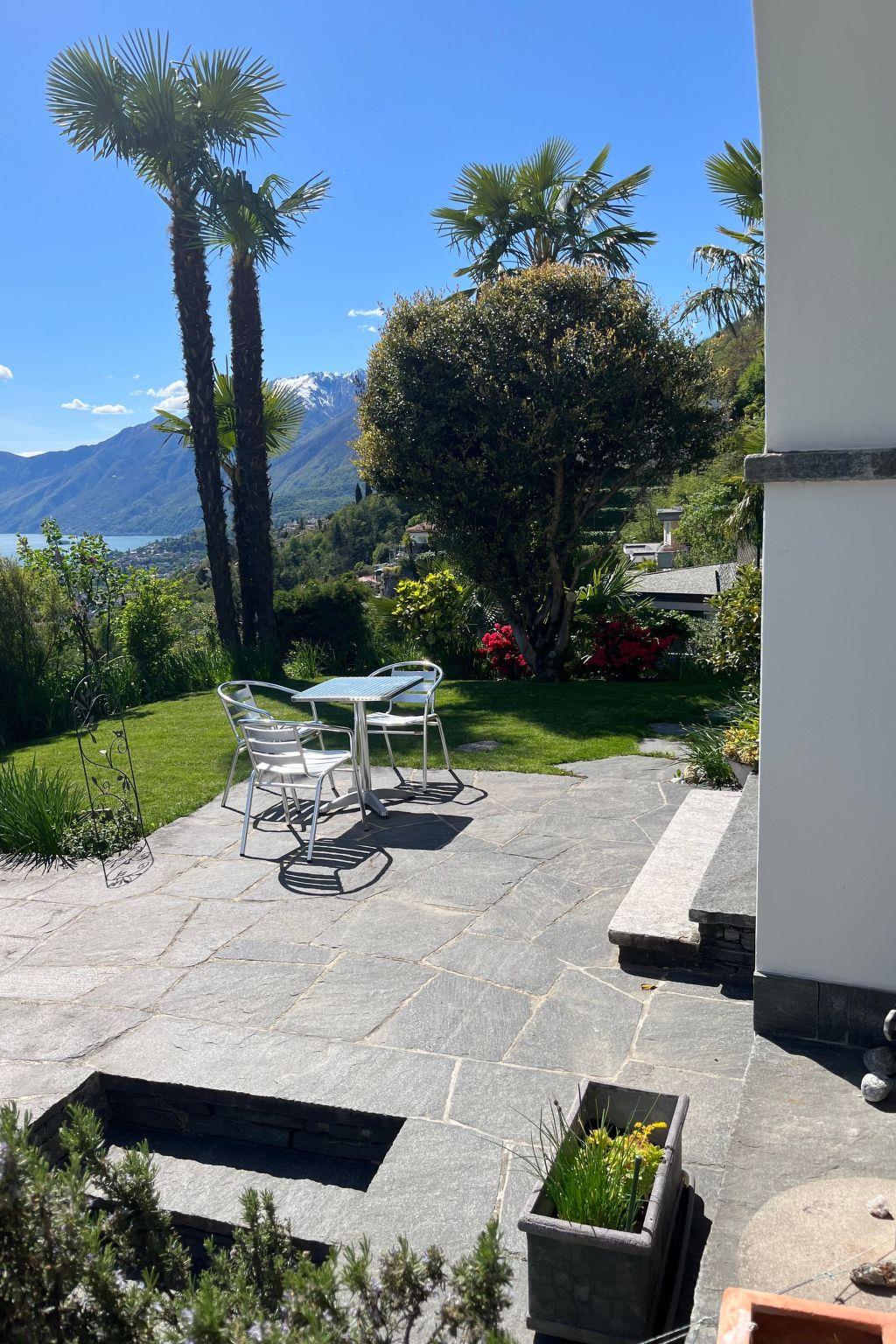 The holiday flat of approx. 65 m2 and a large terrace is in a very quiet location in Brione, on a hill above Locarno. From here you can enjoy a wonderful 180° view of the lake, the Brissago islands and the surrounding mountains. Via a garden staircase and your own partially covered terrace, you enter directly into your living room. There is a table with 4 chairs, an armchair and a sofa that can also be converted into a bed. There is also a TV and a radio. Through a door you enter the bedroom with 2 beds and 2 wardrobes. Through a second door from the living room you enter the rear part of the flat with the kitchen and the bathroom with a shower. Two small restaurants and a grotto are located in the old village centre of Brione about 200 m walking distance from the house, also the bus station is there, near the church. You can go on beautiful hikes and bike tours directly from the house. The lake shore can be reached in 10 minutes by car. The Bolle di Magadino for bird watching, the Maggia valley, the Verzasca valley and the Onsernone valley - to name just 3 of the picturesque valleys - are also close by, or you can hike or cycle up the surrounding mountains, or simply along the lake or the Maggia. Locarno itself has a spa and 2 public swimming pools, the Camellia Park, a falconry, various museums, a castle, churches worth seeing and a beautiful old town. Ascona is 4 km away, Bellinzona, the capital of the canton of Ticino with its famous castles, is 16 km away, Lugano 22 km and Milan 85 km. the Locarno Film Festival, Moon and Stars or the Ascona Jazz Festival and much more ensure international fame. as WiFi is available, the flat is also well suited as a home office.