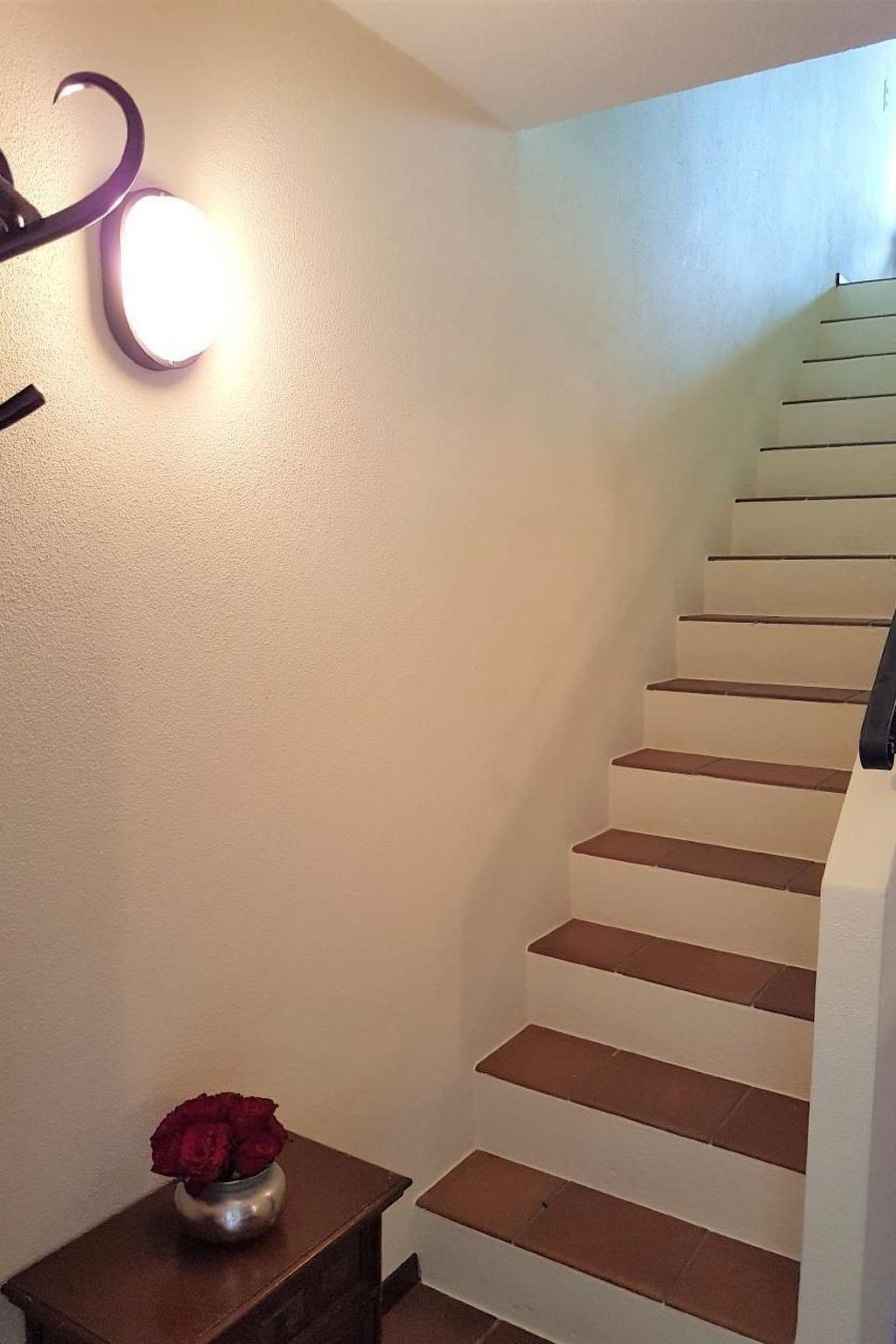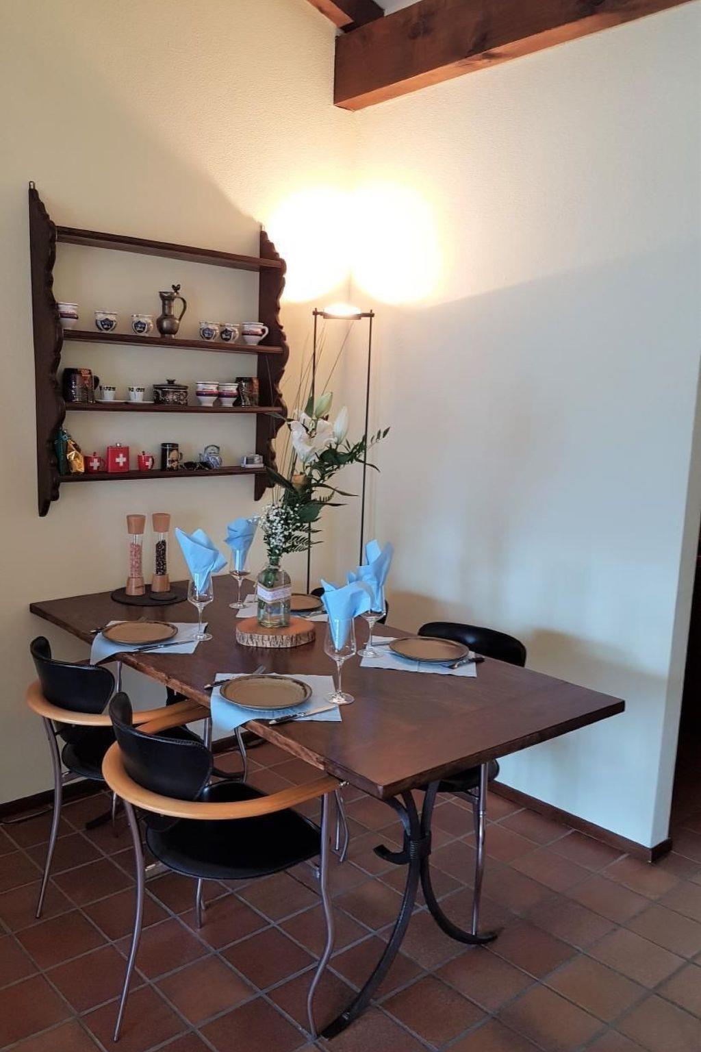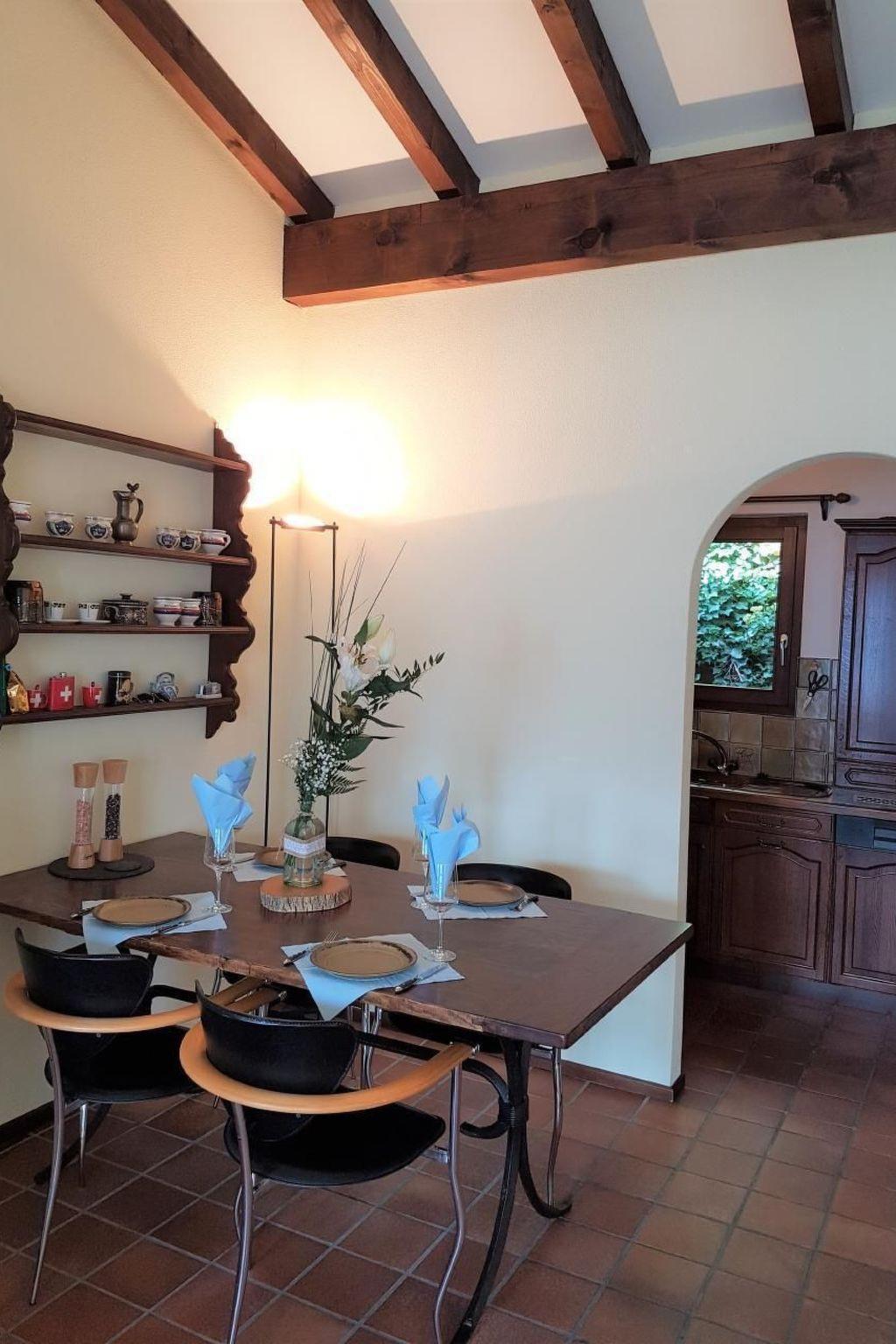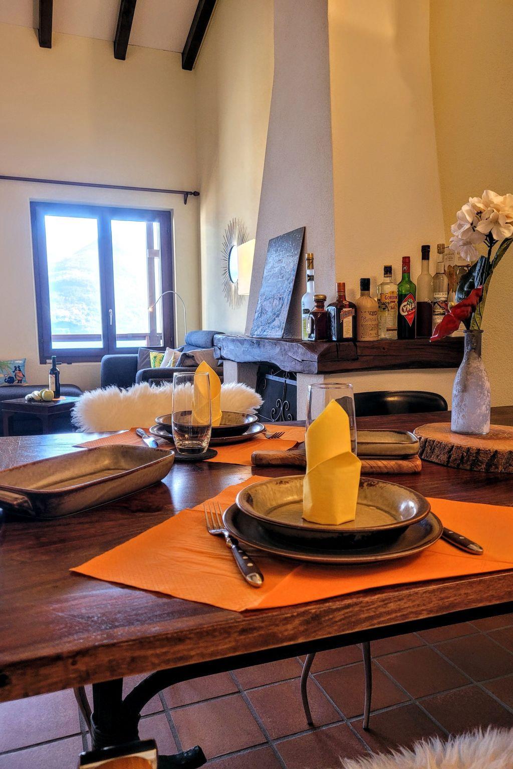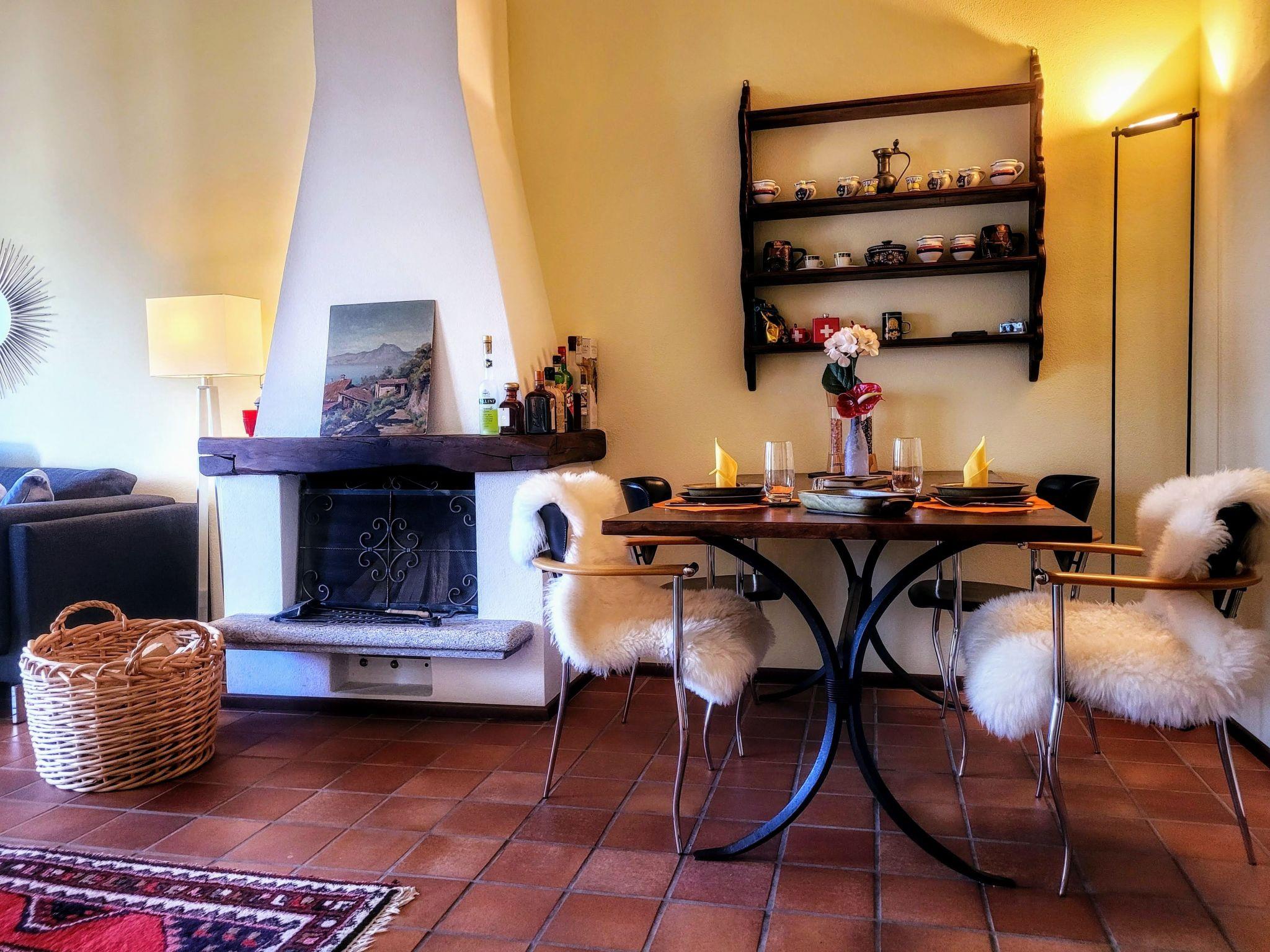 A few steps lead up to the upper floor, where there is a well-furnished living room with dining area, a well-equipped kitchen and a modern guest WC. The generous living room enchants with its Ticino charm, thanks to the high ceiling with wooden beams and an open fireplace.