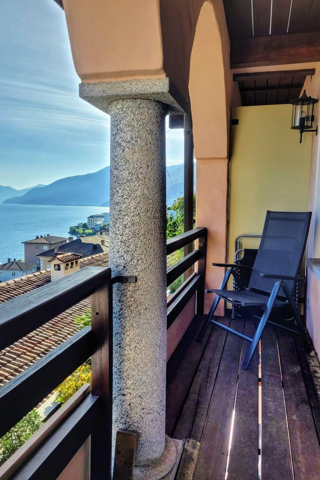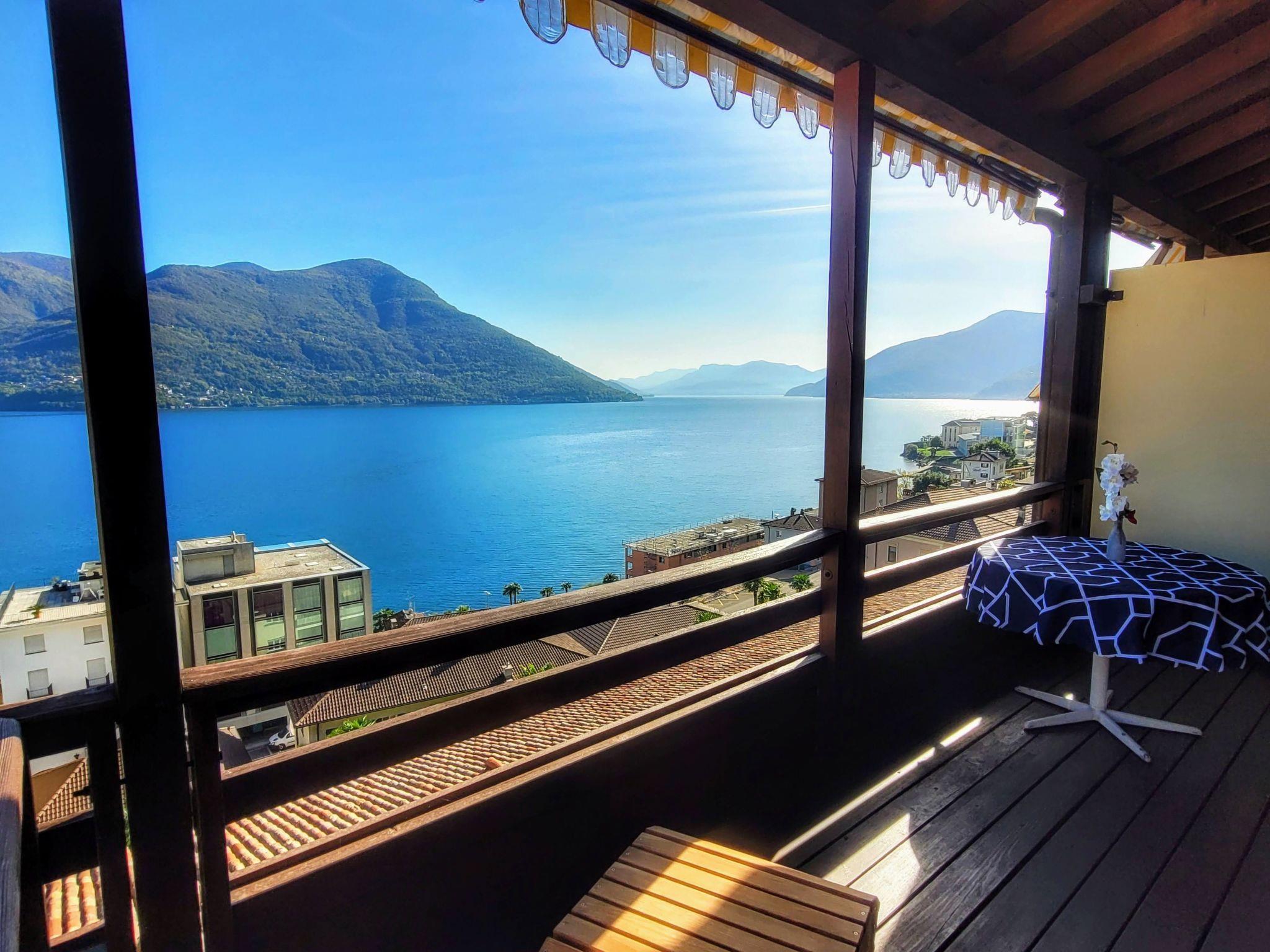 The two-storey flat, with two terraces and a wonderful view over Lake Maggiore towards Italy and the Swiss Alps, is just a few steps away from the beautiful lakeside promenade. Thanks to the privileged location on the 5th floor of a building on a hill about 100 metres from the lakefront road, you can enjoy the tranquillity and relative distance from the bustling city life.