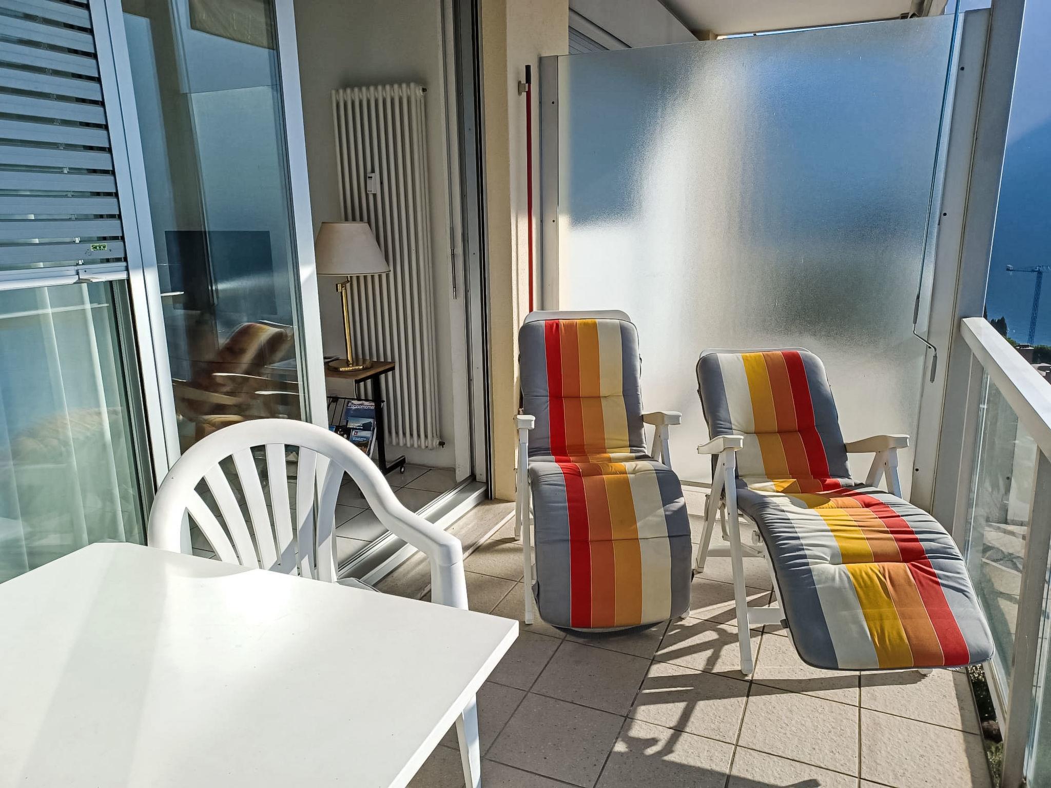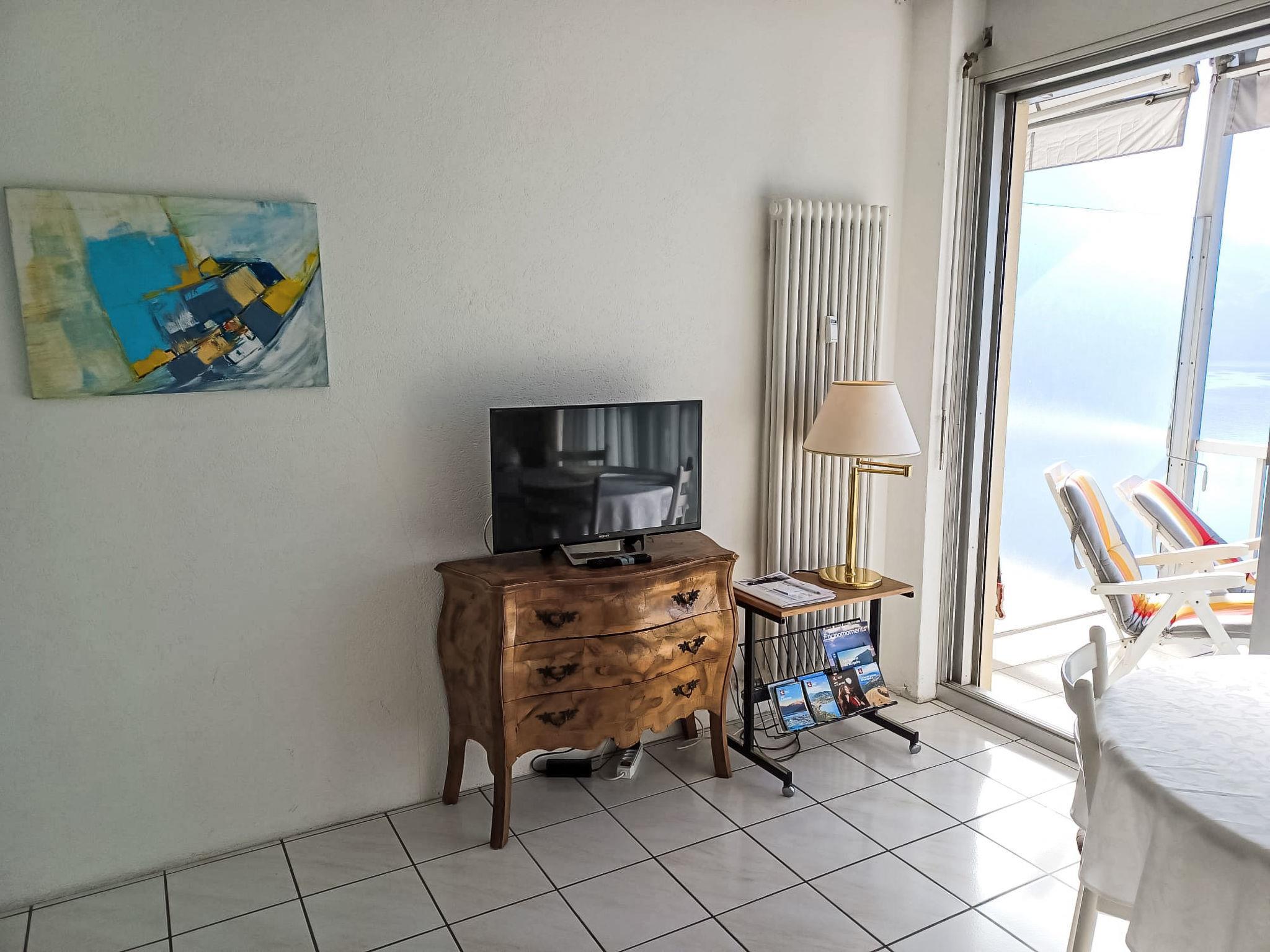 "Vista Lago", 1-room studio 35 m2 on 6th floor, south facing position. Spacious and bright, comfortable and modern furnishings: open living/sleeping room with panoramic window with 1 double fold-away bed (2 x 90 cm, length 200 cm), dining table and satellite TV (flat screen). Exit to the terrace. Small kitchen (4 hot plates, oven, dishwasher). Shower/WC. Terrace 8 m2 partly roofed, south facing position. Terrace furniture. Marvellous panoramic view of the lake, the mountains, the countryside and the resort. Facilities: children's high chair, baby cot for up to 2 year olds (extra). Internet (WiFi, free). Parking space n 20 (roofed), height 290 cm, width 230 cm. Please note: non-smokers only. TV only DE, EN, ES. NL-00009004