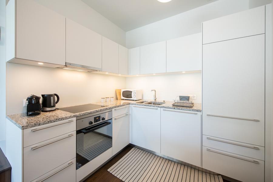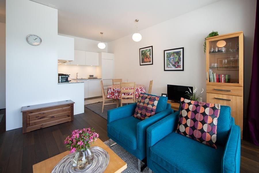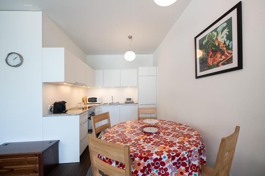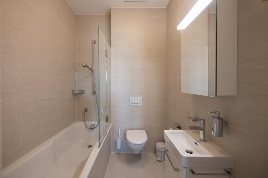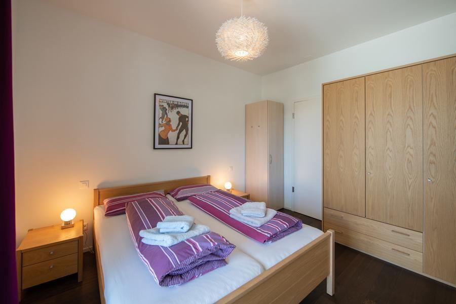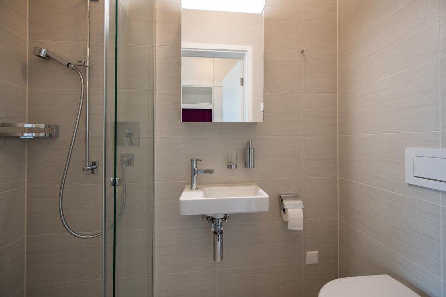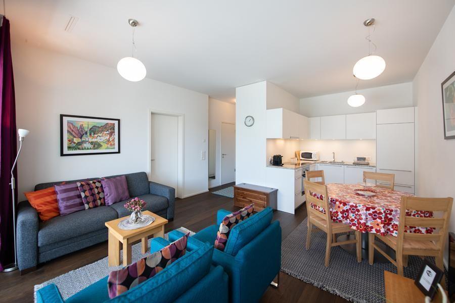 Living room with WLAN, new flat screen TV and balcony (with garden furniture) Couch with 2 sleeping places Open kitchen with dishwasher, induction cooker, oven, Nespresso machine and toaster, microwave, kettle, incl. meat fondue set, as well as crockery and cutlery. Meat fondue set and crockery for 6 people Bedroom with a double bed and 2 single mattresses Electronic light detectors at the entrance and in the corridor, as well as in the fridge, no windows in the stairwell Bathroom with bathtub/sink/WC, hairdryer Shower/WC/sink, shower with partition Entrance area with cloakroom and cleaning cupboard
