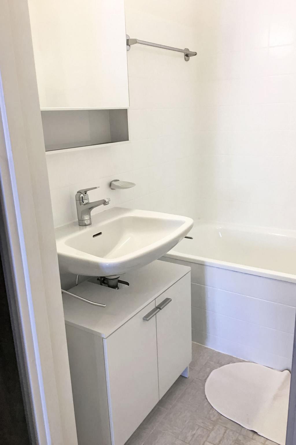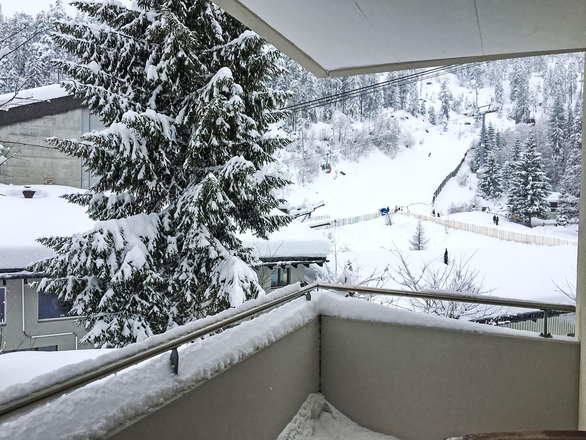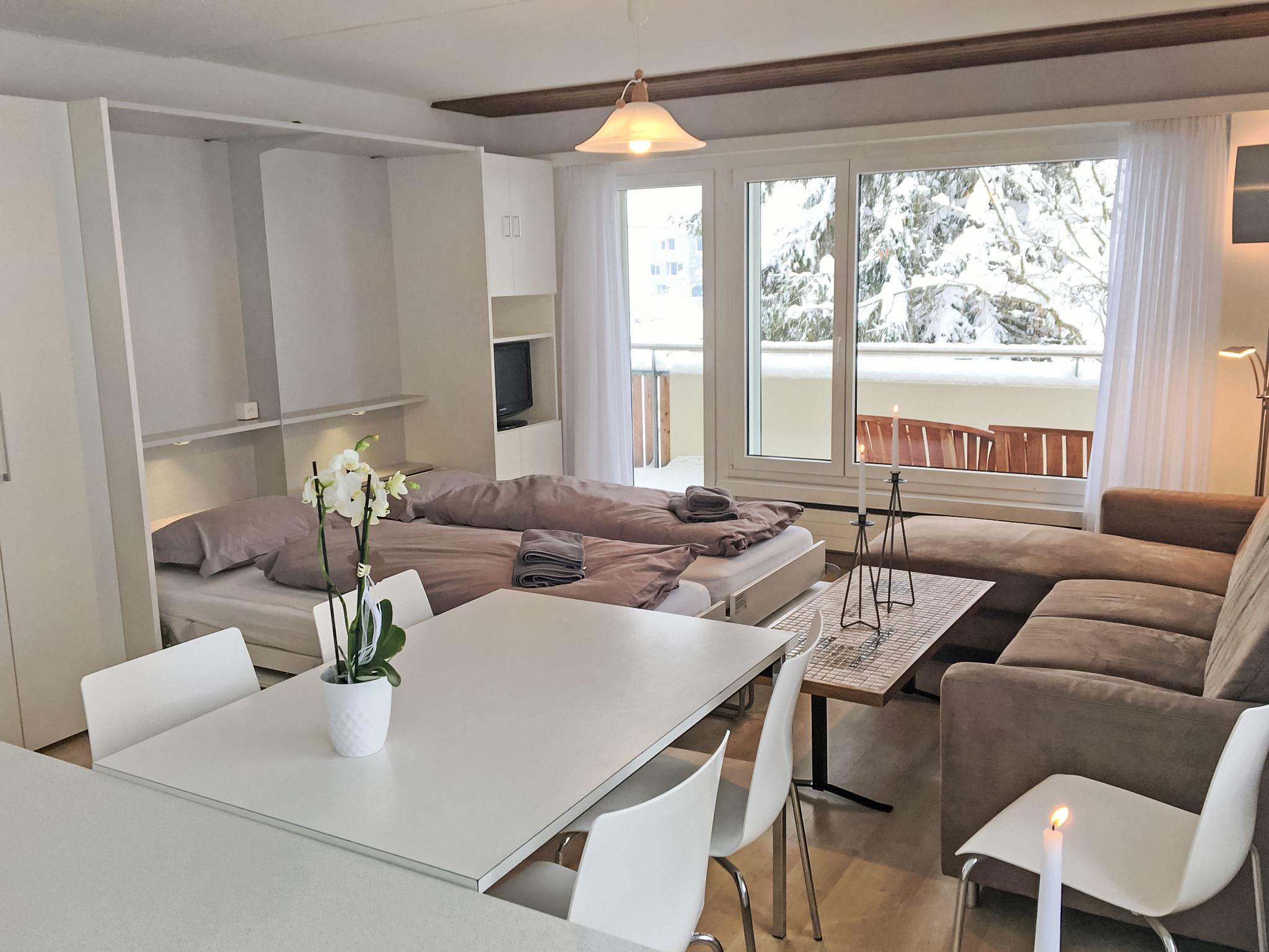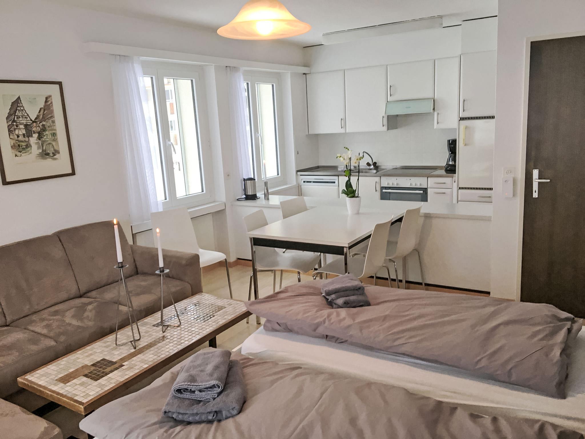 2-room apartment 50 m2 on 1st floor, south facing position. Bright, comfortable and cosy furnishings: open large living/sleeping room with 1 double fold-away bed (2 x 90 cm, length 200 cm), dining table, satellite TV and flat screen. Exit to the balcony. 1 double bedroom with 1 bed (90 cm, length 200 cm), 1 double bed (2 x 90 cm, length 200 cm). Exit to the balcony. Open kitchen (dishwasher, 4 ceramic glass hob hotplates, fondue Set (cheese)). Bath/WC. Balcony 14 m2. Beautiful view of the mountains and the countryside. Facilities: children's high chair. Internet (WiFi, free). Garage space n 7-6 at the house, height 194 cm. Please note: non-smokers only. No skis and ski boots allowed in the apartment in the winter. 571 687.68.266.151