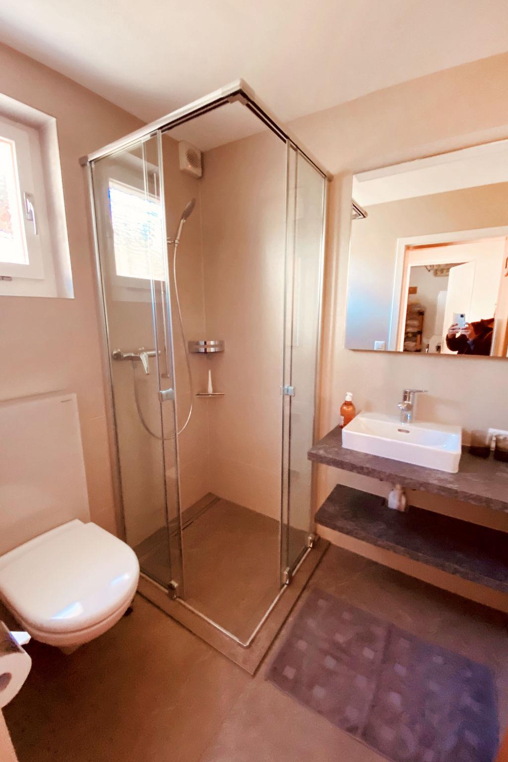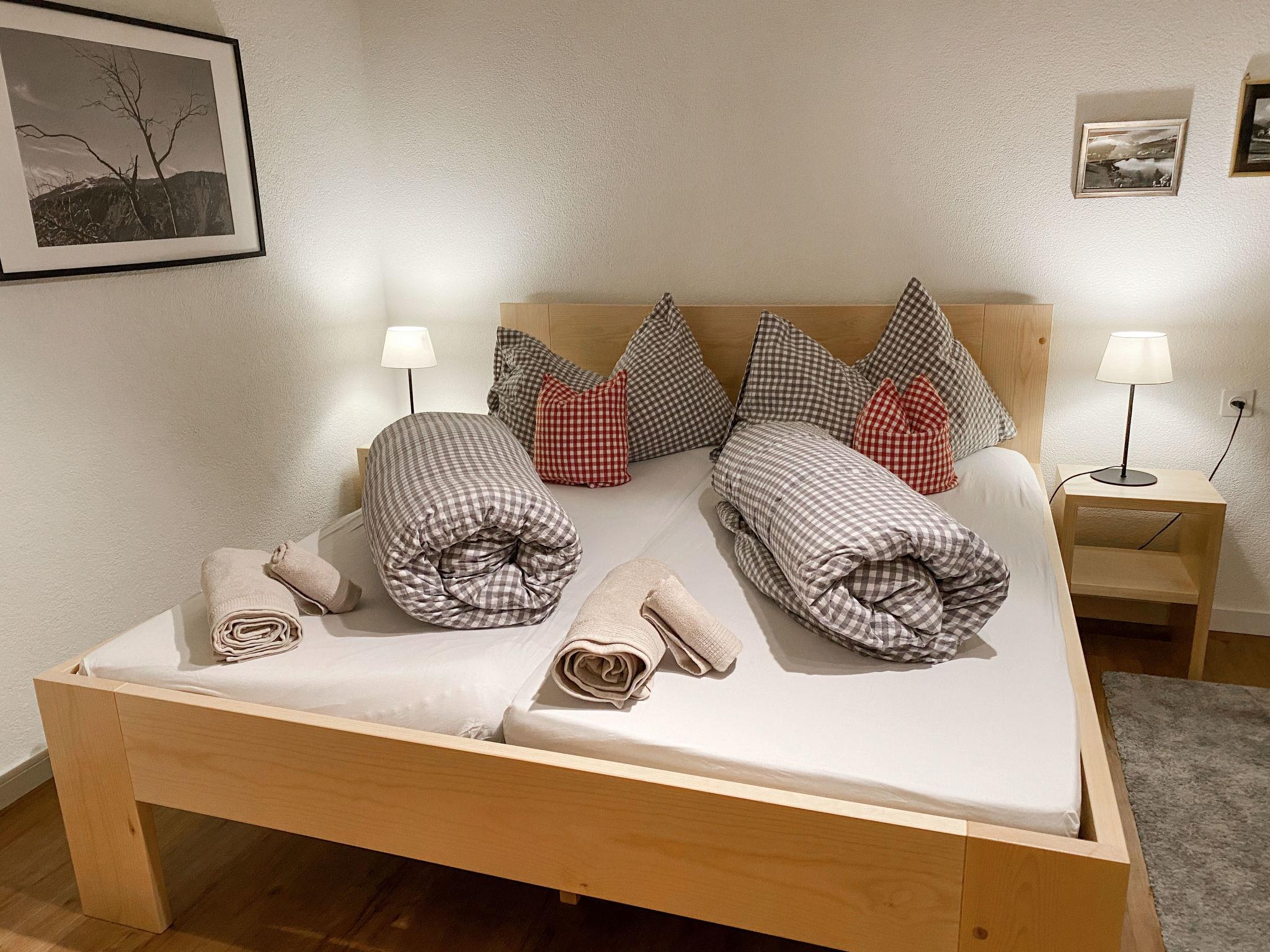 "Schumellins (LAA400)", 1-room apartment 35 m2, on the ground floor, south facing position. Renovated in 2021, tasteful and cosy furnishings: living/sleeping room with 1 double bed, dining table and cable TV (flat screen). Exit to the terrace. Open kitchen (oven, dishwasher, 2 ceramic glass hob hotplates, electric coffee machine, raclette grill, fondue Set (chinoise, cheese)). Shower/WC. Oil heating. Terrace. Terrace furniture, barbecue, deck chairs (2). Beautiful panoramic view of the lake, the mountains, the countryside and the resort. Facilities: Internet (WiFi, extra). Parking (roofed) at the house. Please note: non-smoking house. Maximum 2 pets/ dogs allowed. Private entrance.