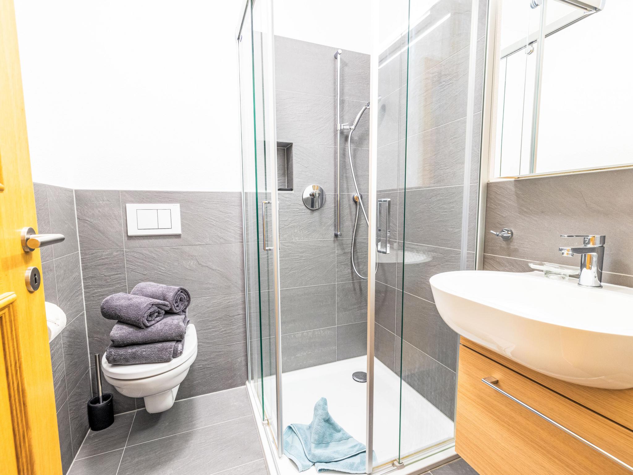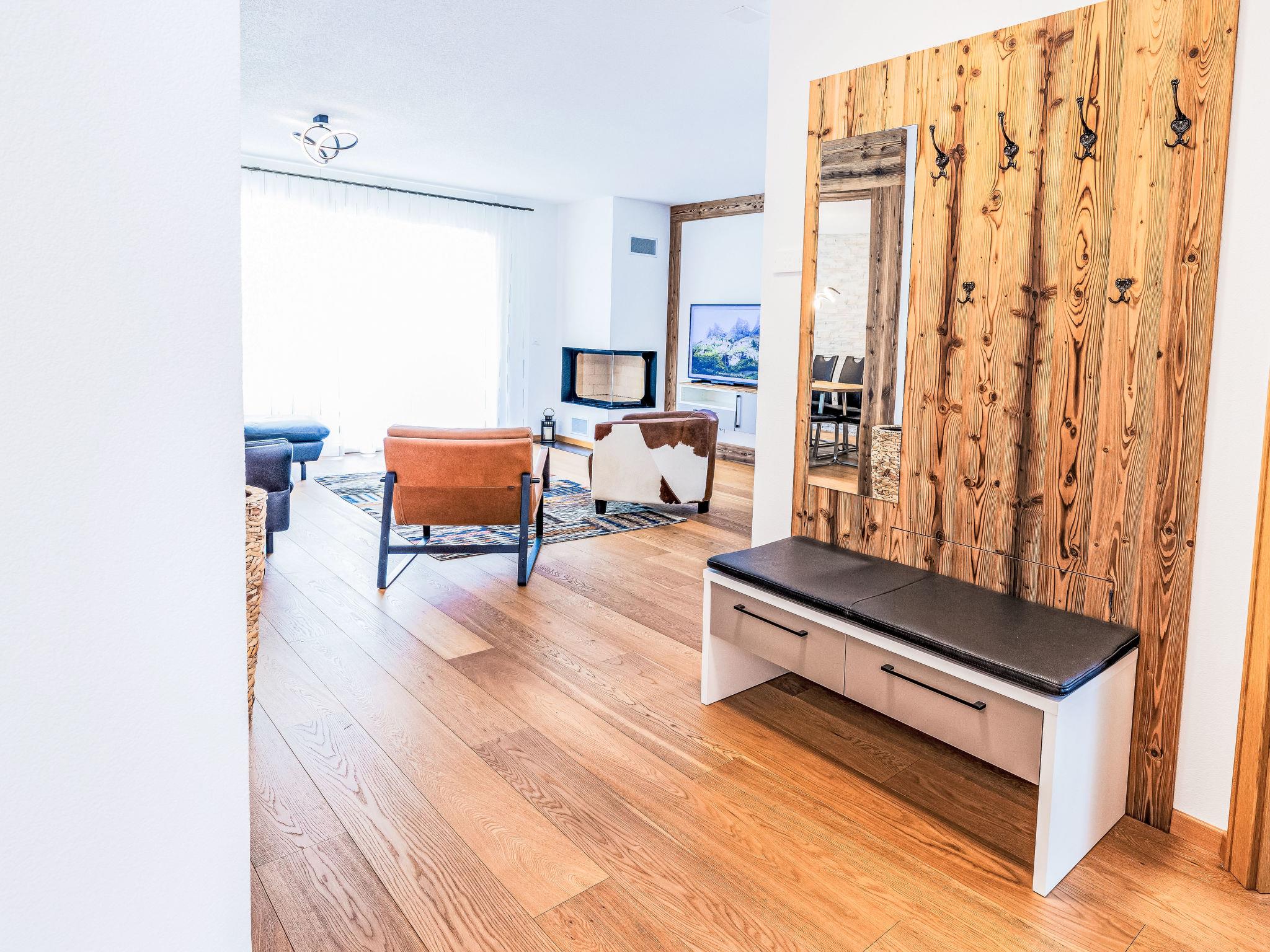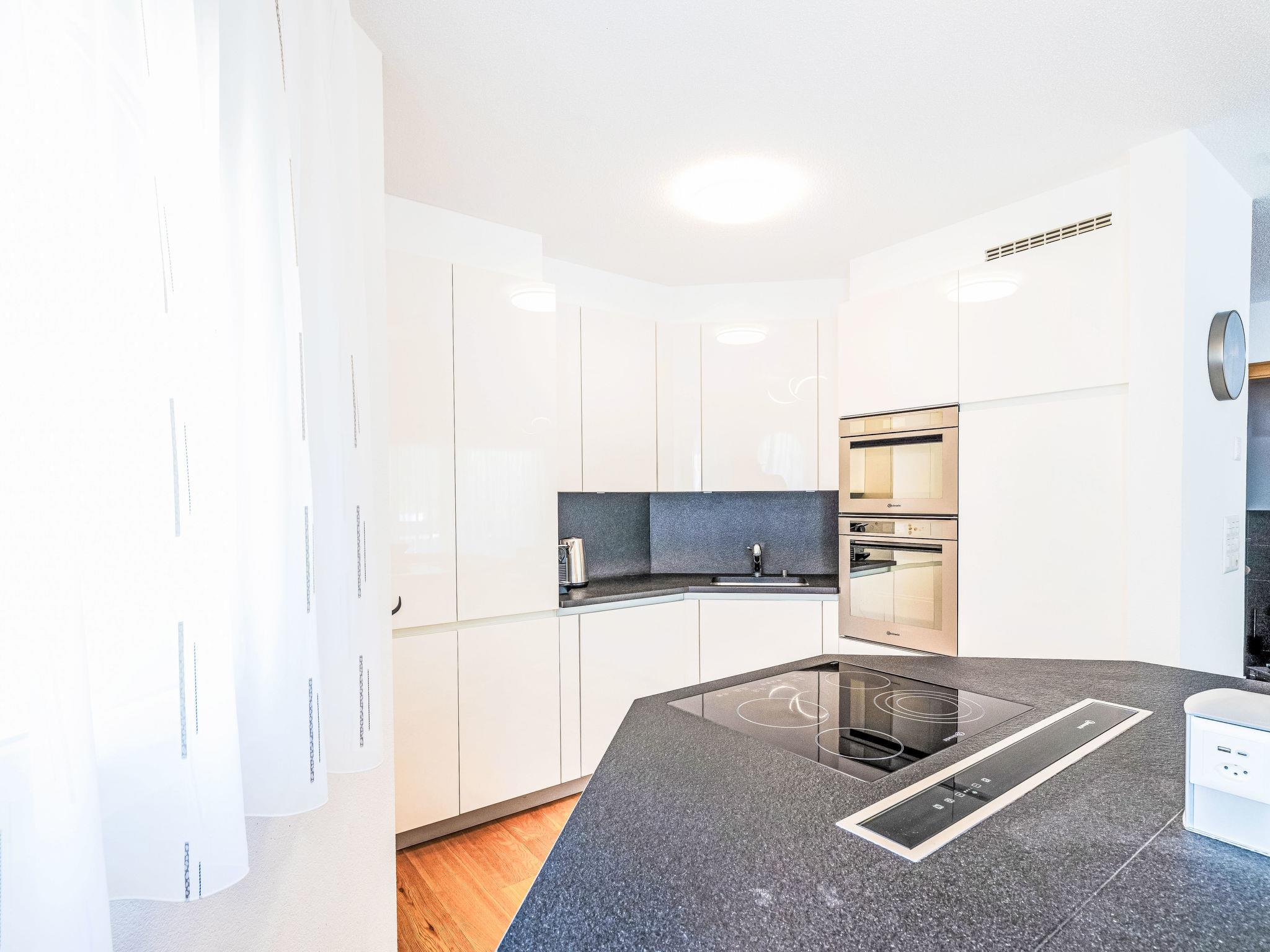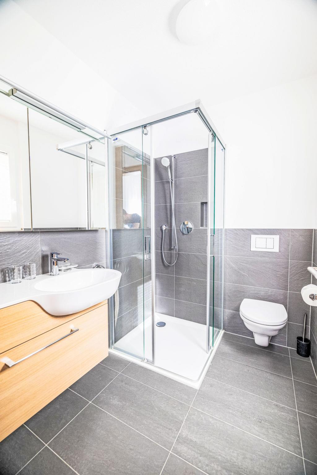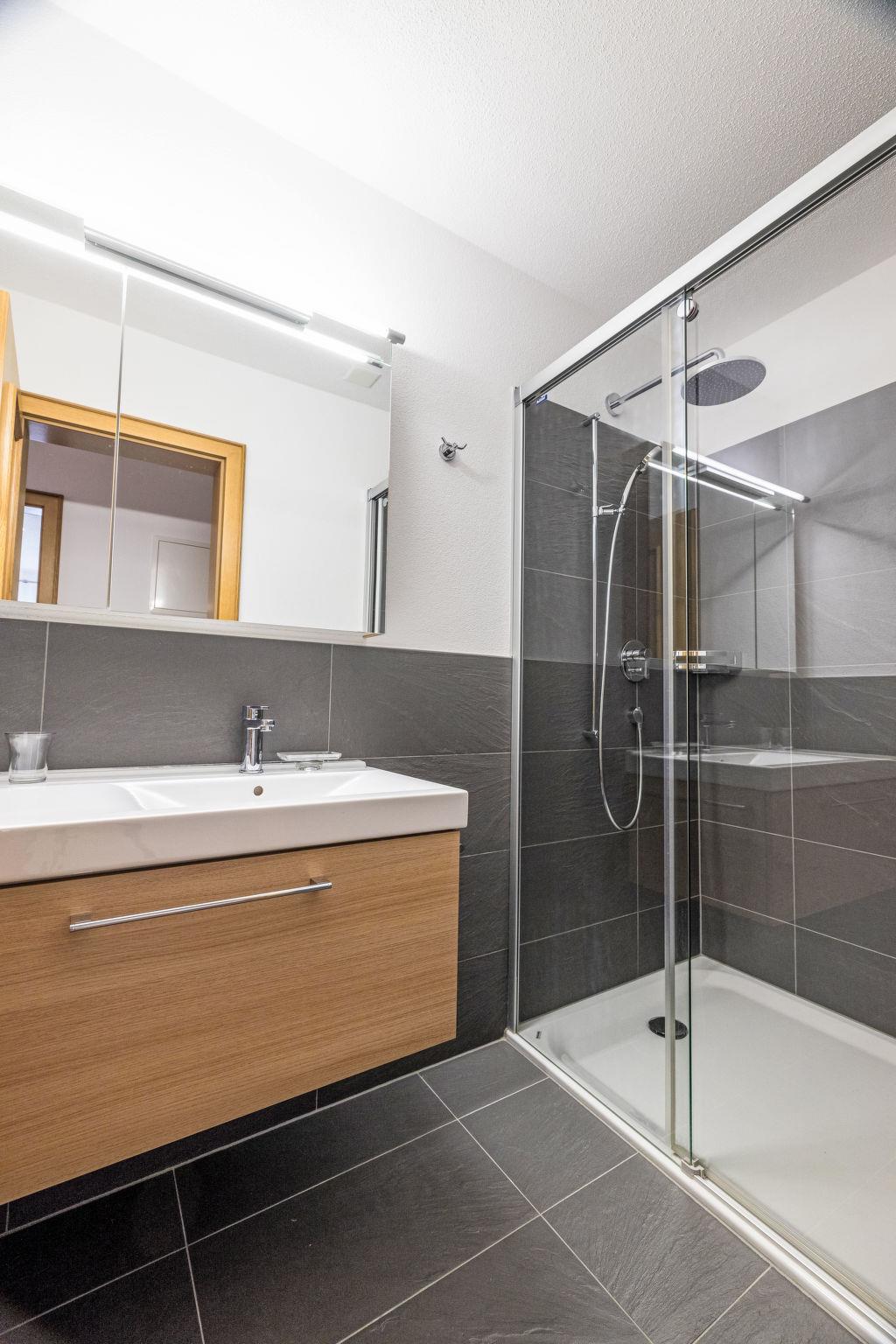 "B21", 5-room apartment 156 m2 on 2nd floor. Comfortable and modern furnishings: living/dining room with open-hearth fireplace and satellite TV (flat screen). Exit to the balcony. 3 rooms, each room with 1 double bed and shower/WC. 1 room with 2 beds, separate WC and shower. Open kitchen (oven, dishwasher, 4 ceramic glass hob hotplates, toaster, kettle, microwave, electric coffee machine, Capsules for coffee machine (Nespresso) extra, raclette grill, cooking island, fondue Set (cheese)). 2 balconies. Balcony furniture. Beautiful view of the mountains and the countryside. Facilities: washing machine, dryer. Internet (WiFi, free). Parking (roofed). Please note: non-smokers only.