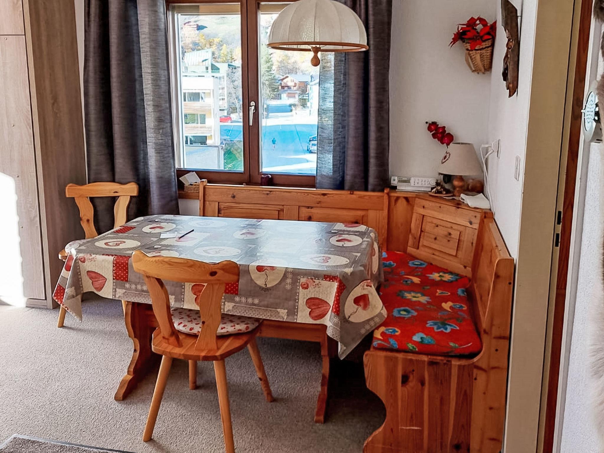 2-room apartment 65 m2 on 3rd floor. Practical and cosy furnishings: living/dining room with 1 double fold-away bed (140 cm, length 190 cm), dining table and cable TV (flat screen), hi-fi system. Exit to the balcony, south facing position. 1 room with 2 fold-away beds. Kitchen (4 hot plates, oven, microwave, electric coffee machine). Bath/WC. Balcony furniture, deck chairs (2). Very beautiful view of the mountains and the resort. Facilities: baby cot for up to 2 year olds. Internet (WiFi, free). Parking space n 10 (roofed). Please note: non-smokers only.