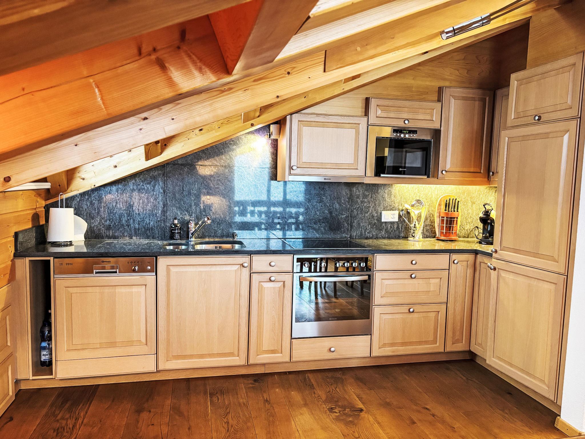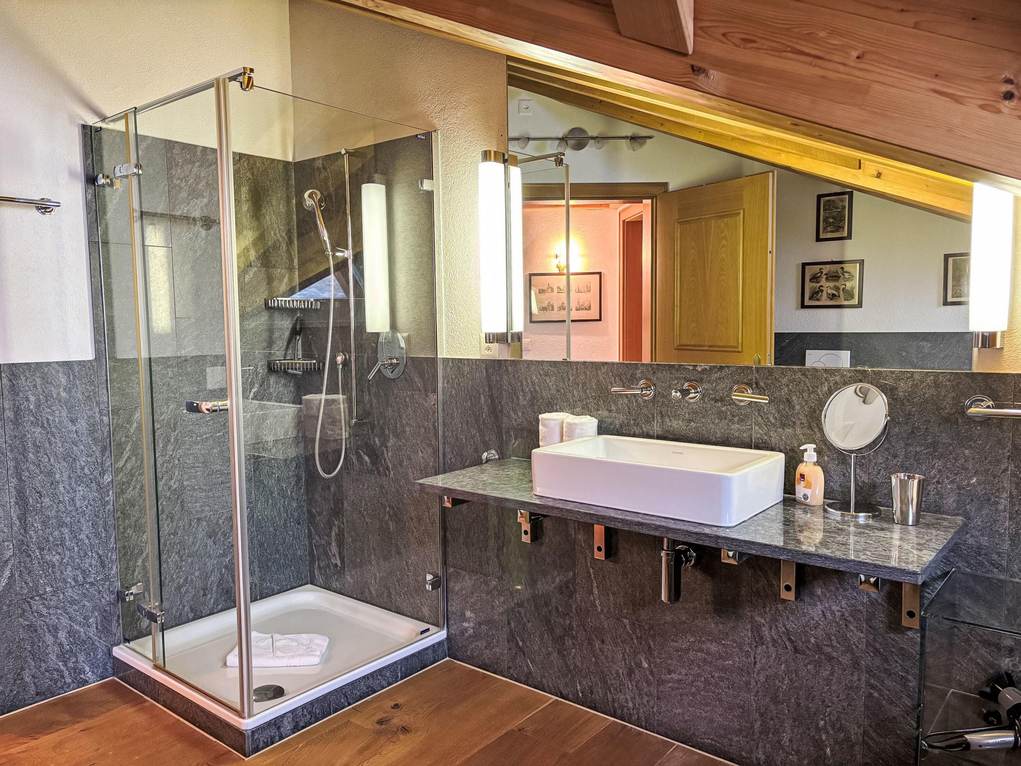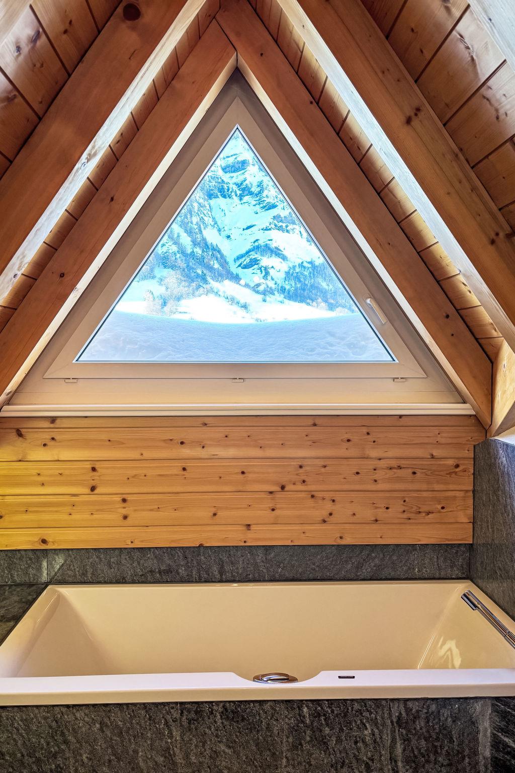3-room penthouse 100 m2 on 2 levels on 4th floor. Comfortable and tasteful furnishings: living/dining room with open-hearth fireplace. Exit to the balcony, south facing position. 1 room with digital TV and DVD. 1 double bedroom with sloping ceilings with 1 double bed. Open kitchen (oven, dishwasher, 4 ceramic glass hob hotplates, microwave, electric coffee machine, Capsules for coffee machine (Nespresso) extra). Shower/WC, bath/shower/WC. Upper floor: open gallery with sloping ceilings with 1 double bed. Very beautiful view of the mountains and the countryside. Facilities: children's high chair, baby cot (extra). Internet (WiFi, free). Garage (extra). Please note: non-smokers only.