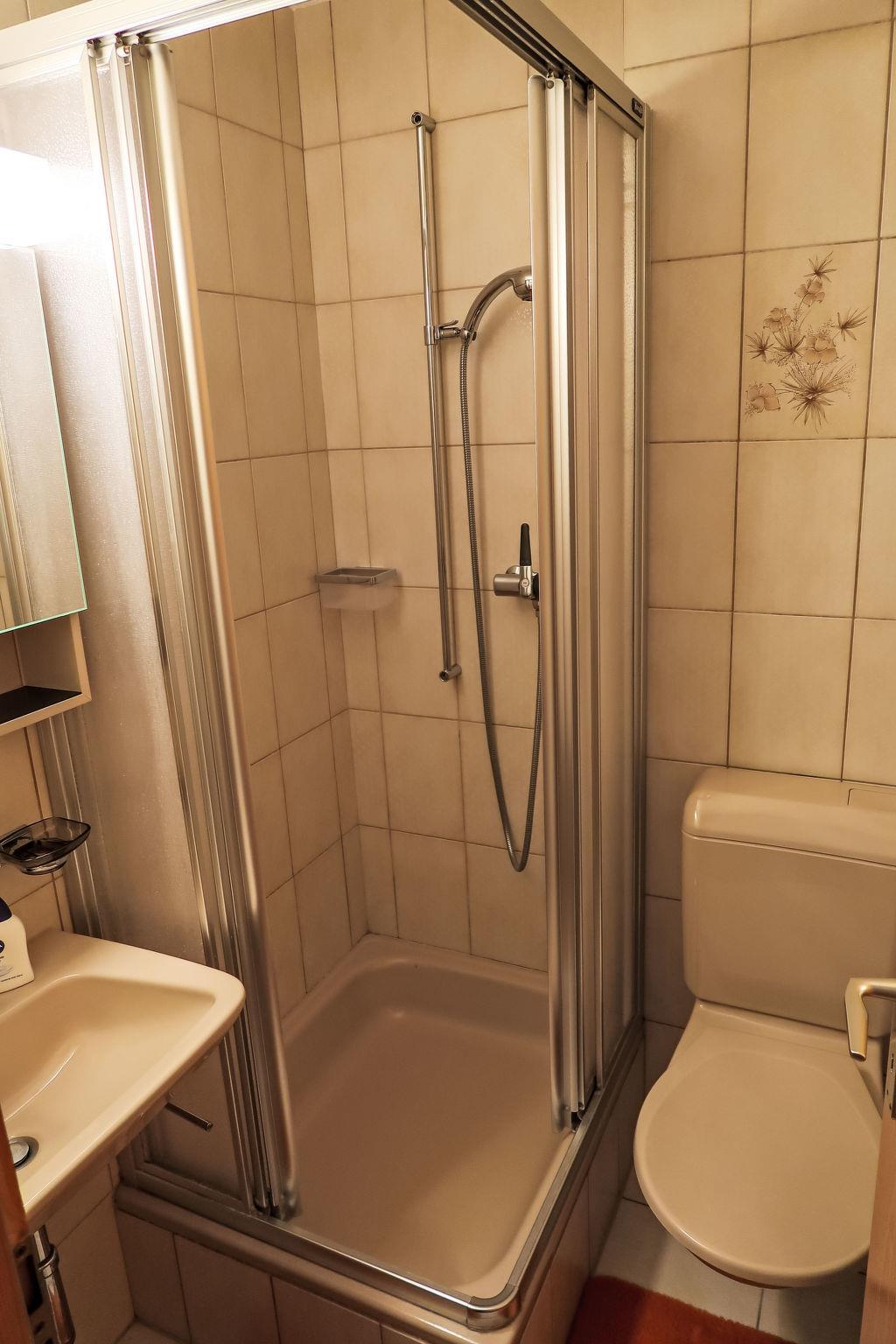 2-room penthouse 60 m2 on 2 levels on 2nd floor. Cosy furnishings: living/dining room with cable TV and flat screen. Exit to the balcony, east facing position. Open kitchen (3 hot plates, oven, electric coffee machine, Capsules for coffee machine (Delizio) extra). Shower/WC. Upper floor: (spiral staircase), 1 double bedroom with sloping ceilings with 2 beds. Sep. WC. Balcony. Balcony furniture. Very beautiful view of the mountains and the resort. Facilities: hair dryer. Internet (WiFi, free). Please note: non-smokers only. Maximum 2 pets/ dogs allowed.