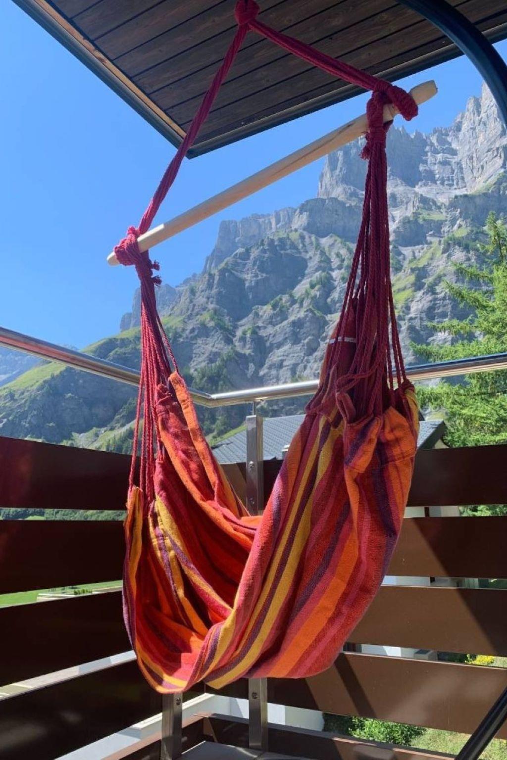 Two balconies await you in the outdoor area, inviting you to linger: A large south-facing balcony 9.5sqm with a wonderful view over Leukerbad with a hanging chair (which can also be hung from the ceiling in Bedroom 1), a hammock frame as well as chairs and two small new tables (which can be folded away if not needed) for cosy hours outdoors or the small west-facing balcony 2sqm from Bedroom 2 to read a book in peace or simply relax. In addition, the attic is directly above the flat. The flat is in a quiet location, off the Ringstrasse (main road) above Leukerbad (top houses with great views), just a few metres from the Gemmi cable car. Newly insulated building facade and roof. Our garage box is at your sole disposal.