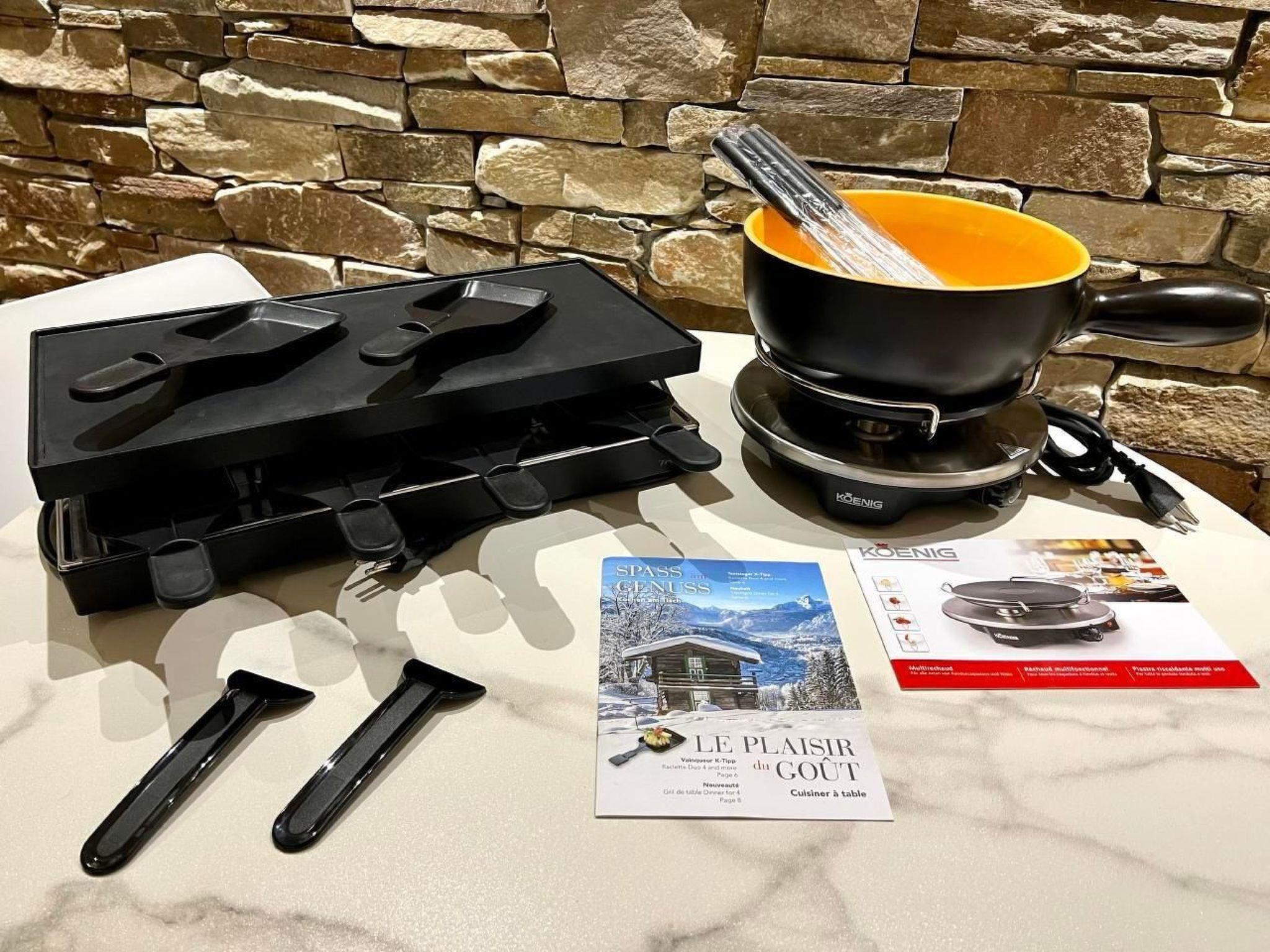 Kitchen with oven, ceramic hob, fridge with freezer compartment, Nespresso capsule machine/kettle, fondue and raclette set
