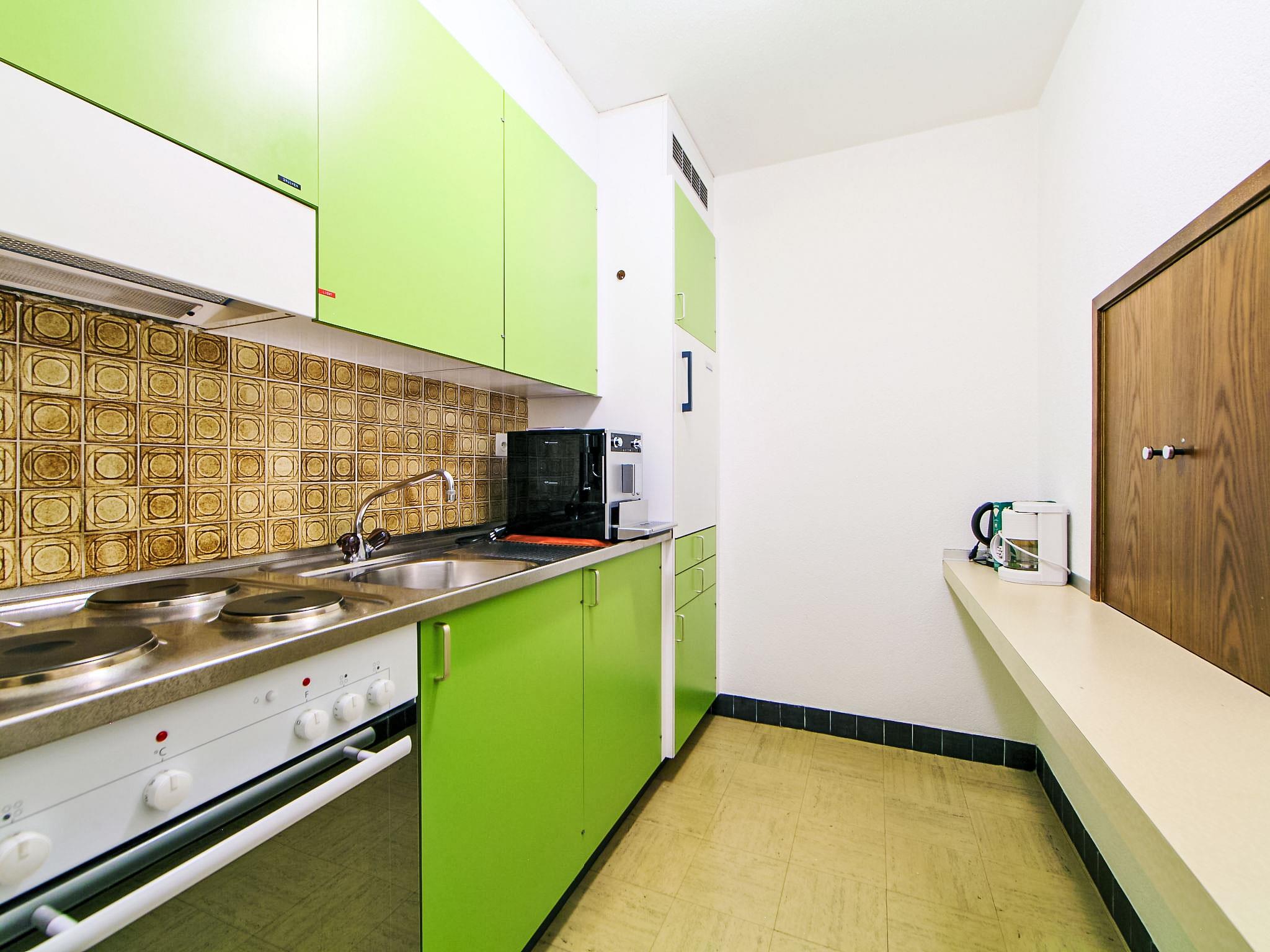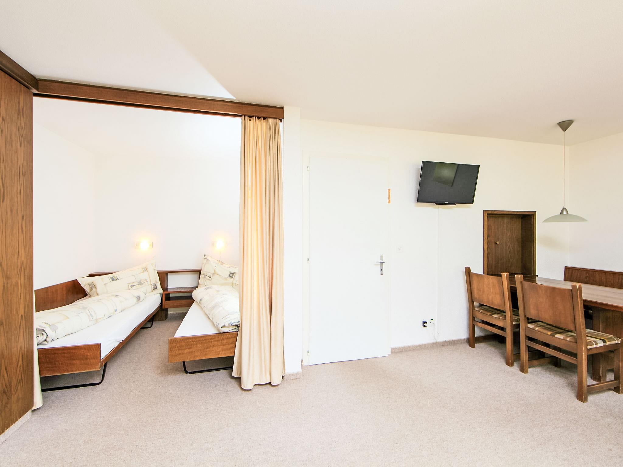 "Ringstrasse Apt 412", 1-room apartment 59 m2 on 4th floor. Practical furnishings: living/dining room with 2 fold-away beds and cable TV (flat screen). Alcove with curtain with 2 beds. Kitchen (3 hot plates, oven, microwave, electric coffee machine). Bath/WC. Balcony. Terrace furniture. Beautiful view of the mountains and the valley. Facilities: Internet (WiFi, free). Please note: non-smokers only. Instead of an enclosed bedroom, some sleeping areas are located in an open-plan area (gallery, alcove, etc.).