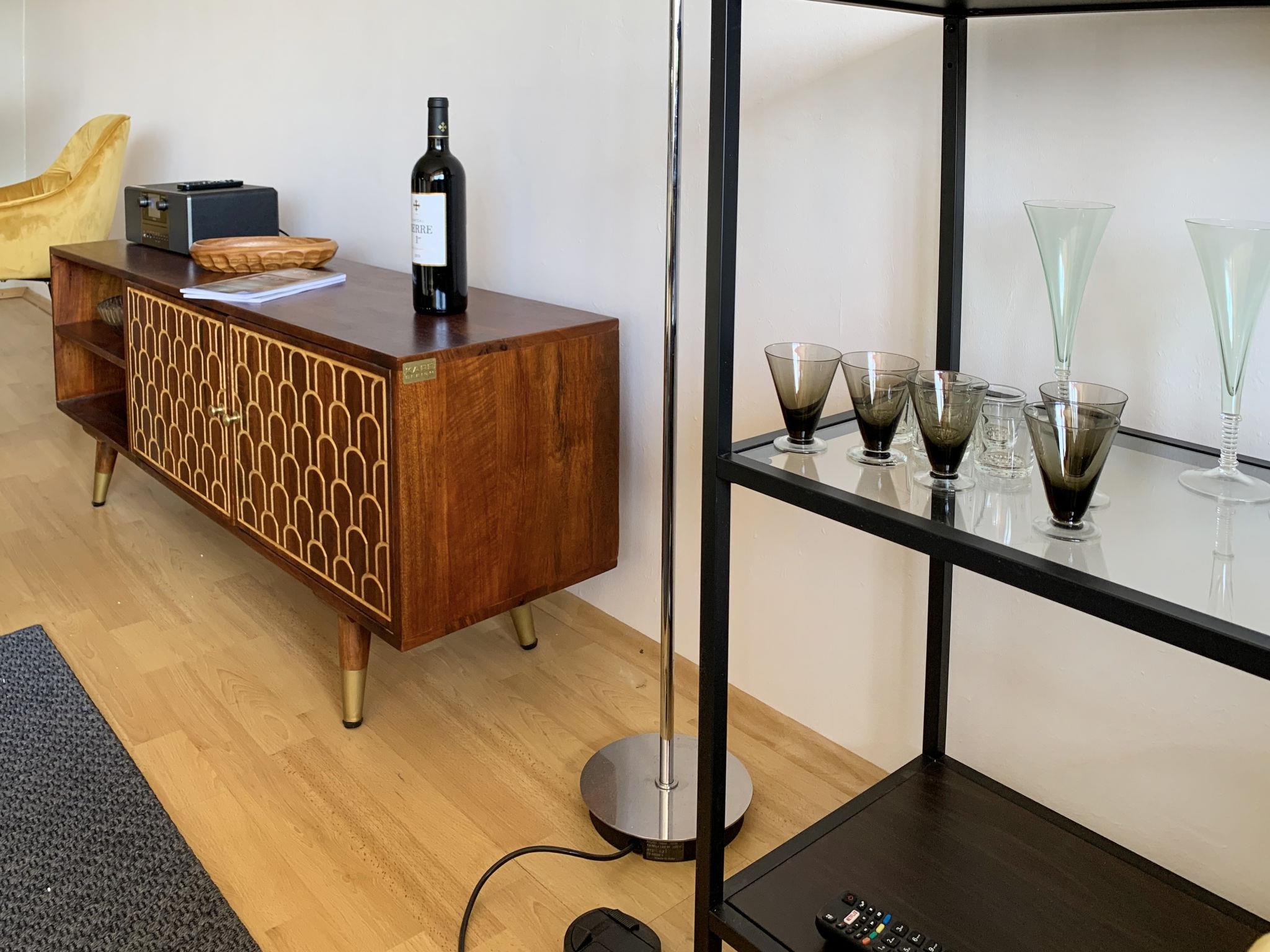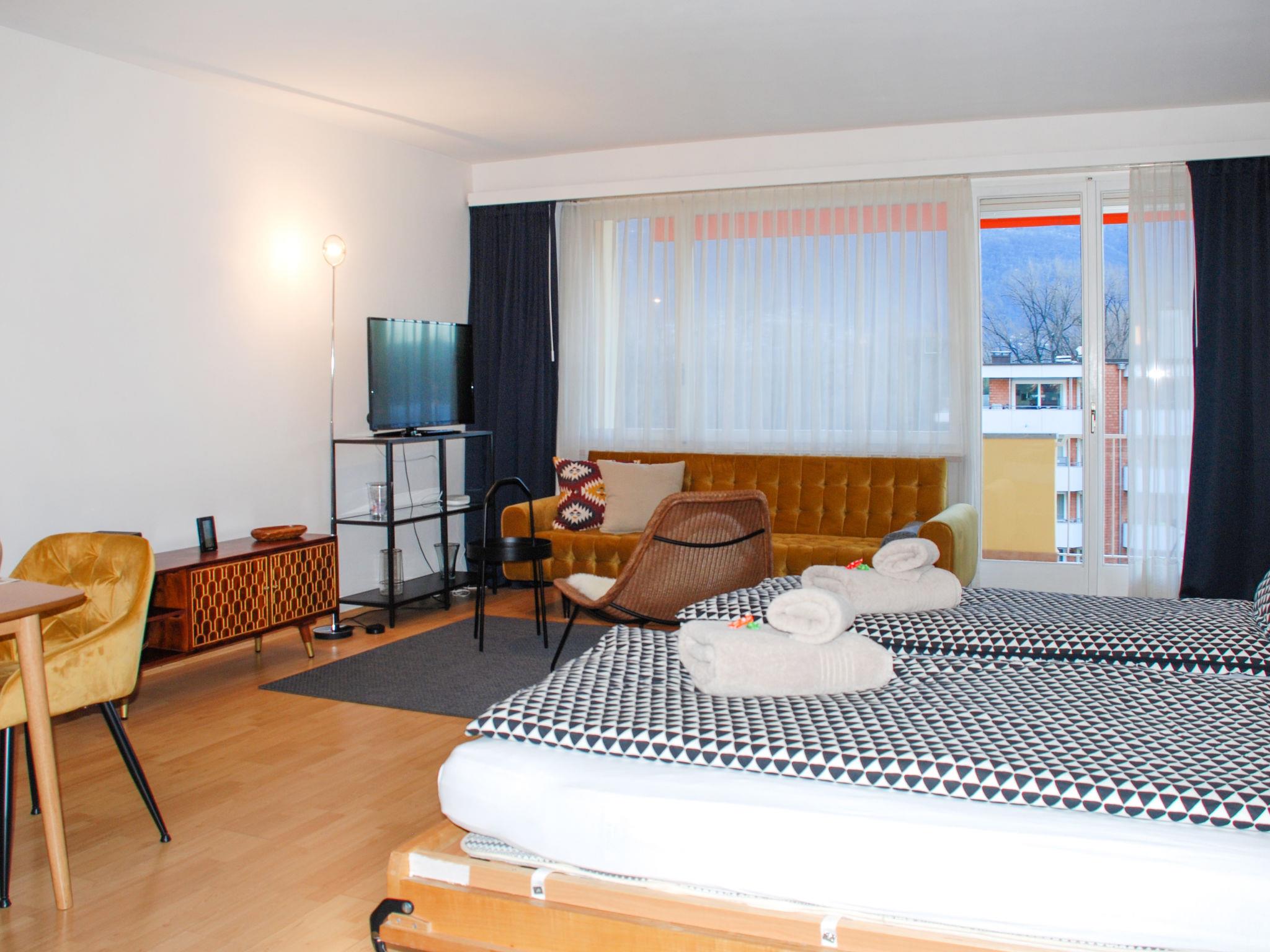 "Residenza Lido Appartment 601", 1-room apartment 50 m2 on 6th floor, south-west facing position. Spacious and bright, partly renovated in 2021, comfortable and modern furnishings: open large living/sleeping room with 2 fold-away beds (90 cm, length 190 cm), dining table, cable TV, international TV channels, flat screen, radio, CD-player and hi-fi system. Exit to the balcony. Kitchen (oven, dishwasher, 4 ceramic glass hob hotplates, toaster, kettle, electric coffee machine, Capsules for coffee machine (Nespresso) extra). Bath/WC. Heating. Balcony. Balcony furniture, deck chairs (2). Side view of the lake, the mountains, the garden, the countryside, the resort and Lido di Locarno. Facilities: iron, hair dryer. Internet (WiFi, free). Please note: non-smokers only. NL-00004294