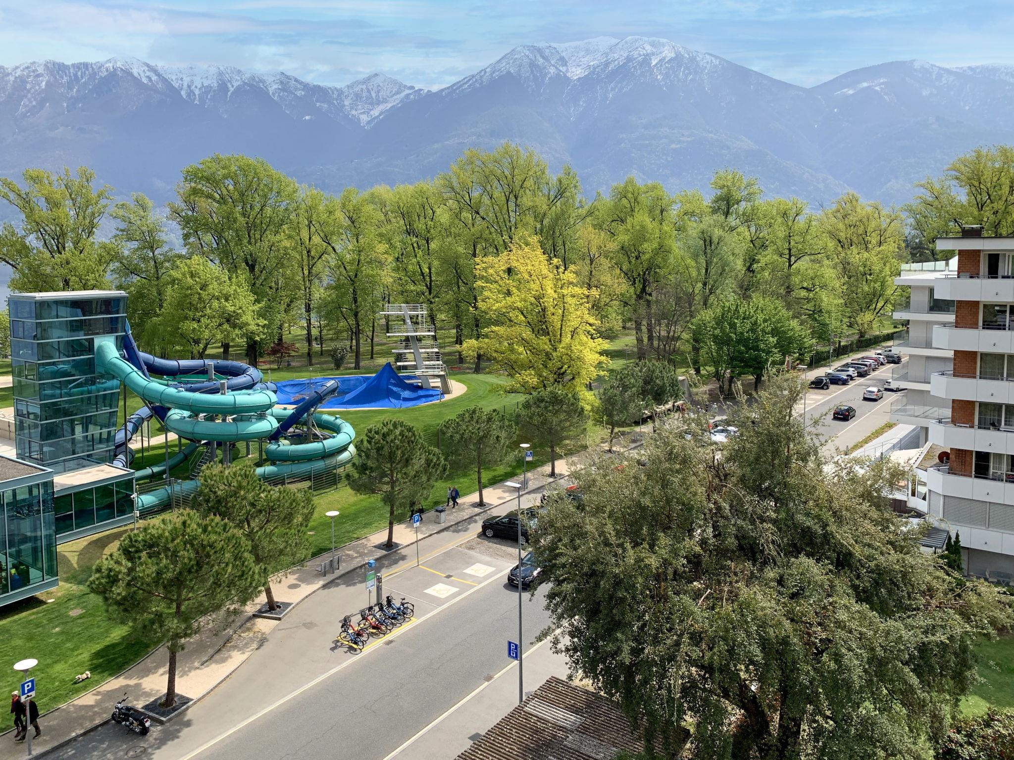 Locarno: Large, comfortable apartment block "Residenza Lido", 6 storeys, surrounded by trees and meadows. On the outskirts, 1.8 km from the centre of Piazza Grande, in a sunny position, excellent location: right in the centre but still quiet, 50 m from the lake, in the countryside. In the house: reception, lounge, lift, roof terrace, central heating system. Motor access to the house. Public parking 100 m on the road extra. Shop 1.1 km, grocery 1.1 km, restaurant, café 80 m, 15 minute walk to the centre, bus stop "Linie 3 + 4" 50 m, railway station "Locarno SBB-CFF" 3 km, outdoor swimming pool, indoor swimming pool 50 m, thermal baths "Termali & Salini" 80 m, public bathing area 50 m. Golf course (18 hole) 6 km, tennis 400 m, minigolf 2 km, walking paths from the house 50 m. Well-known lakes can easily be reached: Lago Maggiore, Lago di Lugano, Lago di Como. Hiking paths: Cardada, Monte Verità, Centovalli, Vallemaggia, Valle Onsernone, Valle Verzasca. Please note: not suitable for small children. Not suitable for children under 14 years. The keys‘ handover takes place by the agency Interhome in Locarno (1km). Property ref. CH6600.410 is situated on the same property.