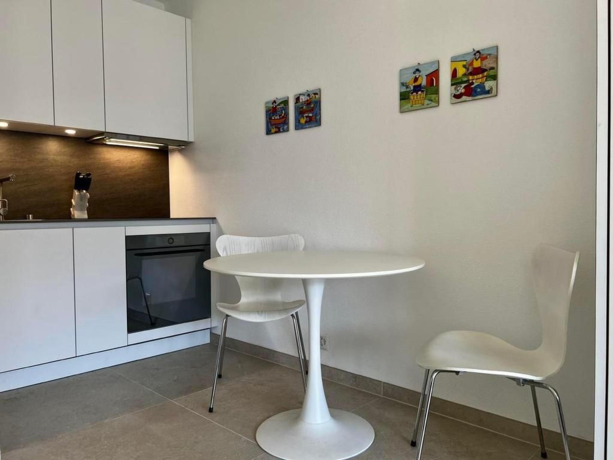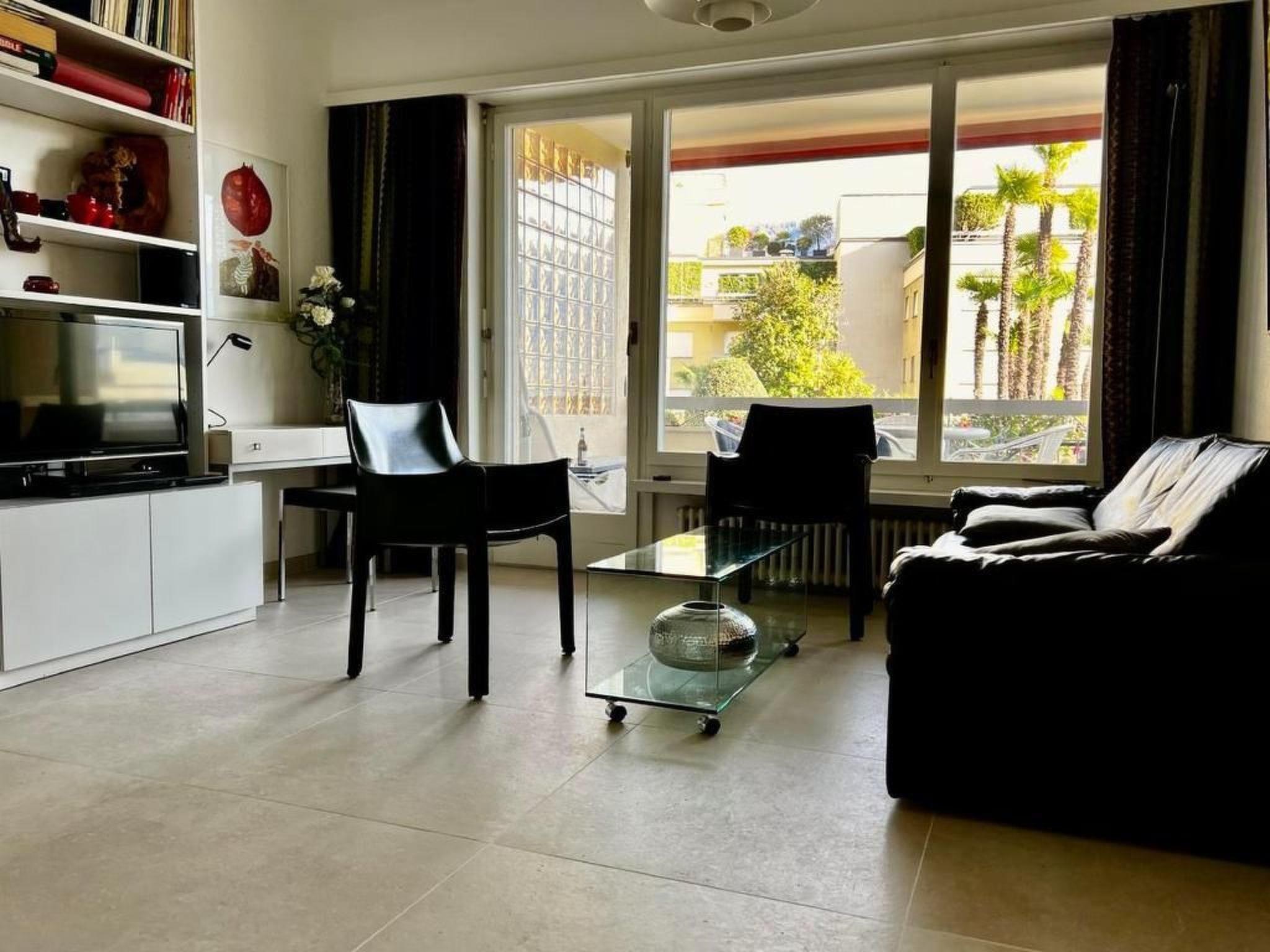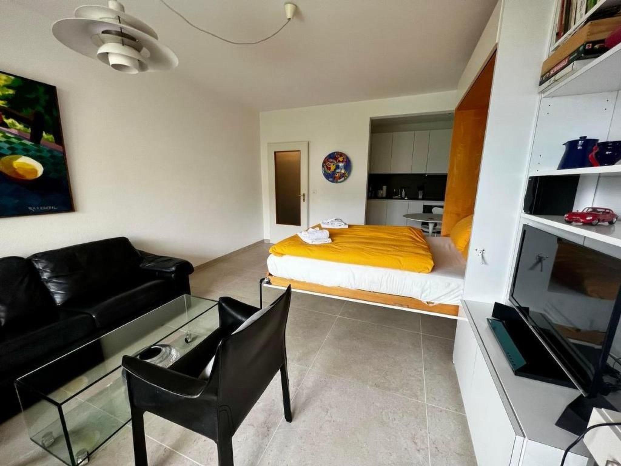 The newly renovated 1½ room flat on the ground floor of the Condominio Fiori residential complex is in a central location with direct access to the Locarno - Orselina mountain railway. The town with the Piazza Grande, old town, lake, railway station, shops and restaurants are just a 5-10 minute walk away. From the flat's large balcony you can enjoy the idyll of the subtropical garden, the view of the mountains and a small part of the lake. The flat is approx. 30m2 plus balcony and can comfortably accommodate two people. It comprises a living room/bedroom with dining table and opening onto the kitchen, a hallway with built-in wardrobe and a bright bathroom with walk-in shower and washbasin. The interior is characterised by very appealing, high-quality modern furnishings. A fold-out wardrobe bed and a sofa bed (140x200 each) are available as sleeping accommodation. The comfort includes a stereo system (CD, tape, radio), TV with DVD, Wifi Internet, dishwasher, fridge-freezer, ceramic hob, oven, steam extractor, toaster, Nespresso coffee machine, kettle, fondue set, sufficient crockery, pots and pans, etc. Bed, bath and kitchen linen are provided. A car parking space belongs to the flat. A covered parking space can be rented on request. A cot and fan can be provided. The infrastructure of the four buildings of Condominio Fiori includes a large, ozone-cleaned indoor swimming pool with massage jets, solarium, spacious communal hall, showers, table tennis room, communal laundry room with washing machine & tumble dryer, lift and a very well-kept, subtropical garden with sunbathing lawn. The flat can also be rented on a monthly basis.