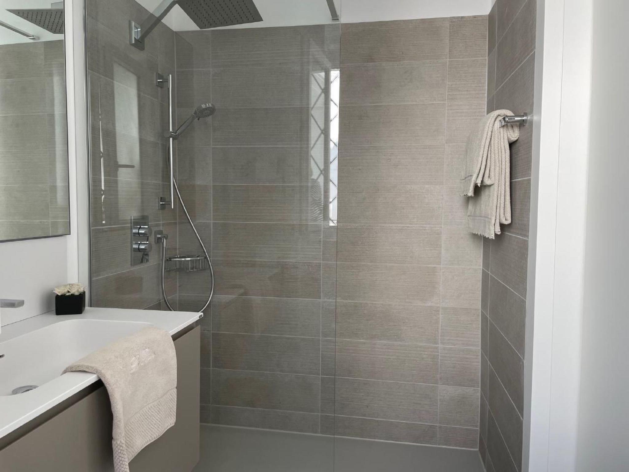 - Bathroom: Spacious walk-in shower, WC, cabinet with integrated sink, and large mirror.
