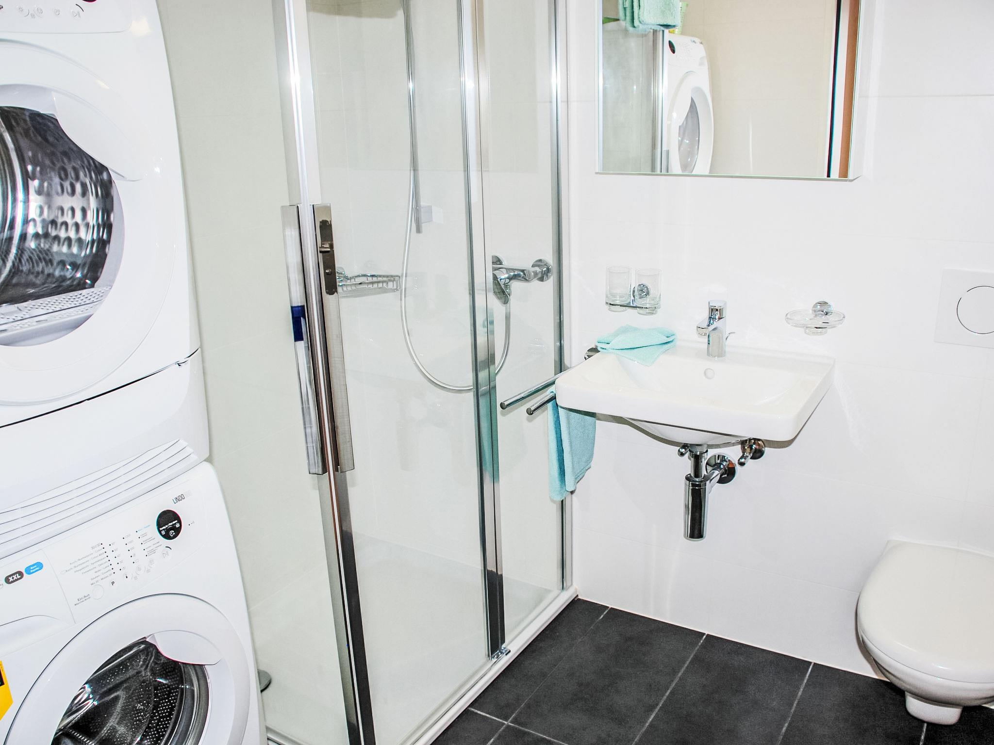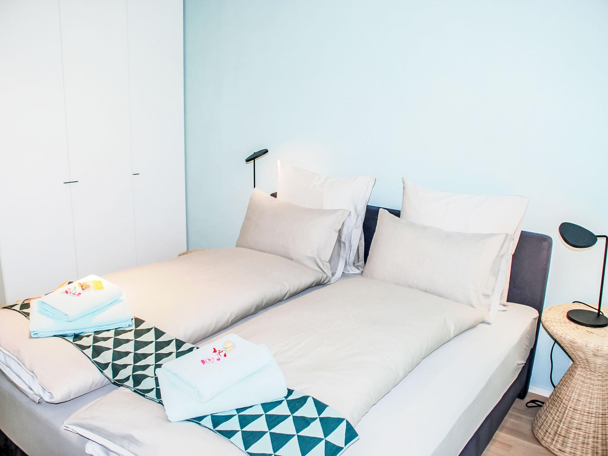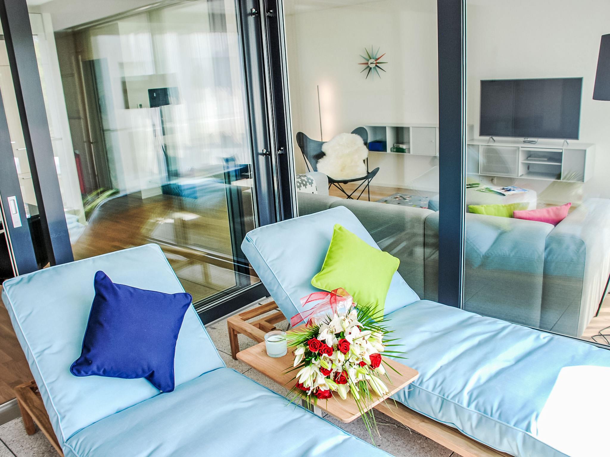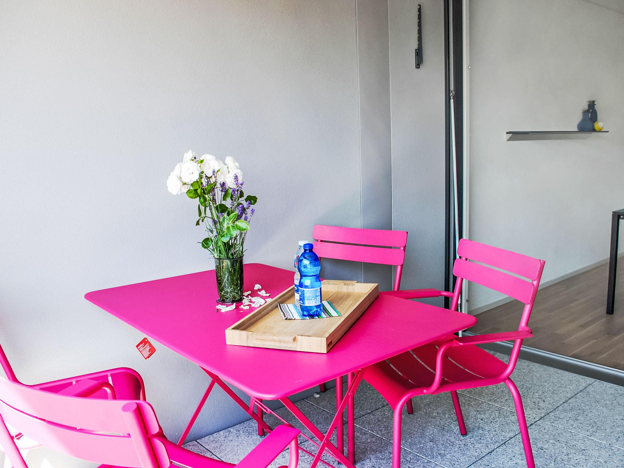 "LaVille A-2-3", 3-room apartment 89 m2 on 2nd floor, south-west facing position. Spacious and bright, modern and tasteful furnishings: open large living/dining room with satellite TV and flat screen. 1 double bedroom with 1 double bed (2 x 90 cm, length 200 cm). 1 room with 2 beds (90 cm, length 200 cm). Open kitchen (oven, dishwasher, 4 induction hot plates, freezer, electric coffee machine, Capsules for coffee machine (Nespresso) extra) with dining table. Exit to the balcony. Bath/WC, shower/WC. Floor heating. Balcony 9 m2, south facing position and west facing position. Balcony furniture, deck chairs (1). View of the mountains and the countryside. Facilities: washing machine, dryer, iron, children's high chair, baby cot for up to 2 year olds (extra), hair dryer. Internet (WiFi, free). Parking space n 49 (extra), height 210 cm, width 230 cm. Please note: non-smokers only. NL-00006855