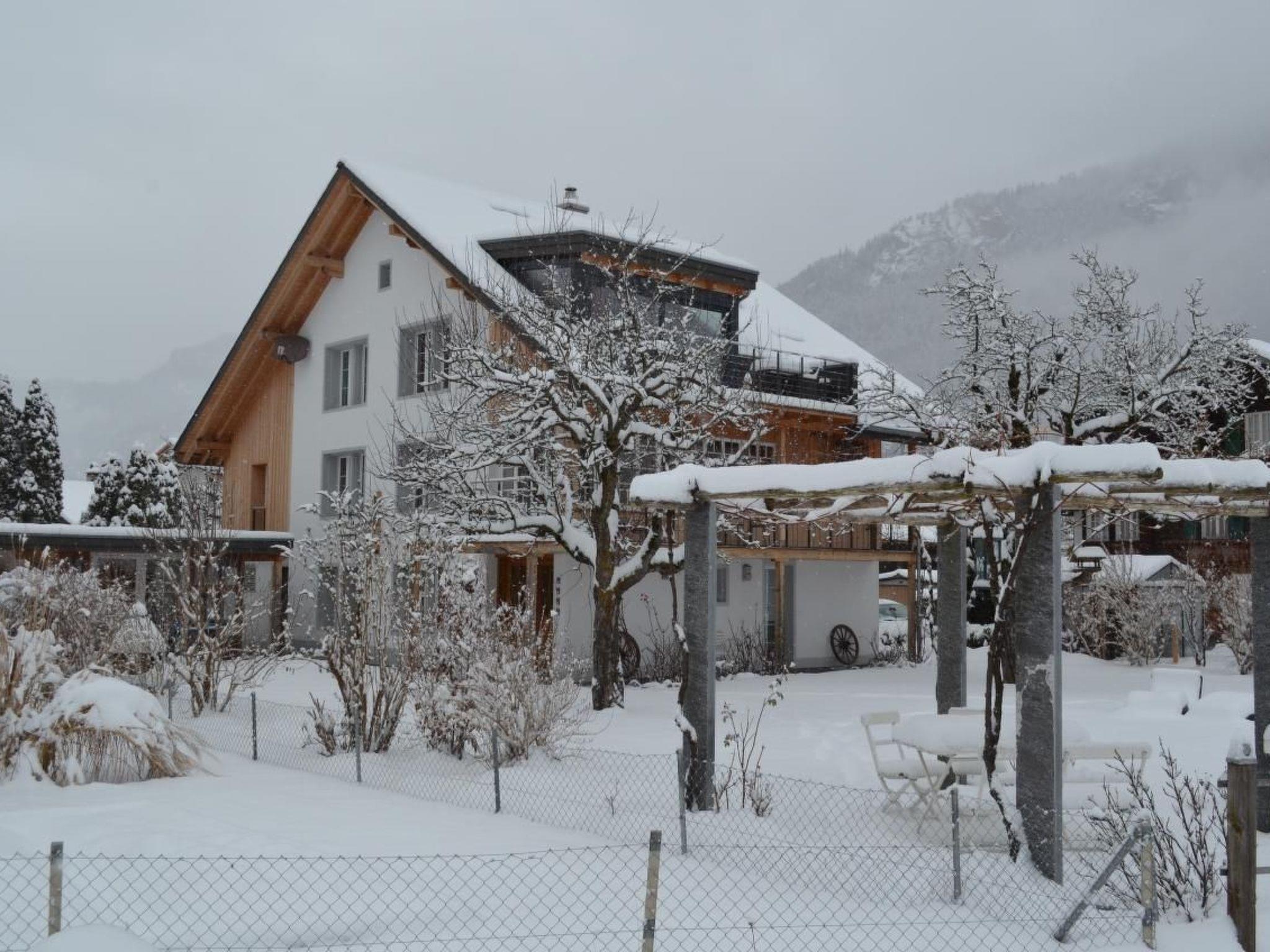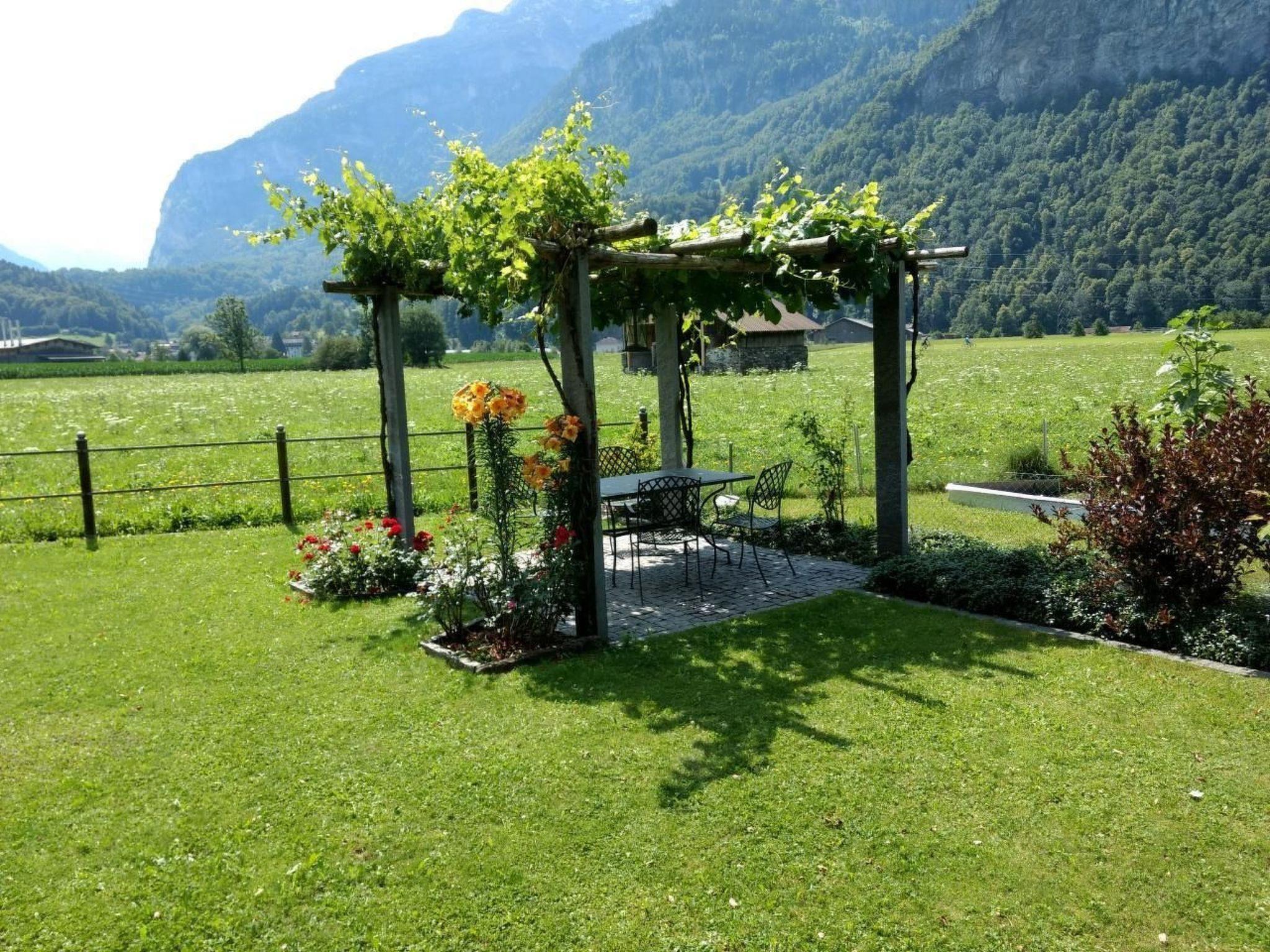 Ground floor apartment in multiple family chalet in a quiet location on the outskirts of Meiringen. Nice kitchen/dining room with oven, dishwasher, fridge/freezer & microwave, coffeemaker, toaster and electric kettle, raclette device, caquelon for cheese fondue, hand blender, fully equiped. WLAN (free) Living room with swedish stove, satellite TV, radio, sofa bed in living room. Double bedroom. Bathroom with shower and toilet. Suitable for families. Separat entrance. Seating area in garden, outdoor table/chairs, grill. Laundry room with washing machine and dryer, iron and iron board available for use (free). Apartment has separate entrance. Private carpark. Apartment size = 43 m2. Beautiful garden with mountain view, playground with sand pit, playhouse and swing. Cot for baby/toddler available.