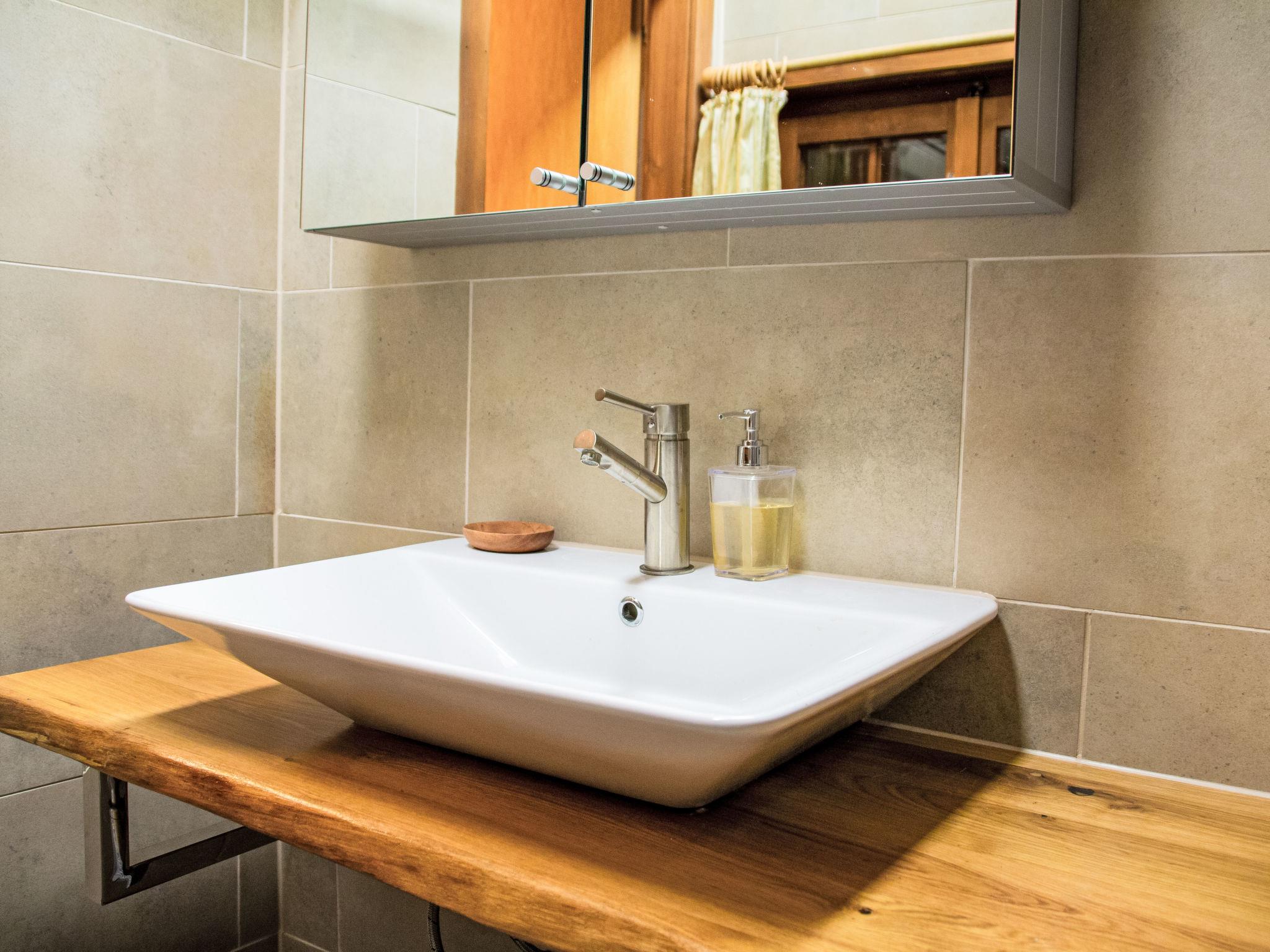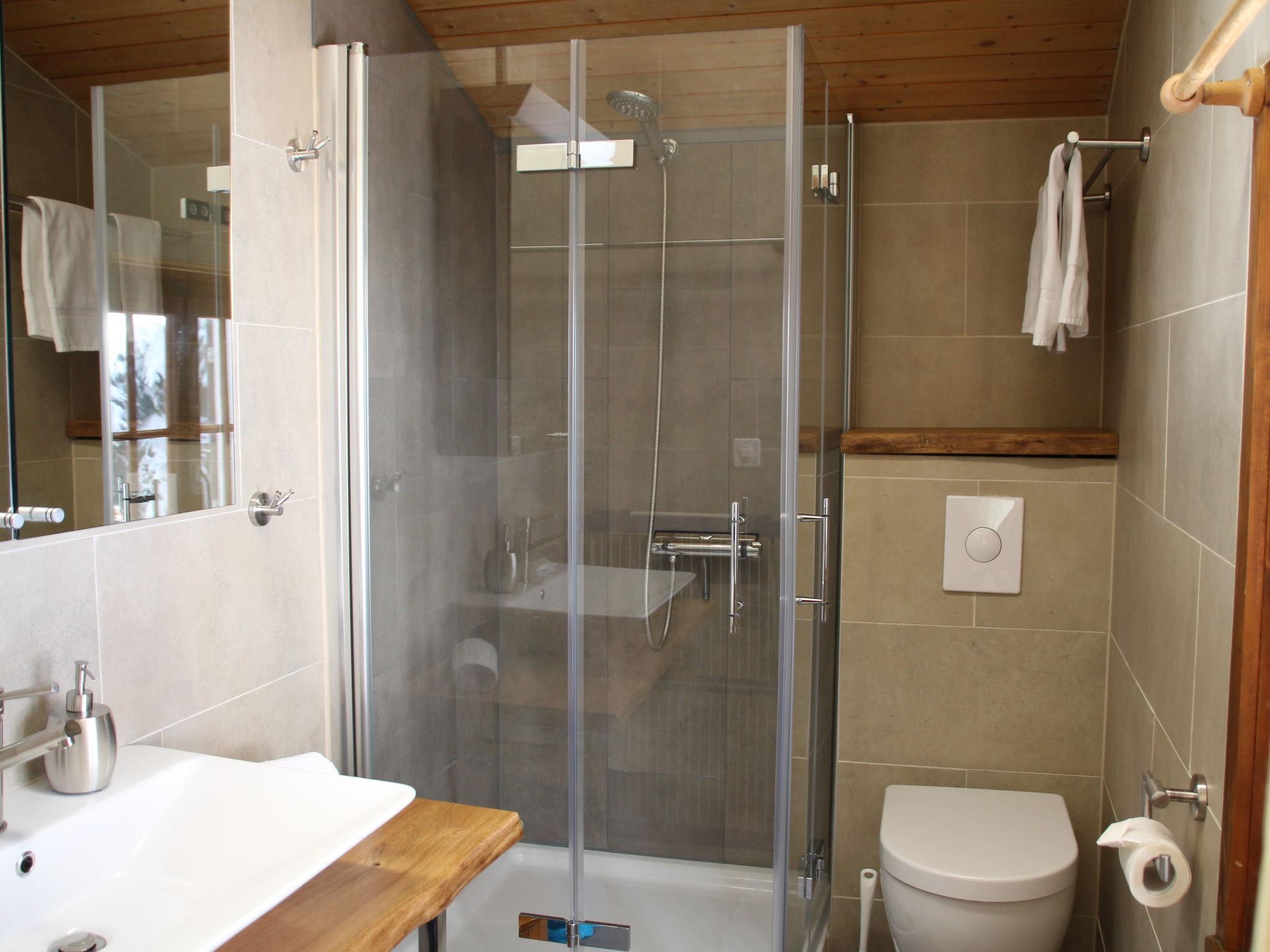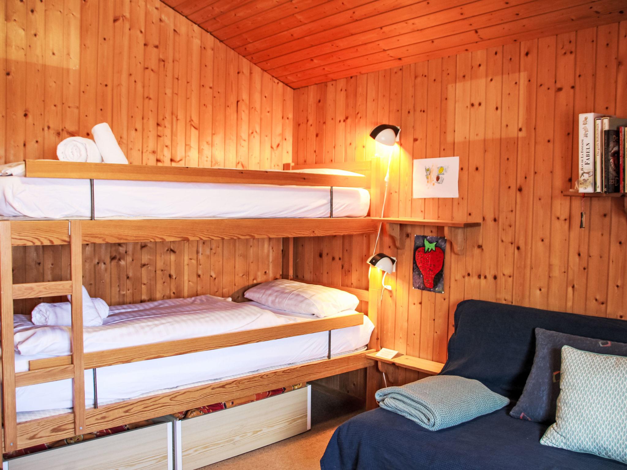 "Henri", 3-room chalet 85 m2. Wooden furniture furnishings: living/dining room with open-hearth fireplace. Exit to the terrace. Open kitchen (4 hot plates, oven, dishwasher, toaster, kettle, electric coffee machine, raclette grill, fondue Set (cheese)). Exit to the terrace. Upper floor: 1 room with 1 double bed (2 x 90 cm, length 200 cm). 1 children's room with 1 sofabed (140 cm, length 200 cm), 1 x 2 bunk beds (90 cm, length 200 cm). Shower/WC, double hand-basin. Electric heating. Terrace, south facing position. Terrace furniture, barbecue. Very beautiful view of the mountains and the countryside. Facilities: washing machine, dryer. Parking at 50 m. Please note: non-smokers only.