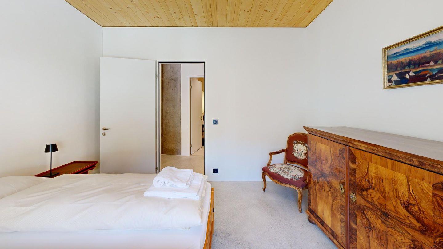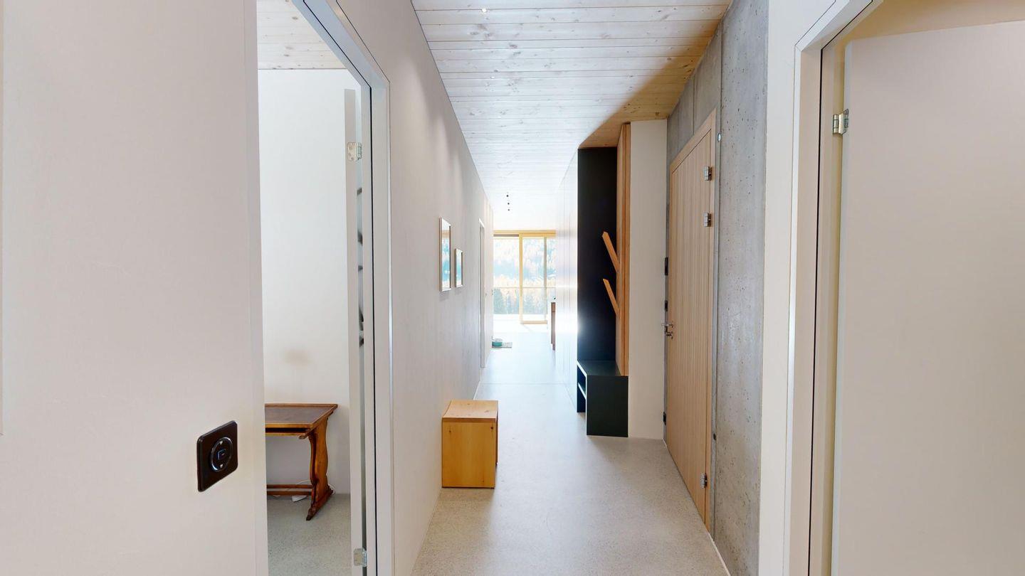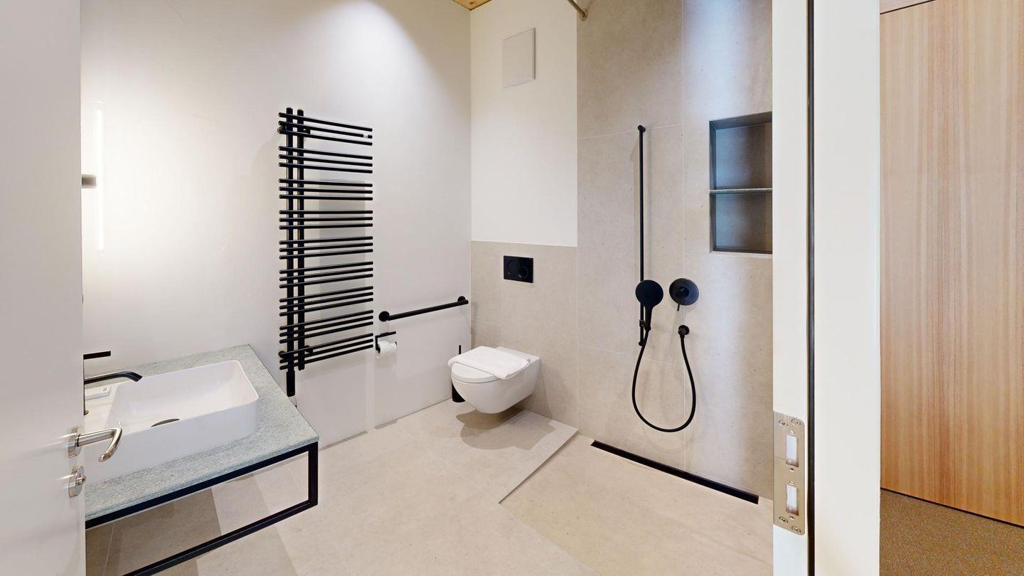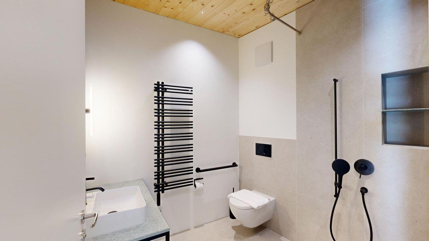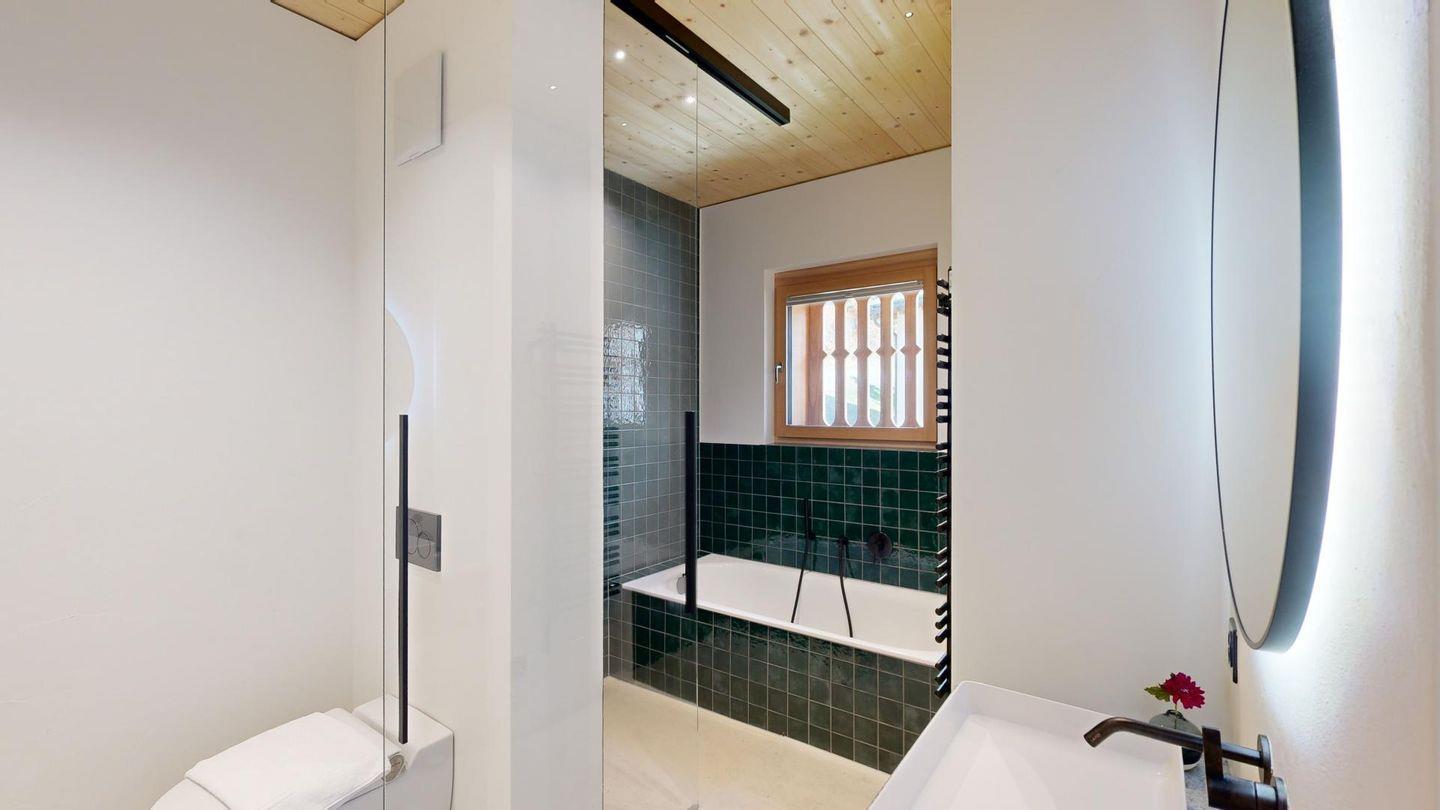 Die Ferienwohnung verfügt über ein grosszügiges Wohn-Esszimmer und direktem Zugang zu einem überdachten Balkon, der dazu einlädt, die frische Bergluft und die spektakuläre Aussicht zu geniessen. Zwei komfortable Schlafzimmer bieten Platz für 4 Personen. Die luxuriös ausgestatteten Badezimmer, eines davon en-suite einschließlich Badewanne garantieren höchsten Komfort. 1 Badezimmer ist behindertengerecht ausgeführt.