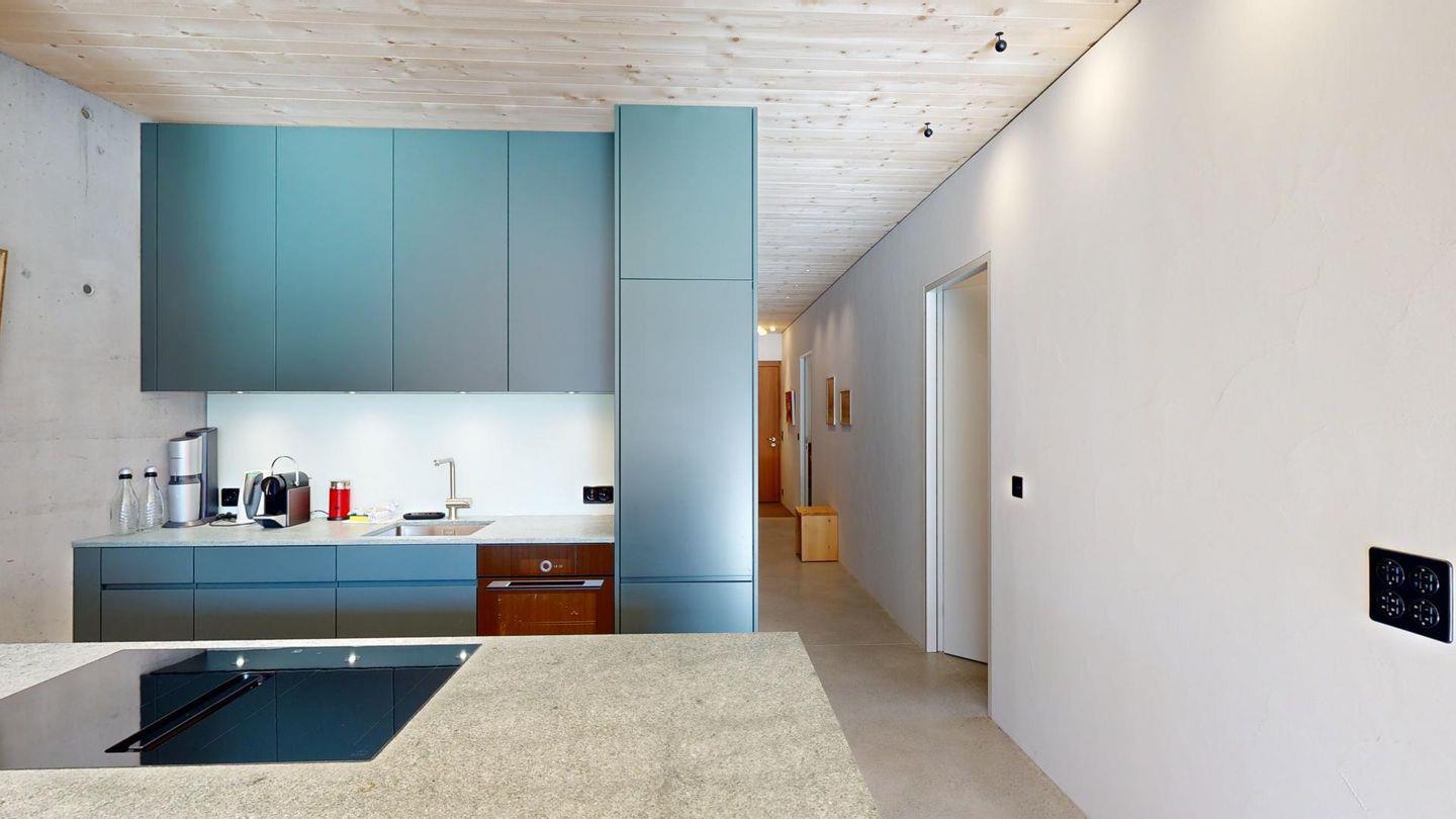 Die voll ausgestattete Küche mit Blick ins Roseg Tal und in die Bergkulisse lässt keine Wünsche offen.Optionaler Zugang zum Spa machen den Urlaub zum perfekten Erlebnis.