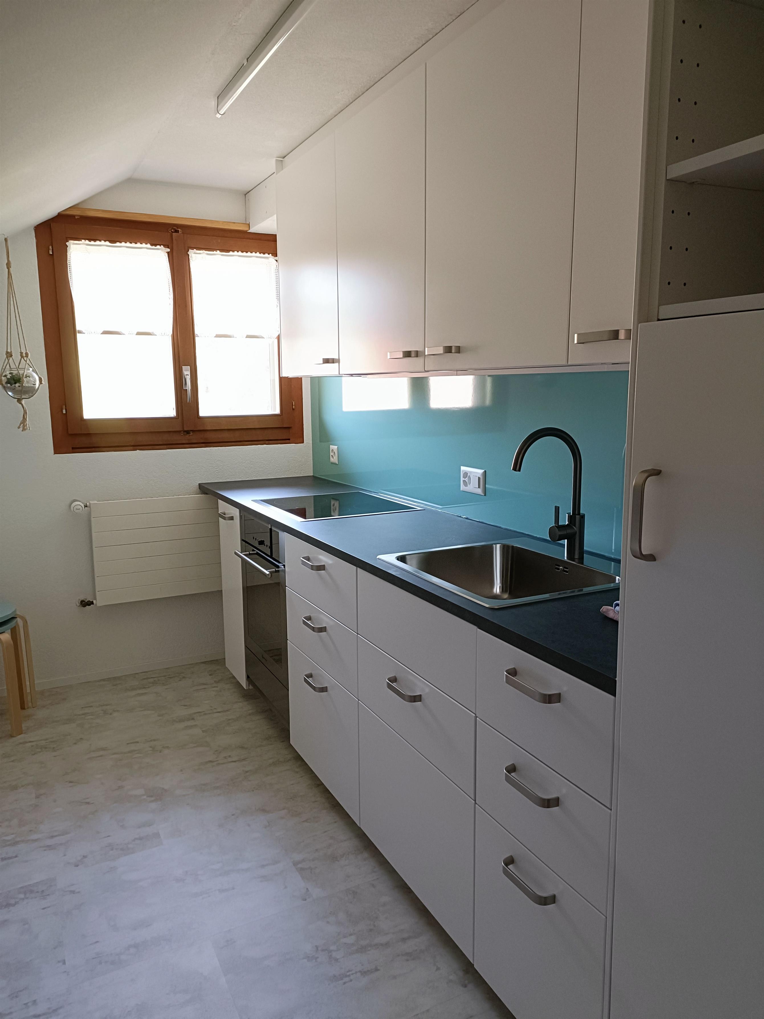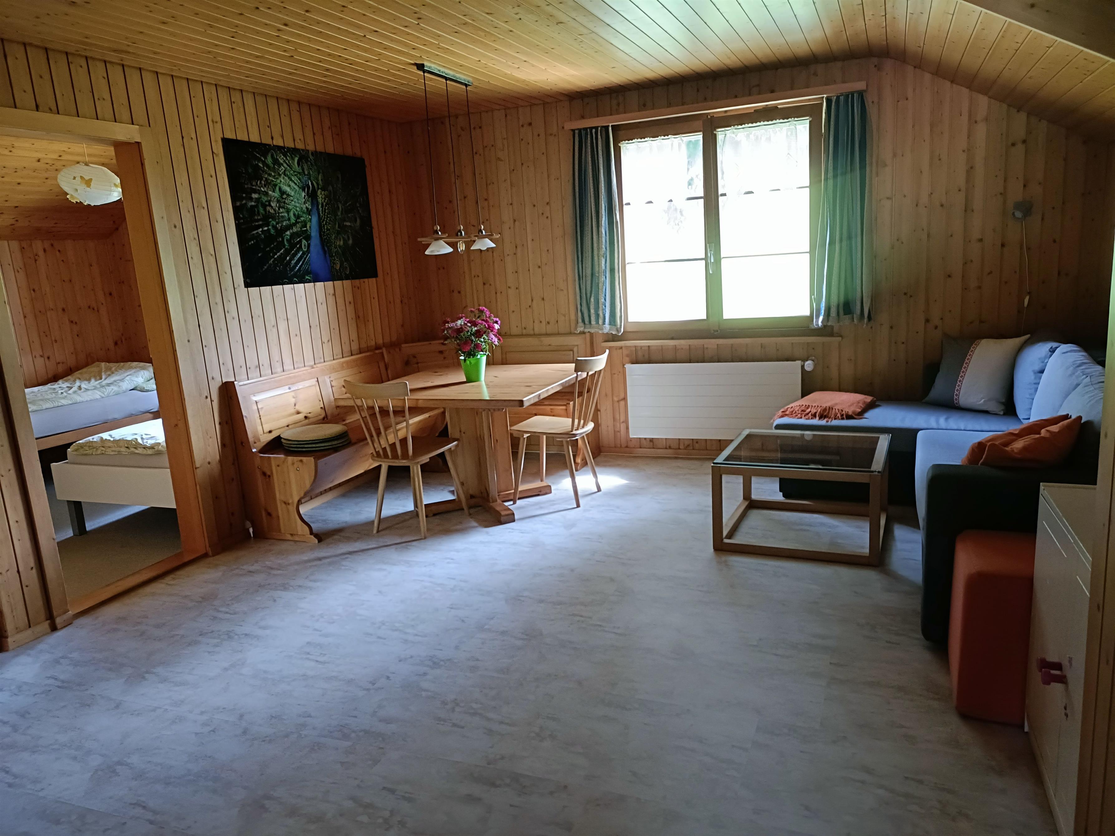 We rent out a cosy holiday flat on the second floor of the Stöckli next to the farmhouse. It comprises two bedrooms, a lounge with a round dining table, a small kitchen and a bathroom with WC and shower. Ideal for a family of four to five people.