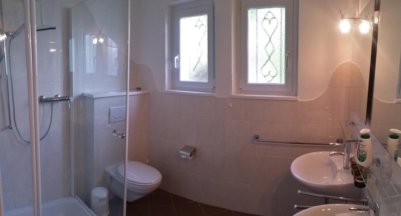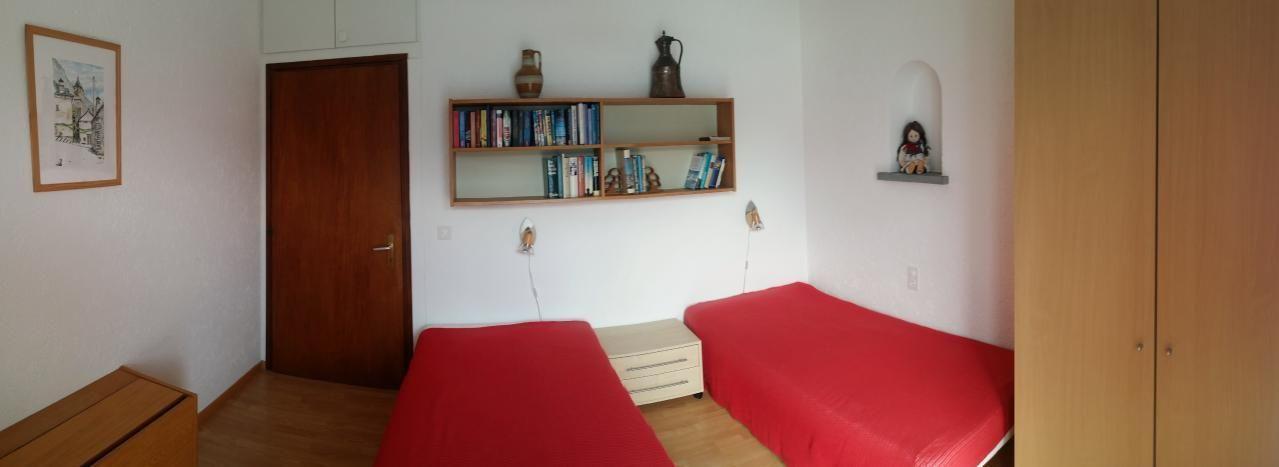 Our small holiday home has two flats, the upper one is available for rent. It is ideal for two, maximum four holiday guests. The holiday flat is reasonably priced, as you bring your own bed linen and take care of the final cleaning. It is practically furnished and fully equipped to ensure you have a carefree stay. The living room is furnished with a dining table, four chairs, two upholstered armchairs that function as single beds, a side table, wardrobe and a TV with satellite reception. The kitchen has a ceramic hob, oven, fridge and various coffee machines as well as a raclette and fondue set - everything you need for culinary delights. The bedroom has two single beds, a wall-mounted wardrobe and a chest of drawers, while the bathroom with two washbasins, WC and shower leaves nothing to be desired.