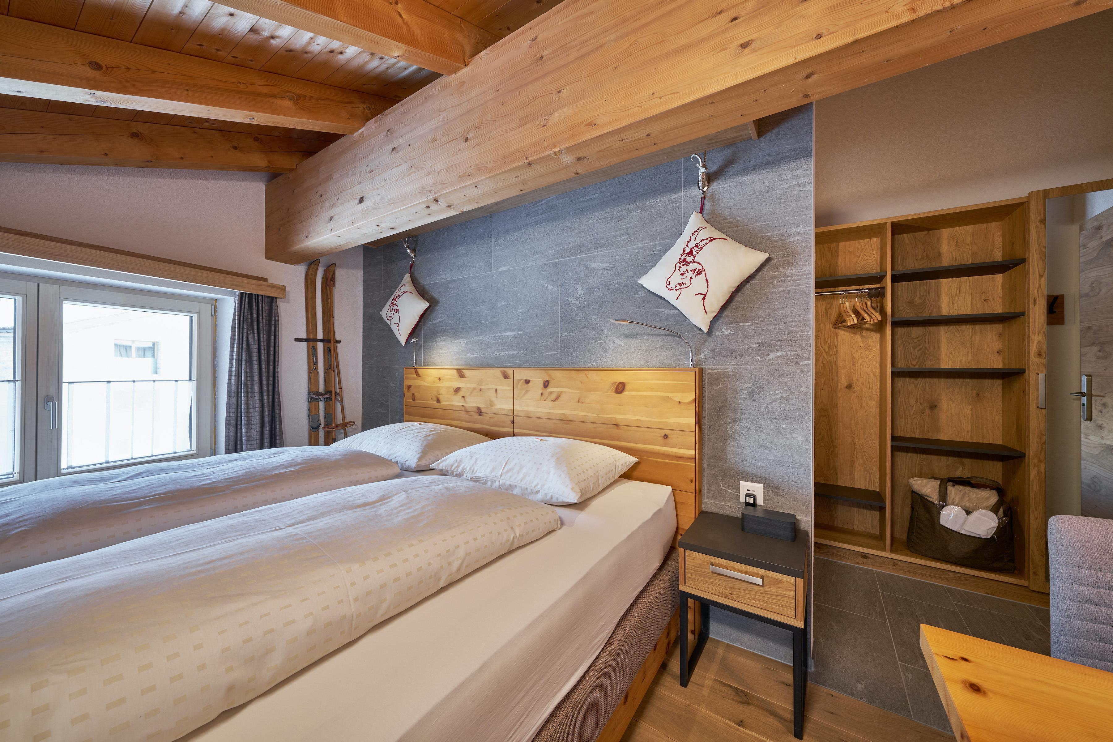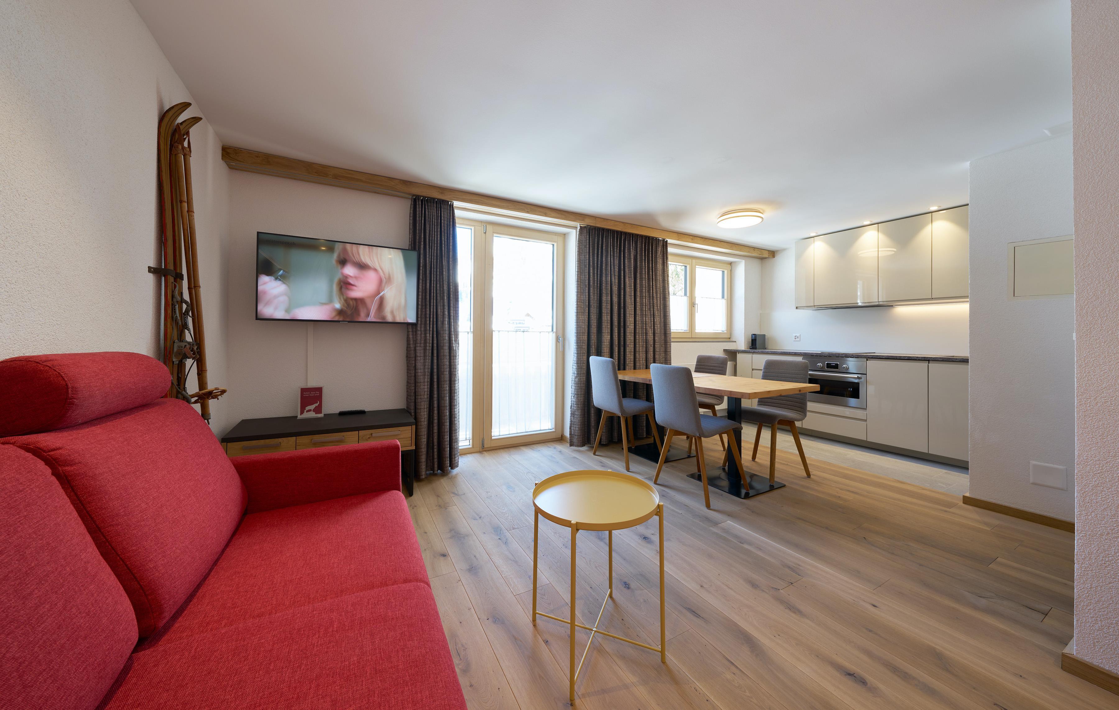 Our spacious "Grischuna Apartments Superior" are designed in alpine chic, are located on the first and second floor and offer comfortable space for 4 people. From the balcony - equipped with photovoltaic railings - you can enjoy an impressive view of the village and mountains.
