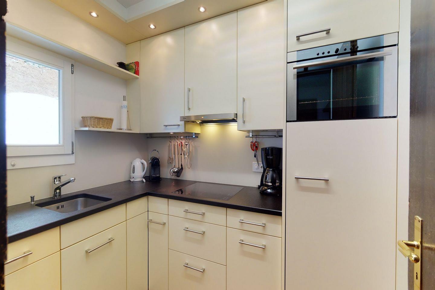 Vom geräumigen Wohnzimmer mit Kamin gelangt man auf den sonnigen Balkon, der Richtung Süden zeigt. Das Wohnzimmer besteht aus einer gemütlichen Essecke und einer Polstergruppe. Die Wohnung verfügt über zwei Schlafzimmer. Das Elternschlafzimmer verfügt über ein Doppelbett und das Kinderzimmer über zwei Einzelbetten mit einer dritten Schlafmöglichkeit. Die moderne Küche ist komplett ausgestattet. Ein Badezimmer bietet eine Badewanne, bei dem anderen handelt es sich um ein Gäste WC.