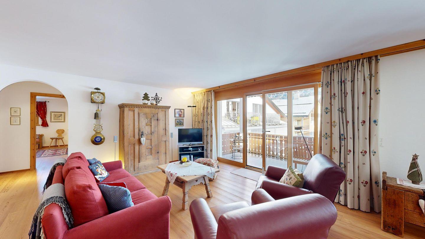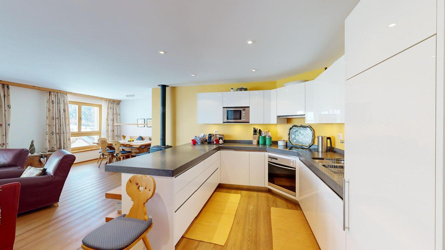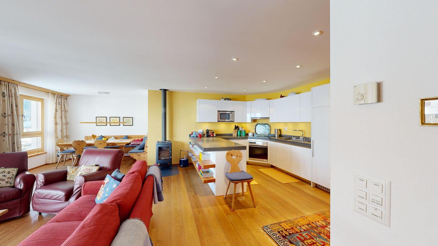 Das grosszügige Wohn- und Esszimmer mit offener, voll ausgestatteter Küche lädt zu entspannten Stunden in einem ansprechend gestalteten, hochwertigen Ambiente ein. Der warme Holzparkettboden und die geschmackvolle Einrichtung verleihen der Wohnung eine behagliche Atmosphäre. Von den Fenstern und dem Balkon aus geniessen Sie einen traumhaften Ausblick auf den Corvatsch, der Sie sofort in die alpine Stimmung versetzt.