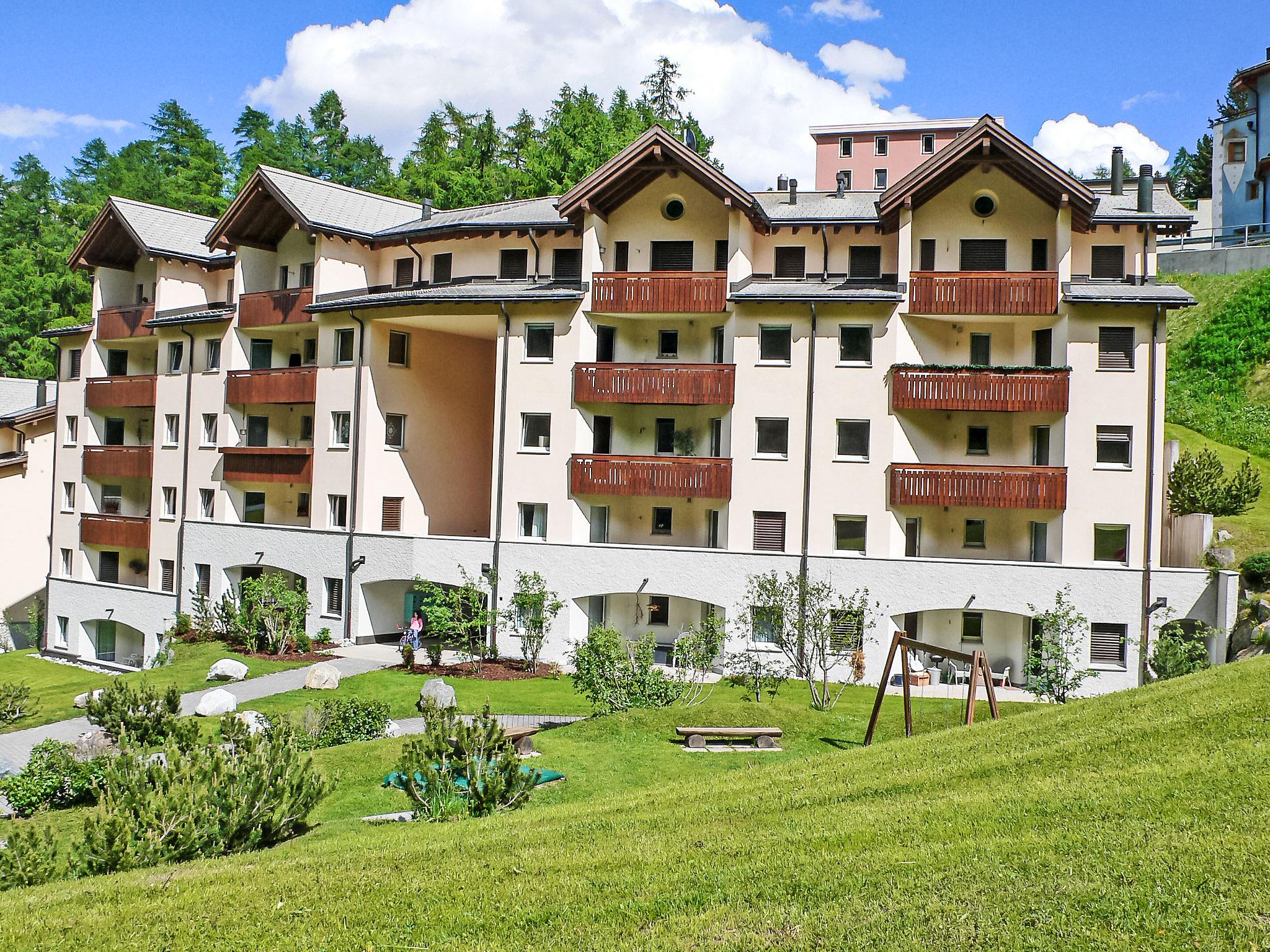 St. Moritz-Dorf: Beautiful apartment house "Chesa Flora". On the outskirts, 700 m from the centre of St. Moritz Dorf, on a slope, in the residential district, 1.7 km from the lake, 2.1 km from the skiing area, in a cul-de-sac. Private: children's playground (slide, sandbox). In the house: lift, storage room for skis, central heating system. Communal covered parking. Shop 500 m, grocery 800 m, supermarket 1.9 km, restaurant 220 m, bar 800 m, bakery 1 km, café 1 km, pedestrian zone 700 m, bicycle rental 2.4 km, bus stop "St. Moritz, Bären" 220 m, railway station "St. Moritz" 1.6 km, indoor swimming pool 2.8 km, thermal baths "Heilbadzentrum St. Moritz" 3 km, lake St. Moritzer See 1.7 km. Golf course (9 hole) 800 m, surf school 7.4 km, tennis 3.1 km, indoor tennis centre 3.1 km, minigolf 2.8 km, riding stable 4.4 km, walking paths from the house 200 m, cycle lane 2.8 km, cable car 3 km, mountain railway 950 m, ski lift 950 m, slopes 2.1 km, ski rental 950 m, ski bus stop 220 m, ski school, children's ski school 950 m, sled run 4.6 km, cross country ski track 2.8 km, ice rink 400 m, children's playground 2.9 km. Nearby attractions: Segantini Museum 1.7 km, Engadiner Museum 1.5 km, Mili Weber-Haus 4.5 km, Olympia Bob Run mit Museum 380 m, Nietzsche Museum in Sils-Maria 11.7 km. Well-known ski regions can easily be reached: Corviglia Piz Nair 2.1 km, Corvatsch - Furtschellas 8.6 km, Diavolezza - Lagalb 18.6 km. Well-known lakes can easily be reached: St. Moritzer See 1.7 km, Silvaplaner See 7.4 km, Silser See 11.7 km. Hiking paths: Stazerwald & Stazersee, Corviglia Piz Nair, Muottas Muragl. The keys‘ handover takes place by the agency Interhome in St Moritz.