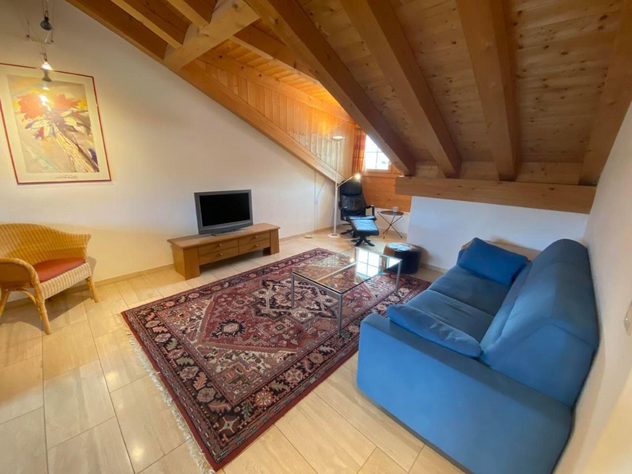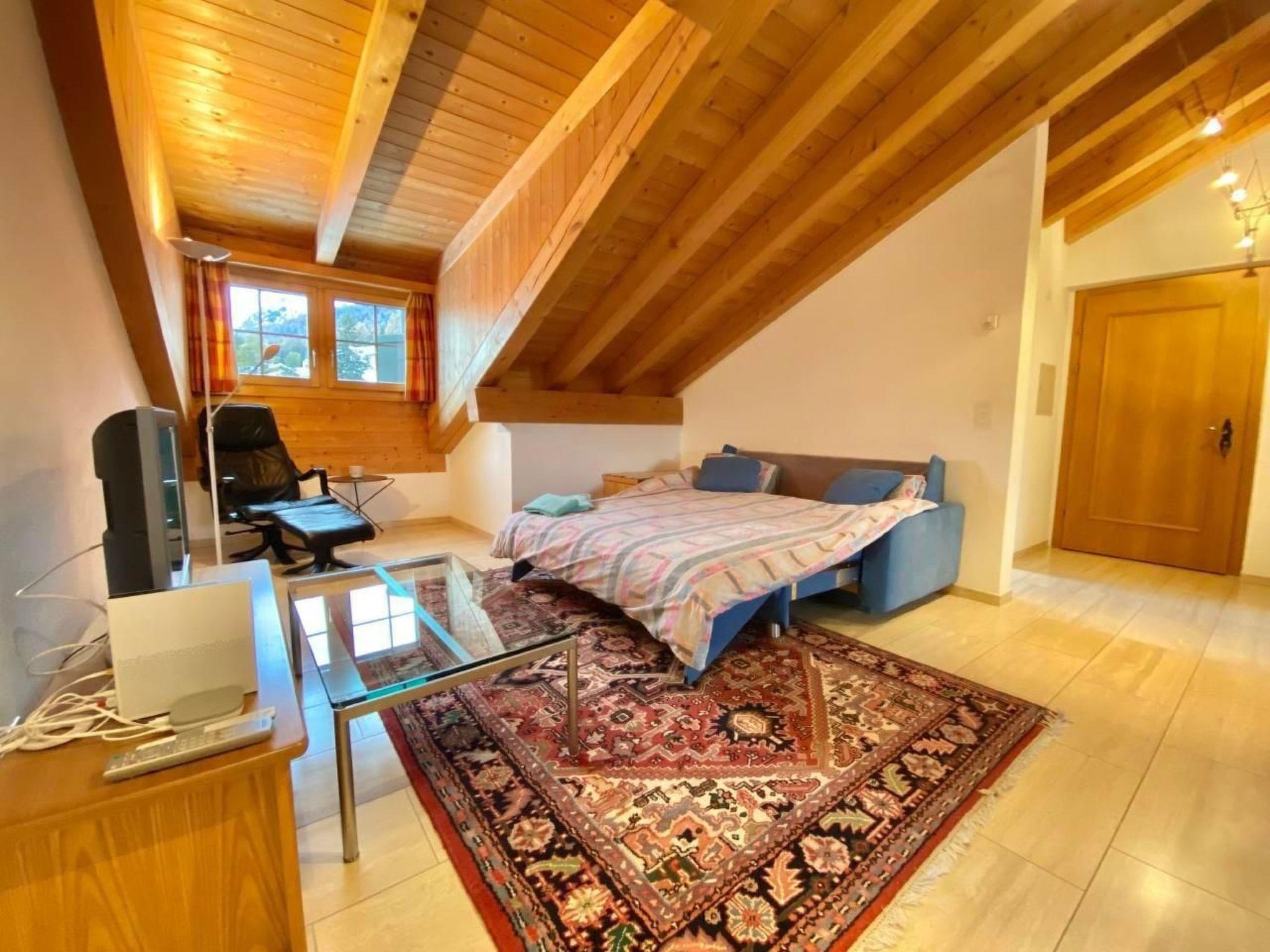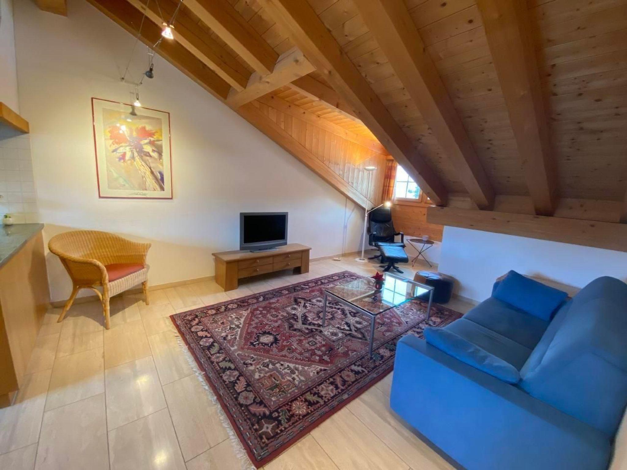 Inside, the flat has a spacious living and dining room, which is connected to a fully equipped open-plan kitchen, including a fondue and raclette set and a Nespresso machine. A comfortable sofa is available for cosy evenings, which can also be used as an extra bed for two people. The separate bedroom with double bed and the bathroom, equipped with a bathtub (shower only possible in sitting position), complete the room offer. Internet/WLAN and TV, which are available free of charge, provide entertainment.