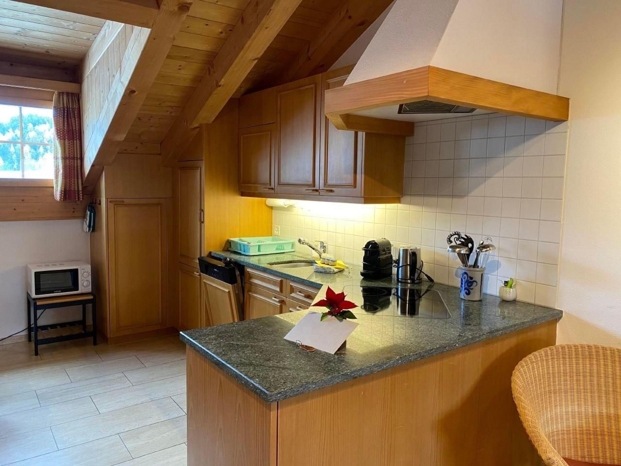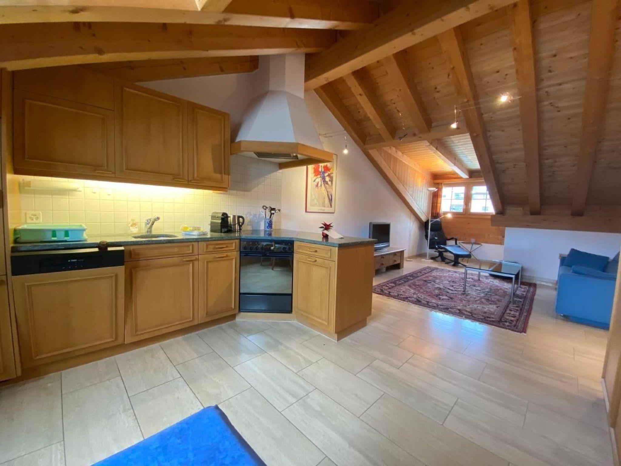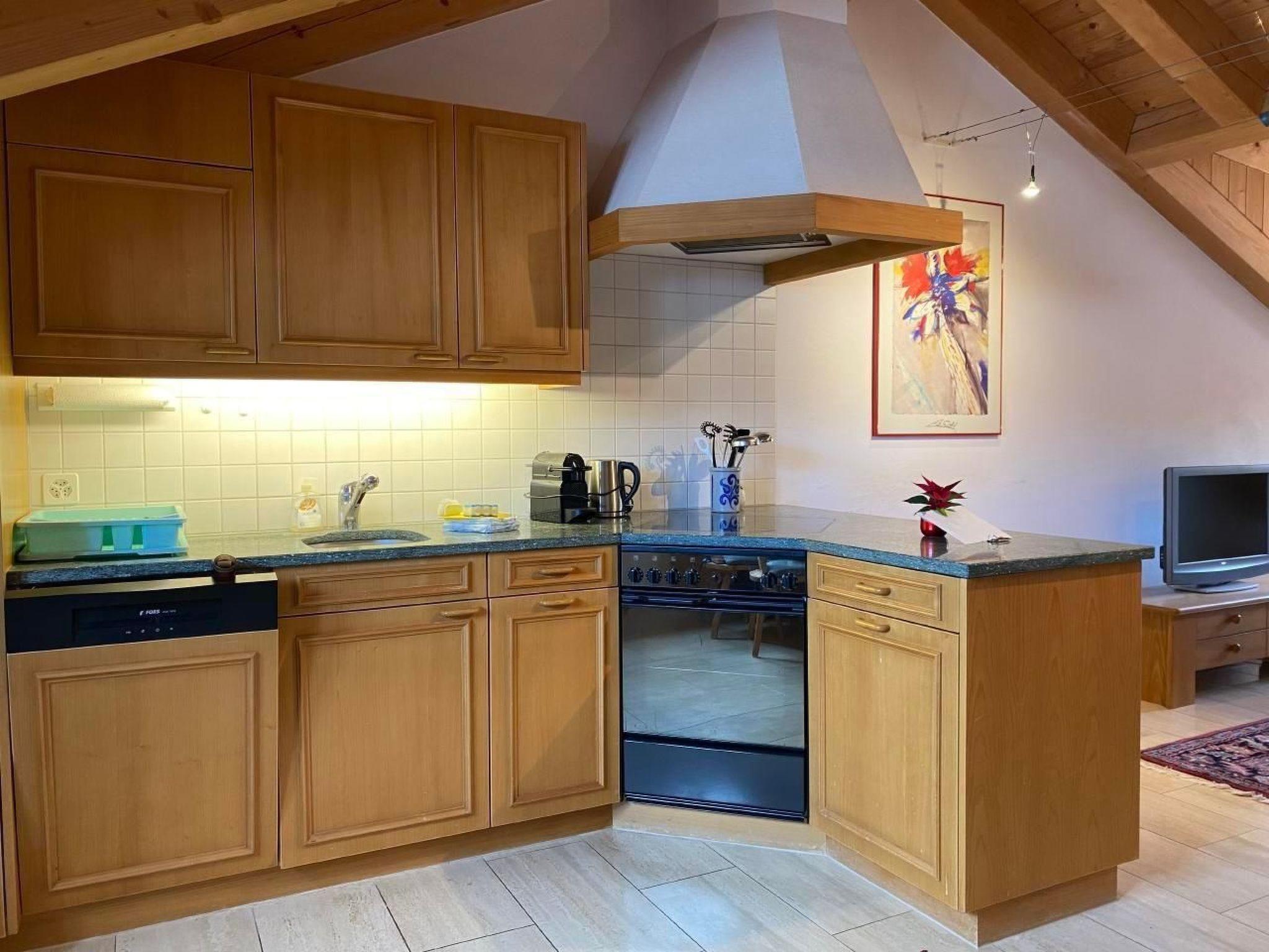 Inside, the flat has a spacious living and dining room, which is connected to a fully equipped open-plan kitchen, including a fondue and raclette set and a Nespresso machine. A comfortable sofa is available for cosy evenings, which can also be used as an extra bed for two people. The separate bedroom with double bed and the bathroom, equipped with a bathtub (shower only possible in sitting position), complete the room offer. Internet/WLAN and TV, which are available free of charge, provide entertainment.