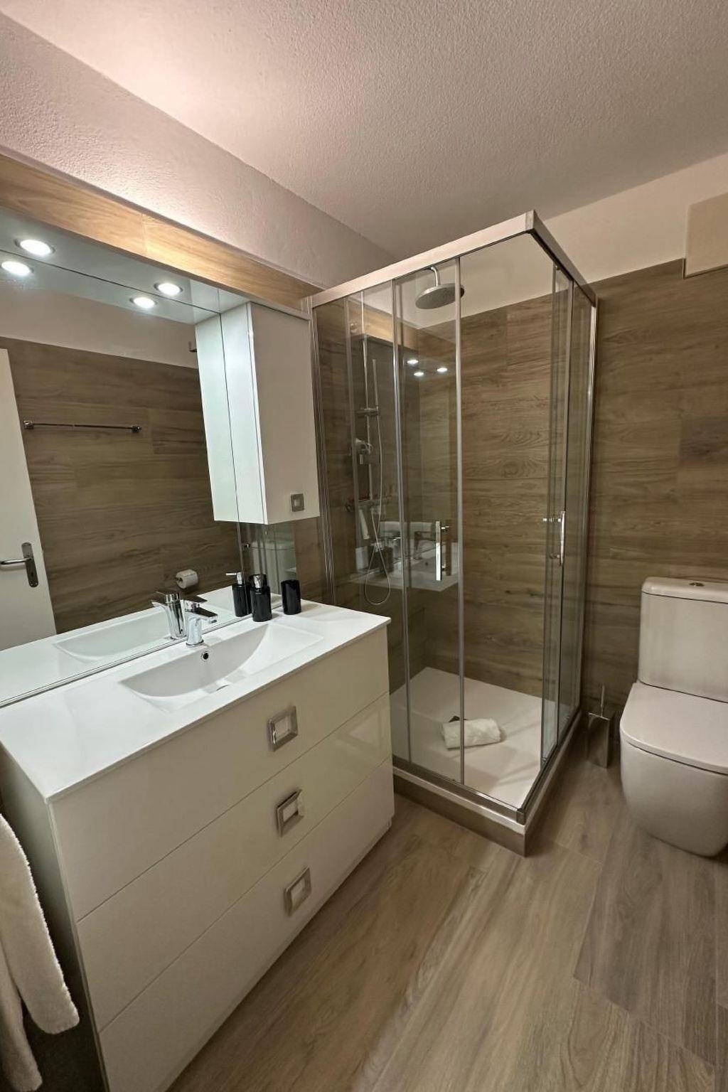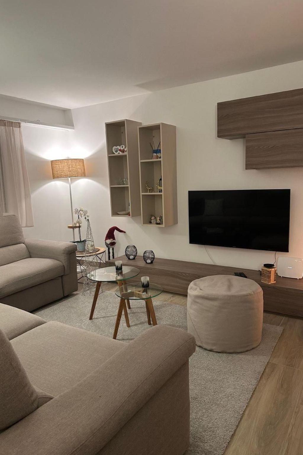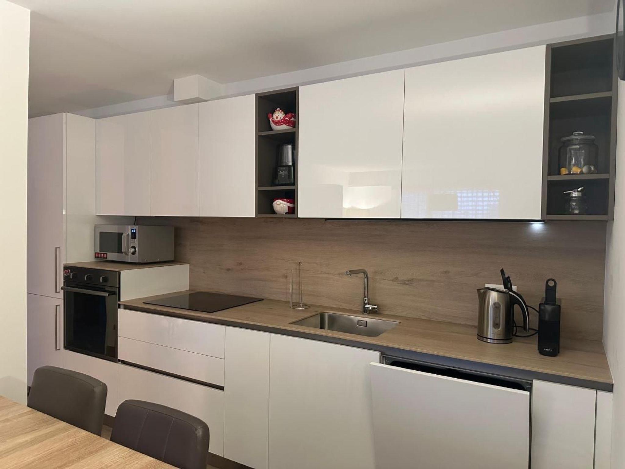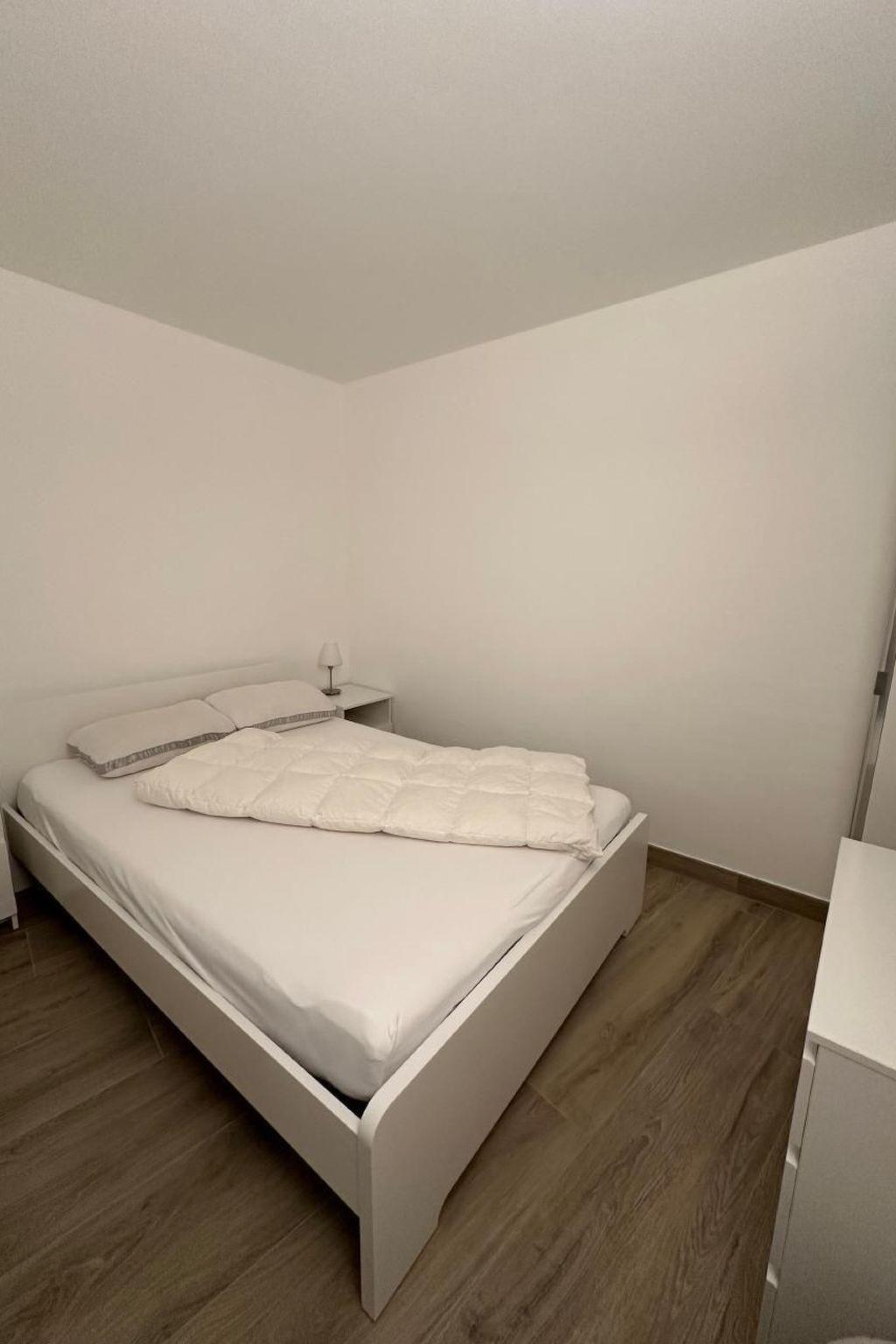 Inside, the flat is distinguished by its spacious layout, which includes two bedrooms: a master bedroom with a king-size bed, four-door wardrobe and chest of drawers, and a second bedroom with a 140x200-size bed, wardrobe and chest of drawers. The ambience is made even more cosy by a bathroom with a spacious shower, adjustable underfloor heating, and a living room equipped with a wall-mounted TV with Sunrise TV box to entertain you in your moments of relaxation. The open-plan kitchen is equipped with the latest appliances, including a microwave oven, kettle, Nespresso coffee machine, toaster and blender, inviting you to prepare delicious meals.