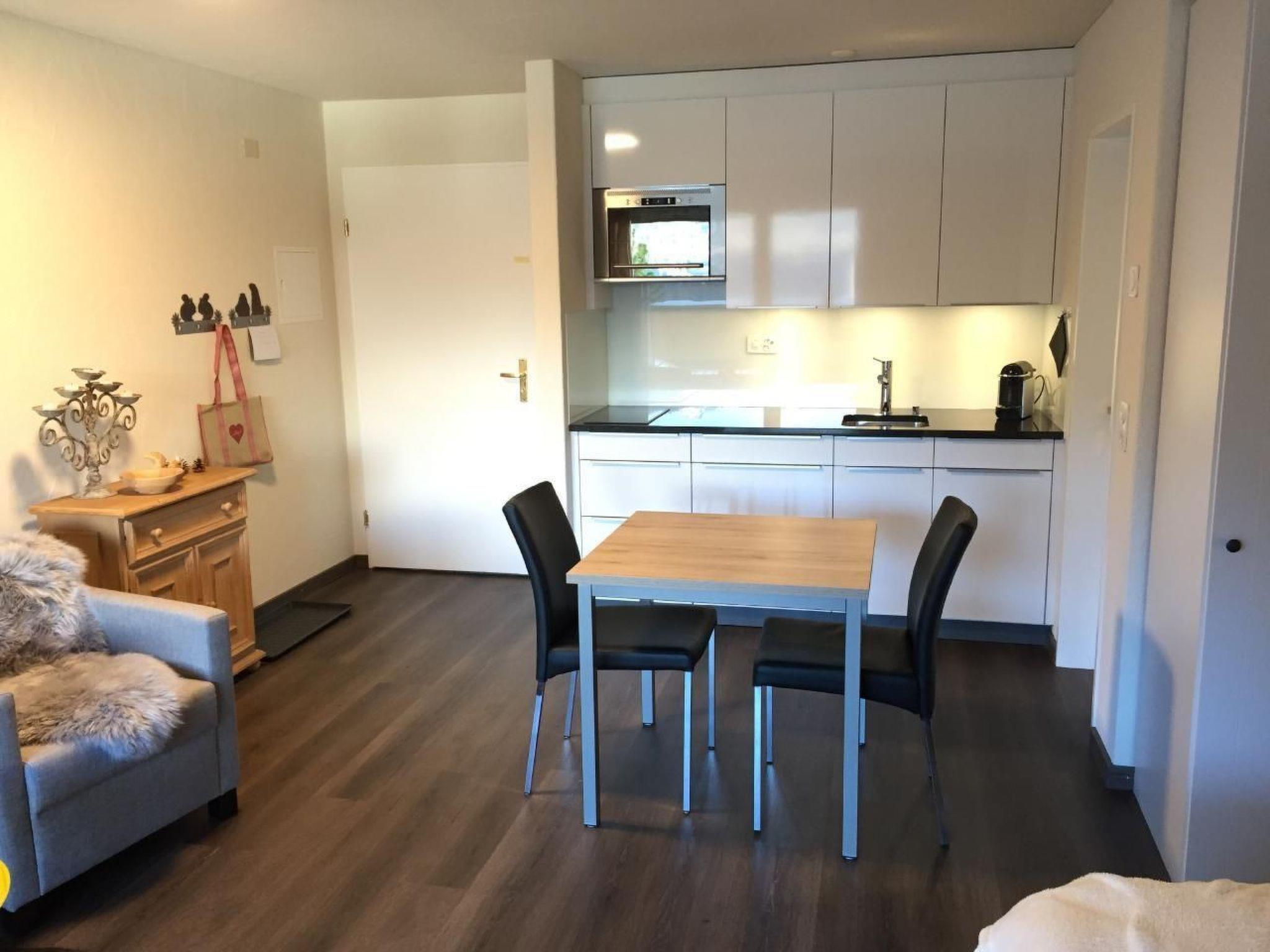The interior design emphasises comfort and modernity. The open-plan kitchen is equipped with a ceramic hob, dishwasher, microwave/grill combination appliance, a Nespresso machine and a fondue set, ideal for cosy evenings. In the living room/bedroom you will find a double bed with first-class mattresses that promise a restful night's sleep, as well as a flat-screen TV (32 inch) with Swisscom TV and WLAN for entertainment and information.