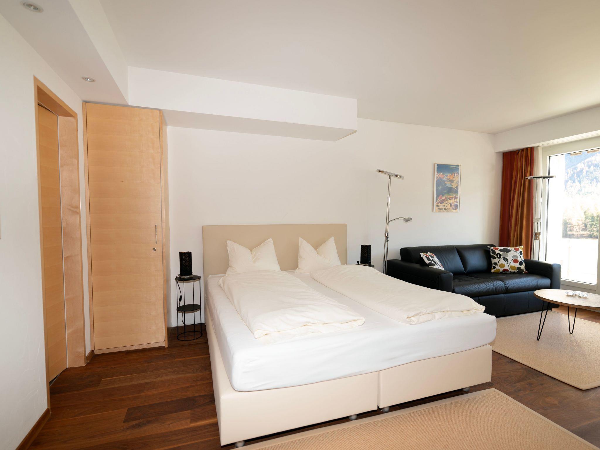 In the living room/bedroom there is a dining table with 4 chairs, a pull-out sofa, a double bed and a TV. A garage parking space belongs to the room.