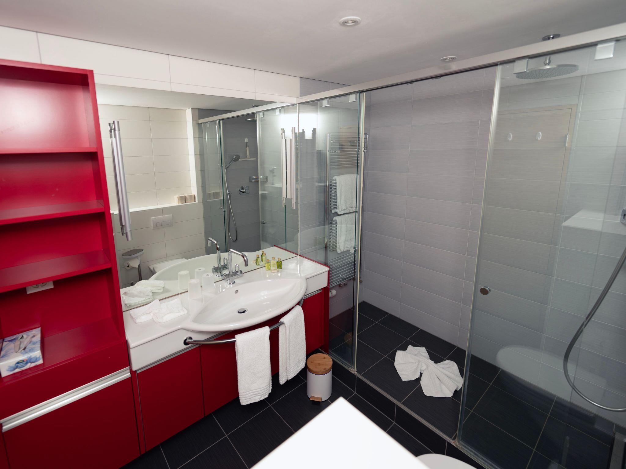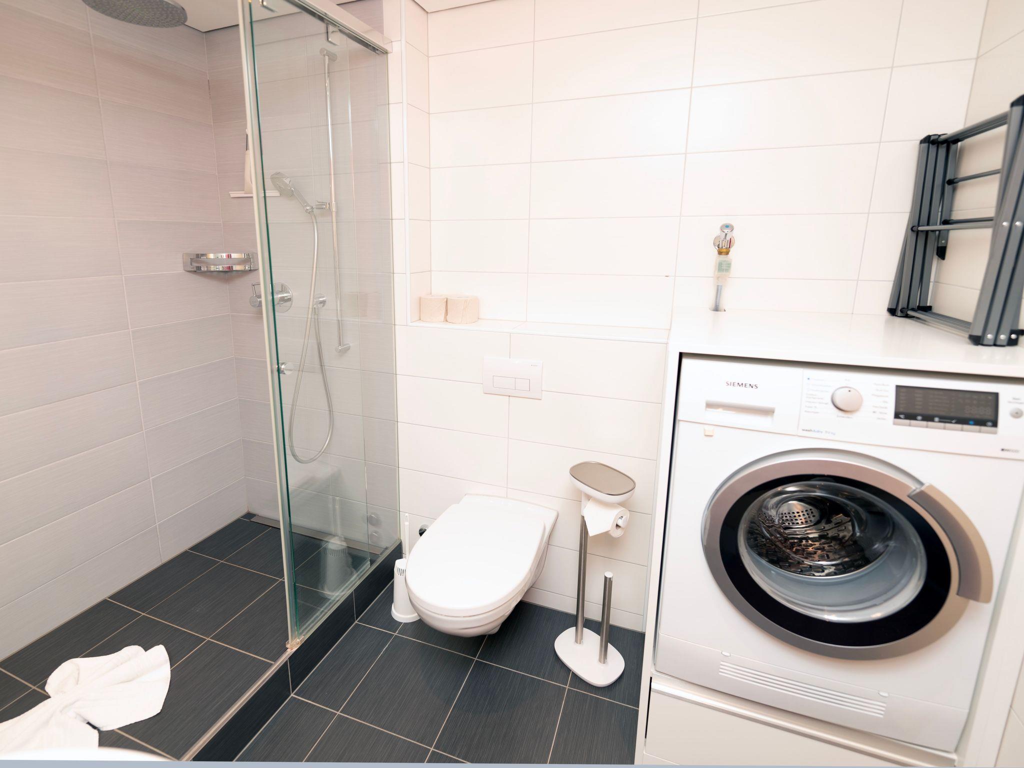 The bathroom is spacious and has a modern shower, washbasin, washing machine and WC.