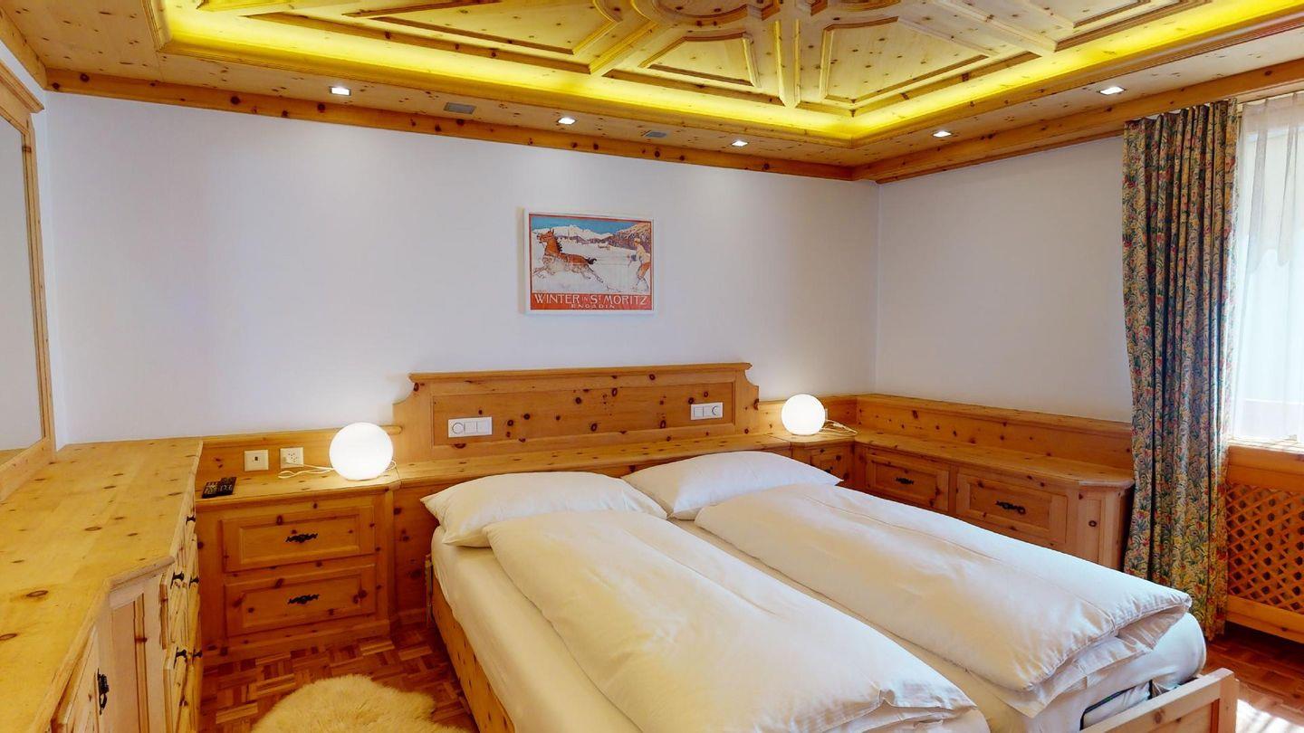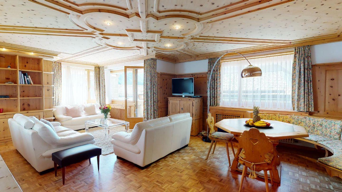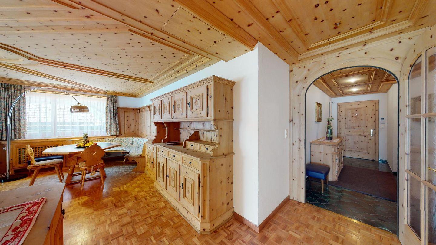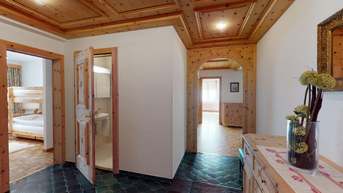 Geräumige mit gut riechendem Arvenholz ausgebaute 5-Zimmer Ferienwohnung im 1. Obergeschoss. Eingang mit generöser Garderobe und Gäste/WC. Wohnbereich mit Balkon Richtung Süden. Grosszügige Küche mit entsprechender Durchreiche ins Wohnzimmer. Elternschlafzimmer aus Arve. 1 Doppelschlafzimmer. 1 Bad/Dusche. 1 Schlafzimmer mit Etagenbetten und Dusche. 1 Einzelzimmer. Lift. Waschküche. 1 Garagenparkplatz im Parkhaus "Quadrellas" 4 Gehminuten entfernt von der Wohnung inklusive. Weitere Parkplätze gegen Gebühr möglich.