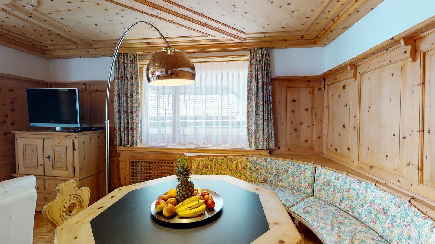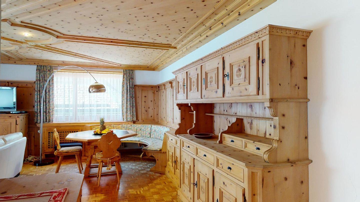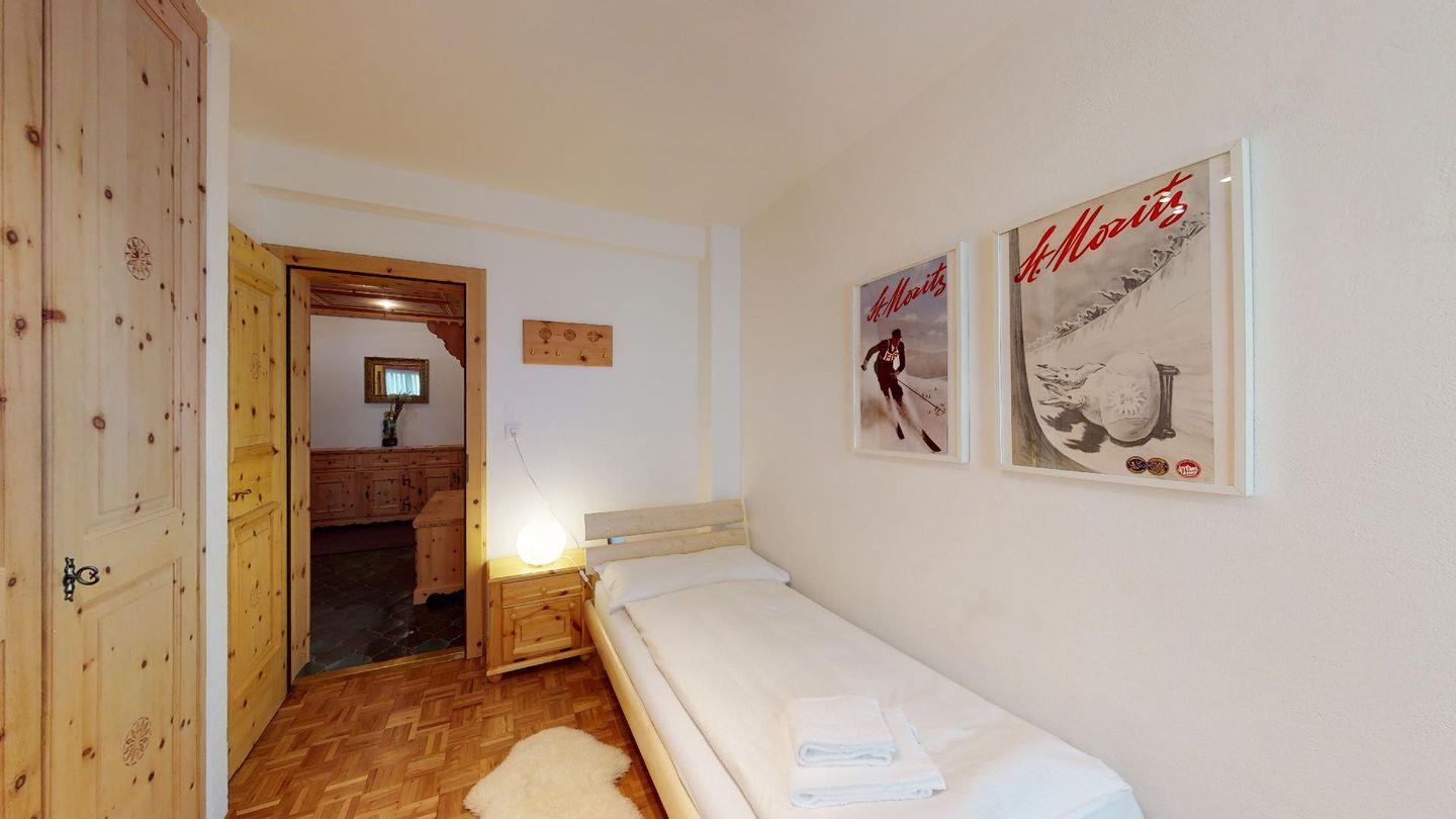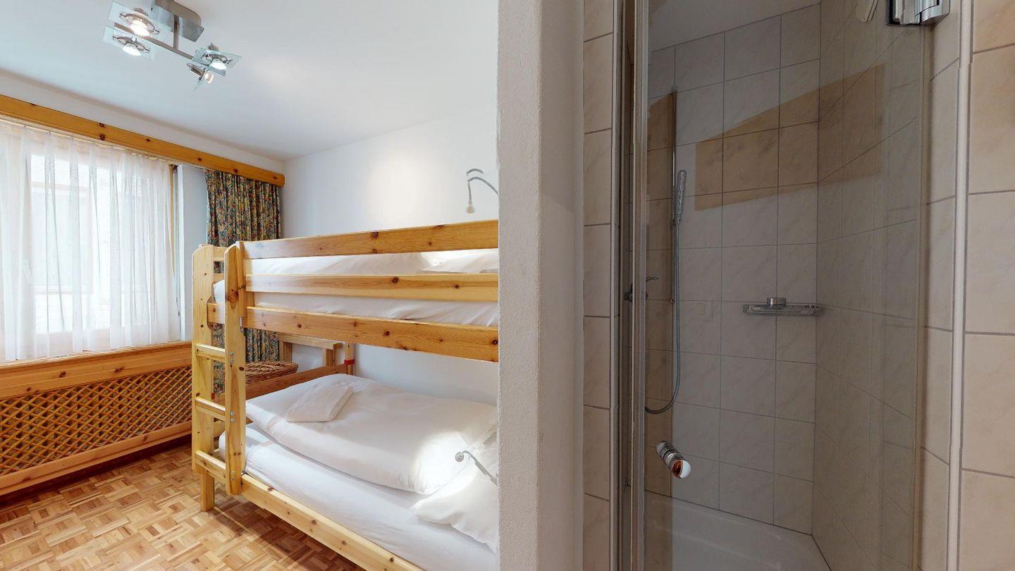 Geräumige mit gut riechendem Arvenholz ausgebaute 5-Zimmer Ferienwohnung im 1. Obergeschoss. Eingang mit generöser Garderobe und Gäste/WC. Wohnbereich mit Balkon Richtung Süden. Grosszügige Küche mit entsprechender Durchreiche ins Wohnzimmer. Elternschlafzimmer aus Arve. 1 Doppelschlafzimmer. 1 Bad/Dusche. 1 Schlafzimmer mit Etagenbetten und Dusche. 1 Einzelzimmer. Lift. Waschküche. 1 Garagenparkplatz im Parkhaus "Quadrellas" 4 Gehminuten entfernt von der Wohnung inklusive. Weitere Parkplätze gegen Gebühr möglich.