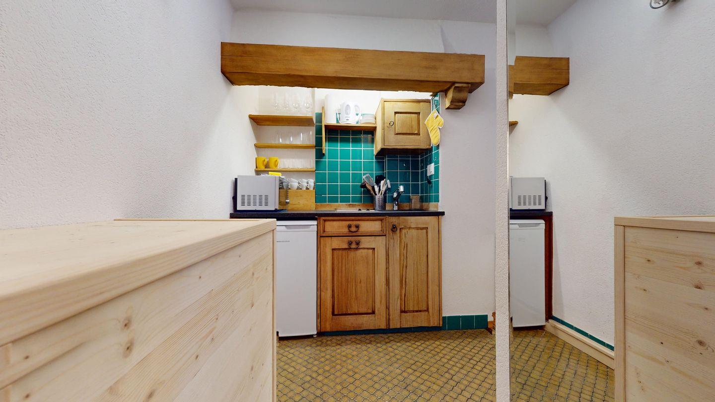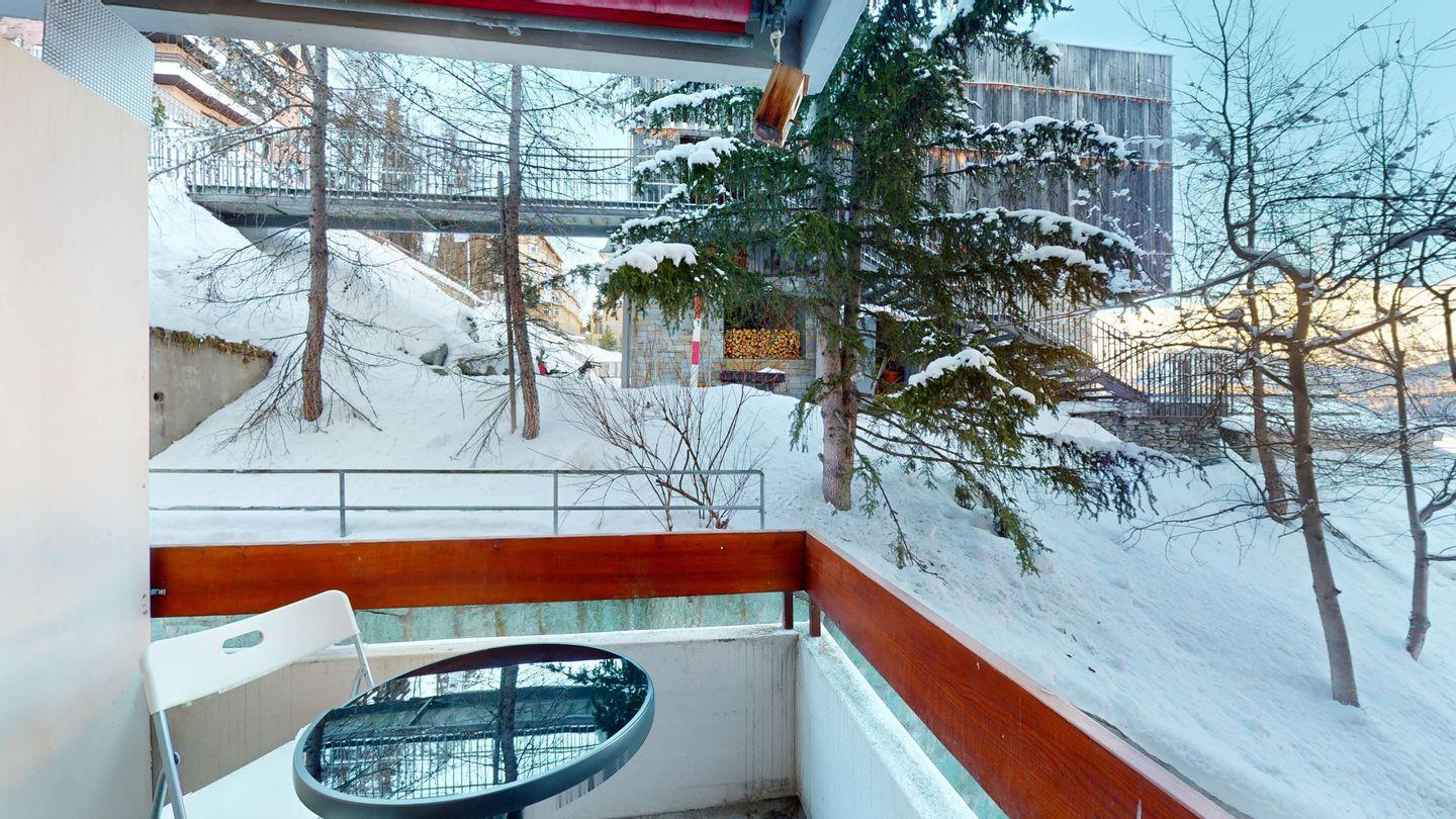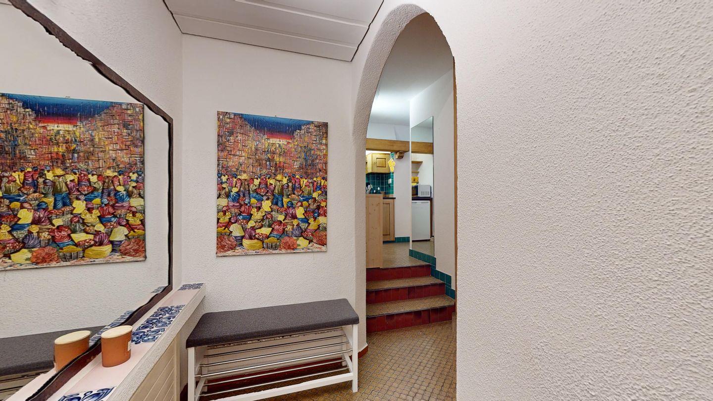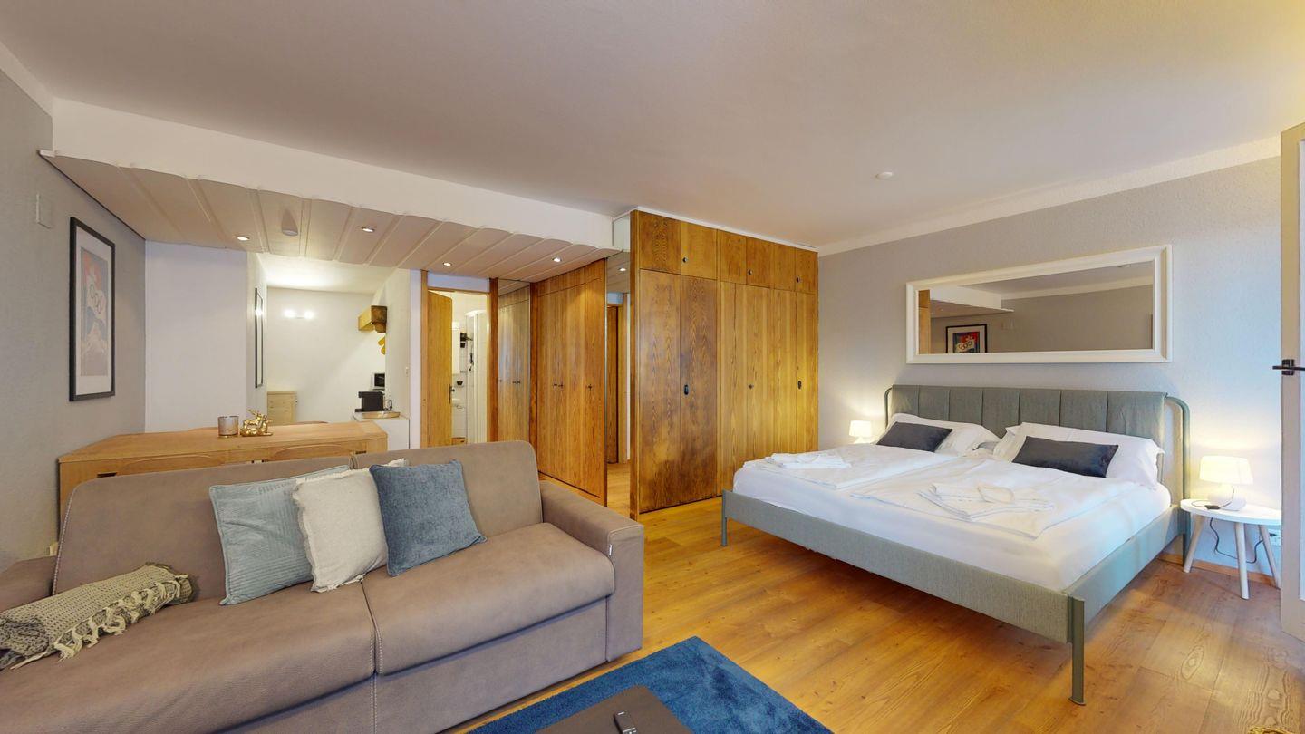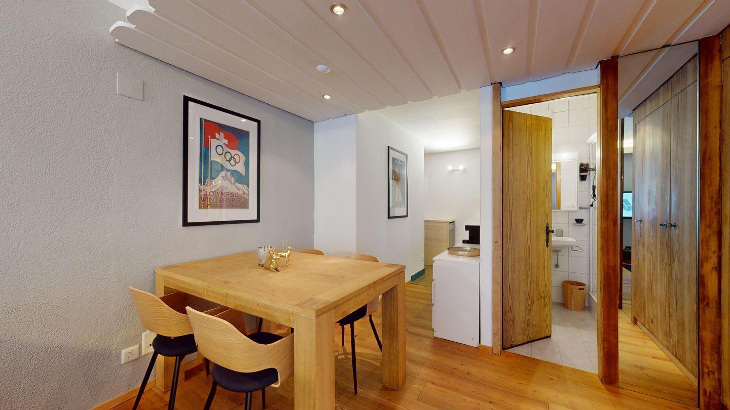 1-Zimmerwohnung im 3. Obergeschoss. Eingang mit Garderobe. Wohnzimmer mit Wohn- und Schlafbereich mit Ausgang auf den Balkon. Schlafecke mit Doppelbett (2 x 90cm x 200cm) und Verdunkelungsmöglichkeit. Offene Küchenzeile mit Herd (2 Platten), Geschirrspüler, Mikrowelle und Chicco d'Oro Kaffeemaschine. Esstisch für vier. Separates Badezimmer mit Dusche/WC/Lavabo. Nach Verfügbarkeit Aussenparkplatz (kann nicht reserviert werden). Haustiere sind nicht erlaubt. Gemeinschaftliche Waschküche. Skiraum in der Wohnung. Kein Veloraum.