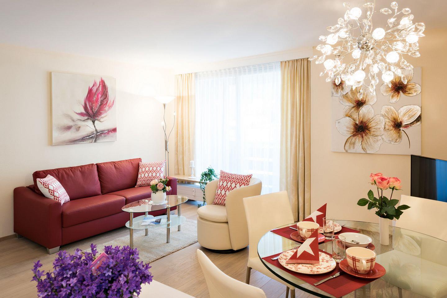Attraktive 2-Zimmer-Wohnung für 2 bis 4 Personen. Schlafzimmer, Sofabett im Wohnzimmer, moderne Küche, schönes Bad, Balkon. Hochwertiger Parkettboden, geschmackvolle Möbel. Lift und Hallenbad im Gebäude.