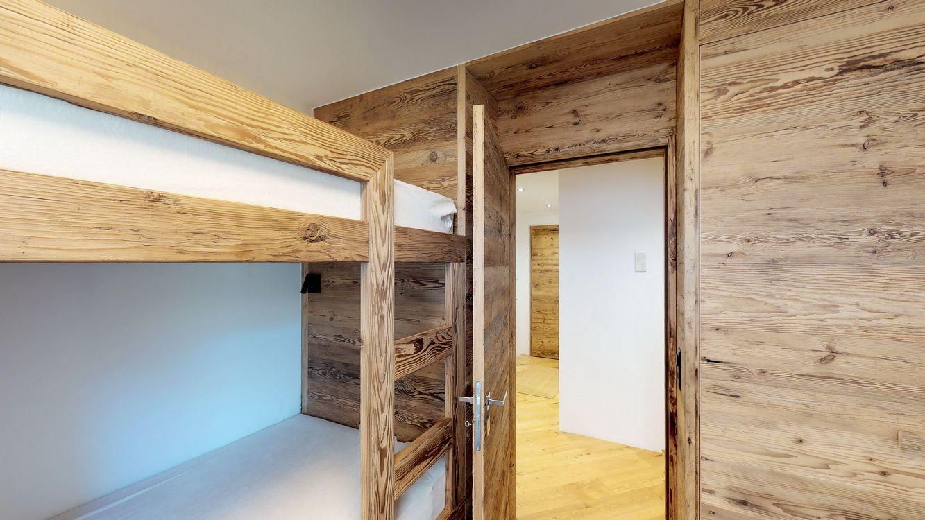 Die Ferienwohnung zeichnet sich durch eine gelungene Mischung von modernen Materialien und Geräten sowie alpinem Stil aus. Das Wohnzimmer verfügt über eine offene und komplett ausgestattete Küche sowie einem Sofa- und TV-Bereich. Von dort hat man direkten Zugang zum Balkon mit Aussicht. Das Master-Schlafzimmer ist mit einem Doppelbett und einem En-Suite Badezimmer mit Dusche ausgestattet. Ein weiteres Schlafzimmer mit Doppelbett sowie ein Kinderzimmer mit Etagenbetten (2 Betten) teilen sich ein Badezimmer mit einer Badewanne. Weiter hat es ein Gäste-WC. Das Master-Schlafzimmer sowie das weitere Doppelschlafzimmer haben jeweils einen Balkon. Ein reservierter Garagenparkplatz steht zur Verfügung. Ebenso gibt es eine Gemeinschaftswaschküche.